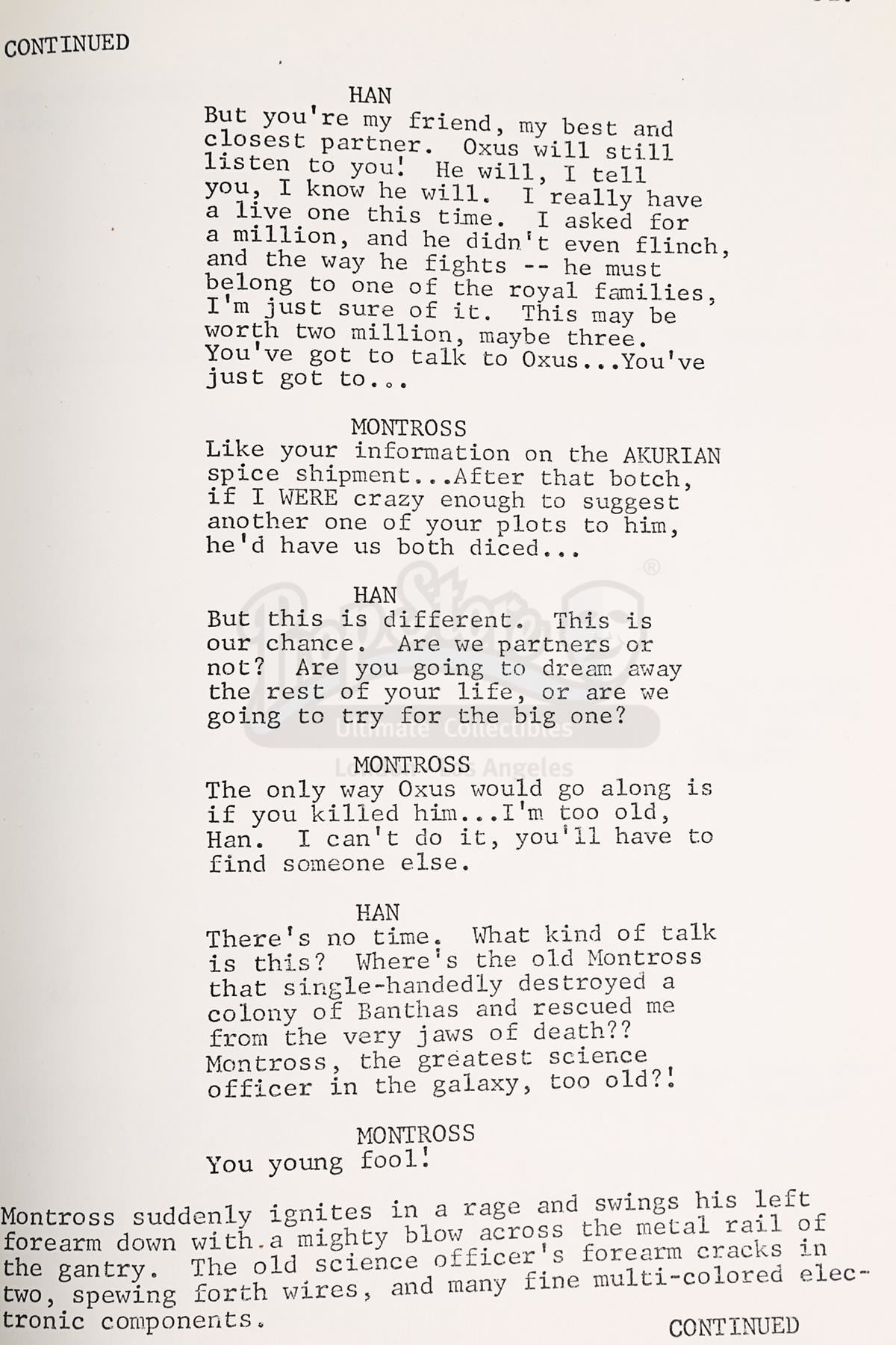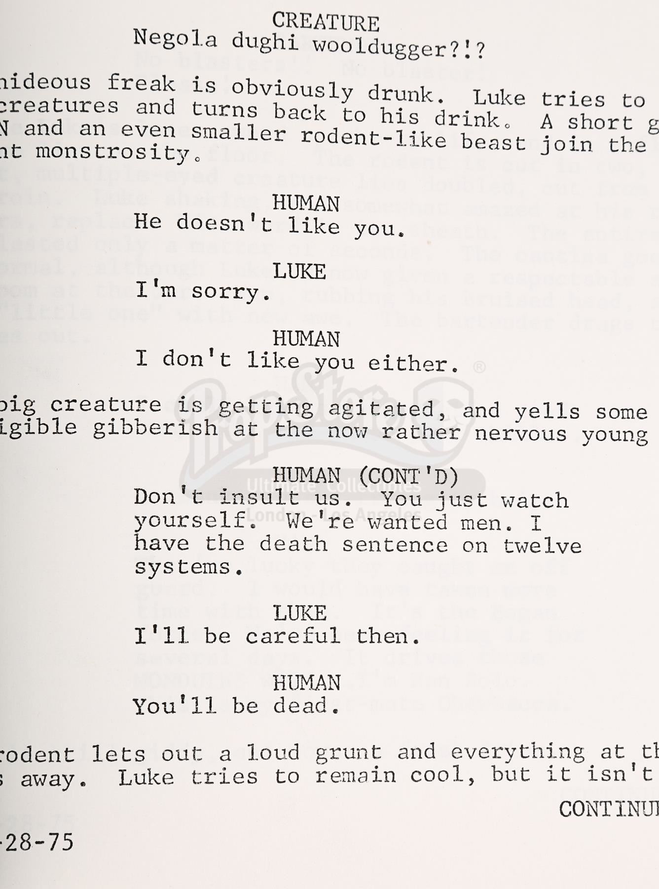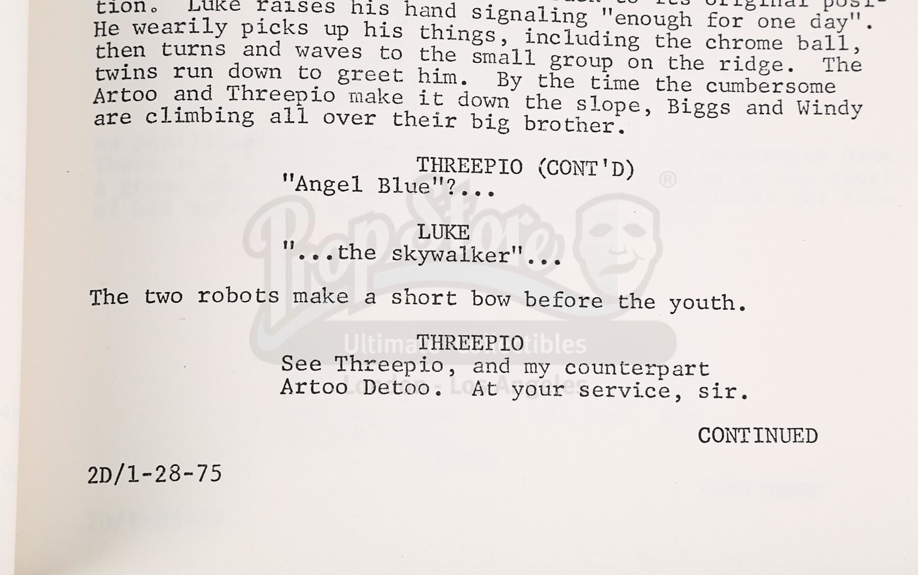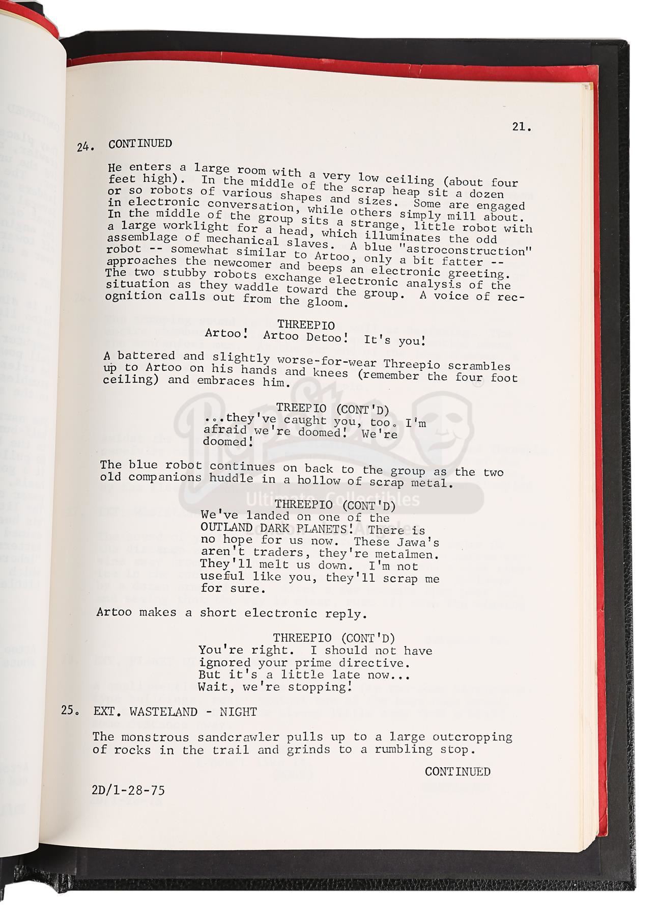 A second draft Adventures of the Starkiller script from George Lucas' Star Wars: A New Hope. This version of the script was originally issued to concept artist Colin Cantwell who designed several vehicles and ships. Bound within a leather springback binder, the script displays a red card cover which bears the original title "The Adventures of The Starkiller," as taken from the "Journal of the Whills'' in goldtone foil and a printed design by artist Esteban Maroto that was originally done for a 1972 Flash Gordon tribute. The art was placed on the cover of this early script to provide tone for the reader. "#4" is handwritten in the top right corner of the title page and a small piece of paper displays handwritten text including the production title, the date, an address for LucasFilm Limited and "copy #4." Very few copies of the second draft script are believed to have been issued. Dated January 28, 1975, the script consists of 115 single-sided printed pages on white U.S. letter size paper. The card cover displays small tears and creases from use, and there is minor discoloration present around the edges of some pages.