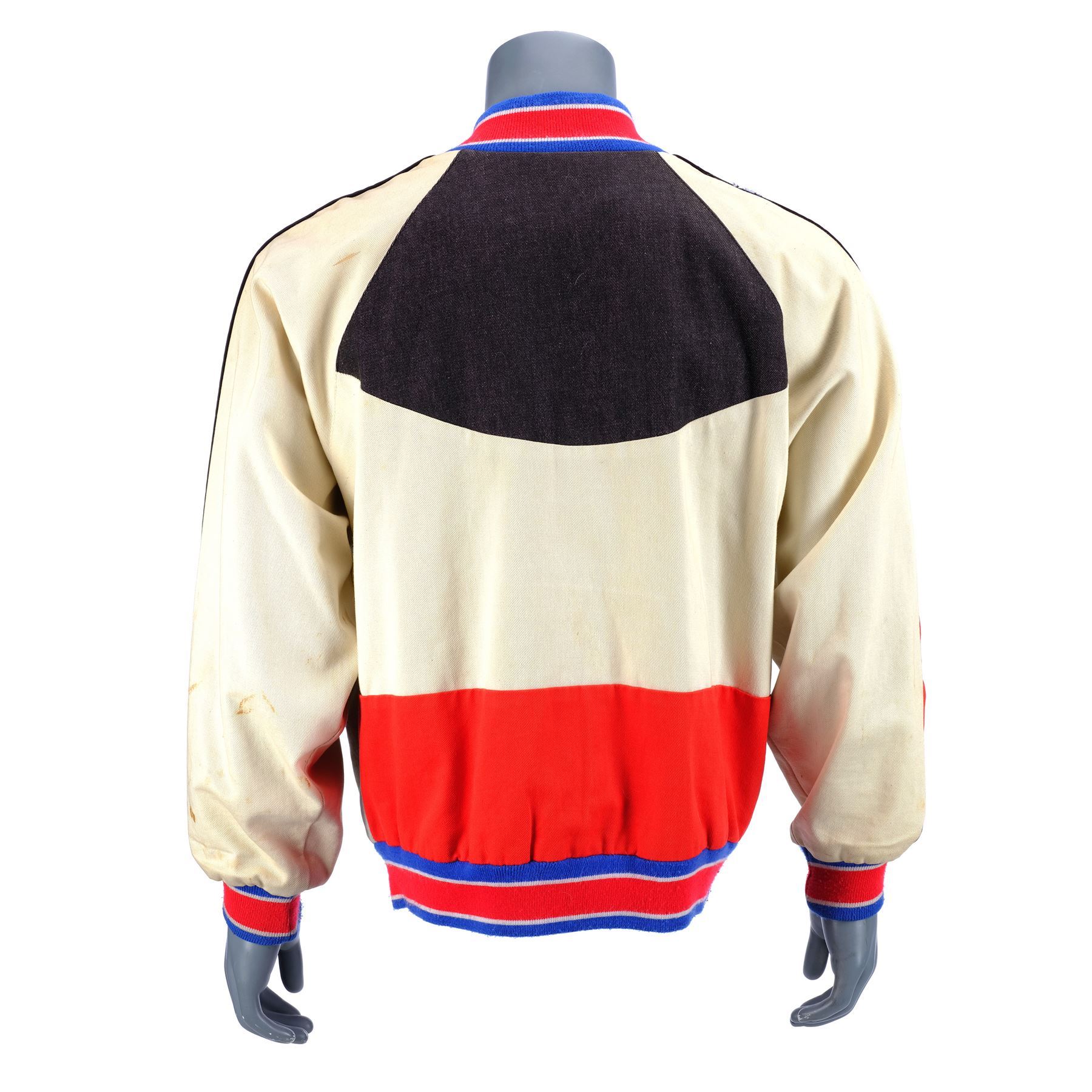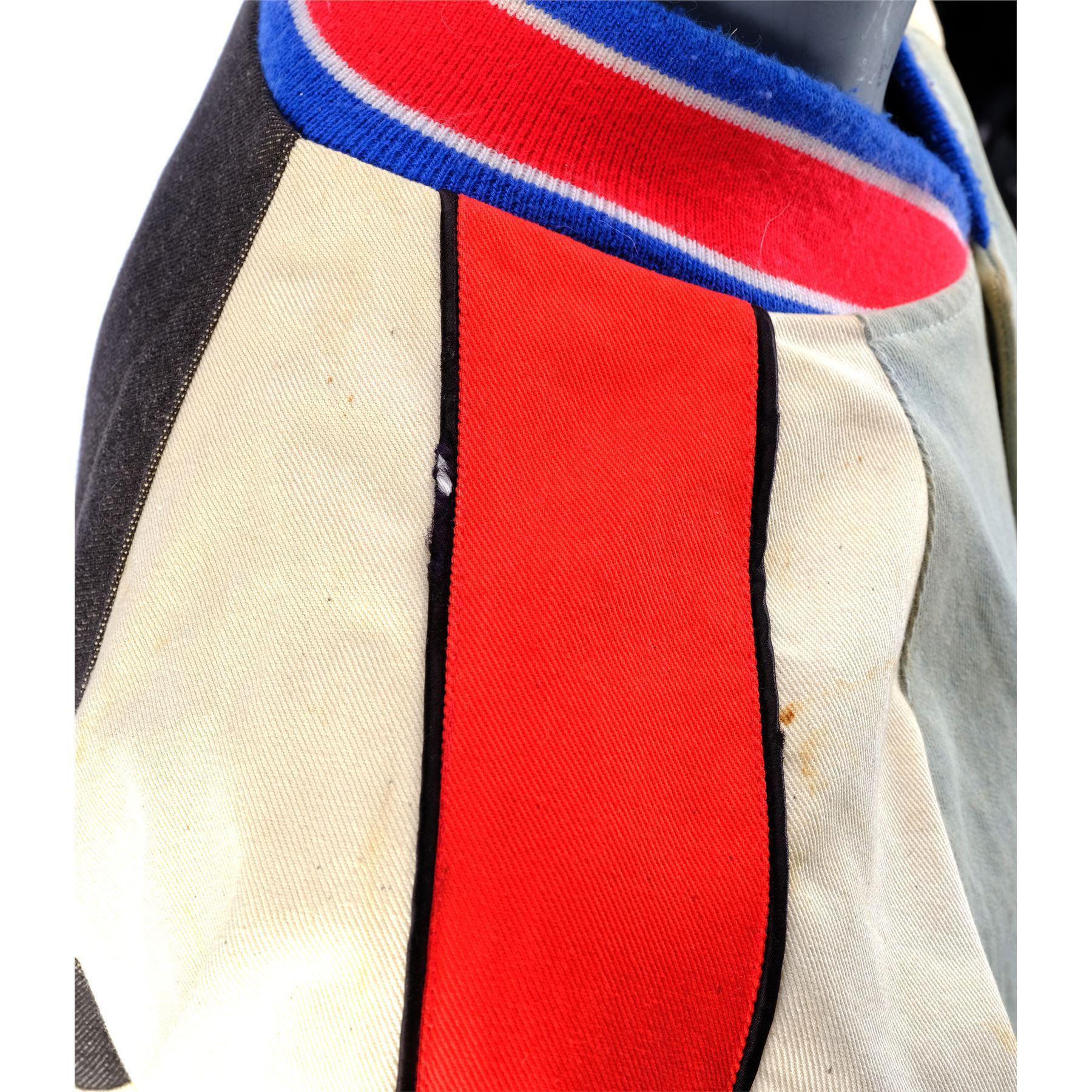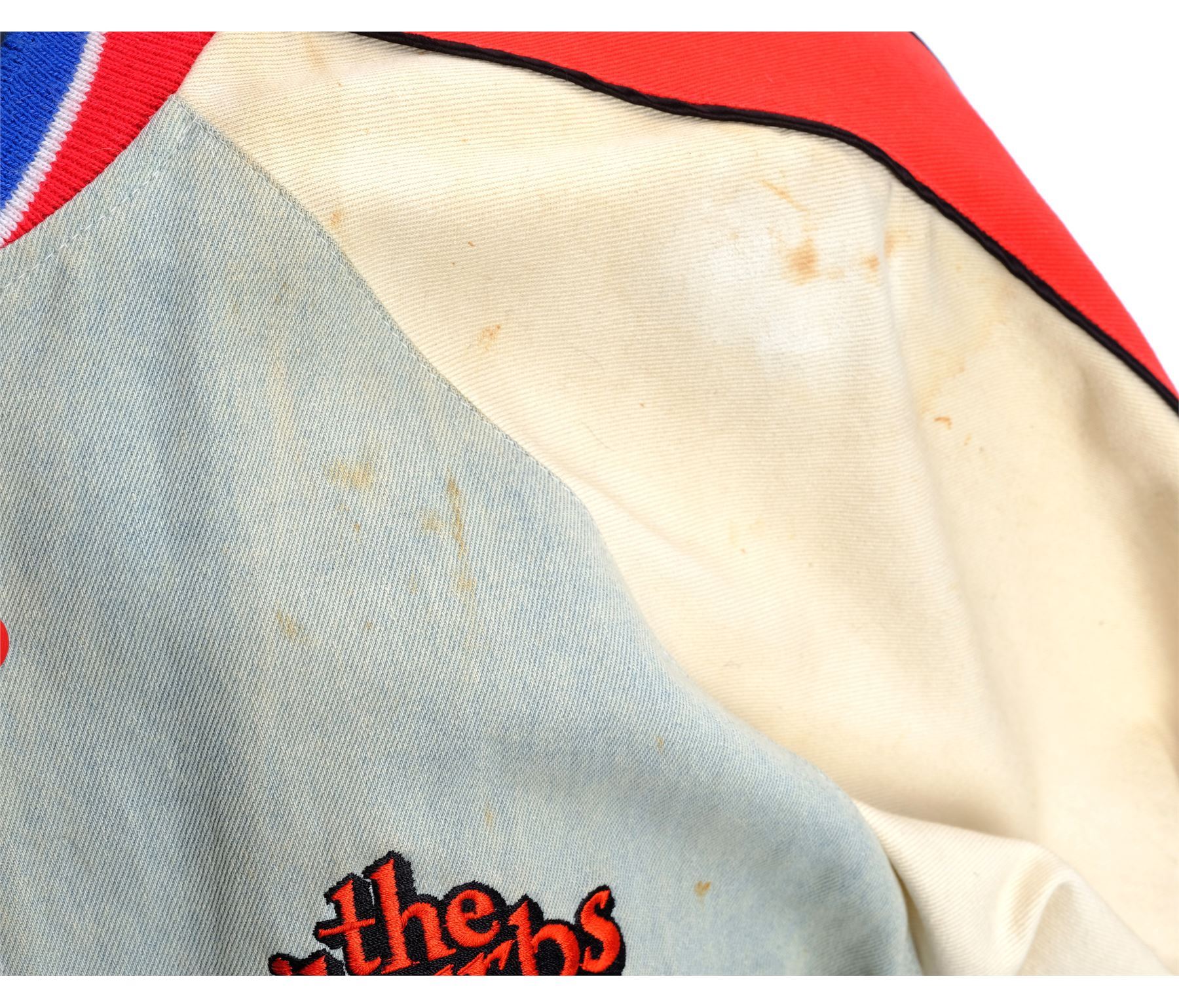 This red, white, and blue bomber jacket (size M) is hand-marked "Dick Miller" on the interior and embroidered "The Burbs" on the front left chest. It features two front pockets, red metal snap buttons, and an elastic collar, sleeves, and hem. The jacket exhibits various signs of wear, including staining throughout and pilling to the elastic, but retains its vintage coloration.