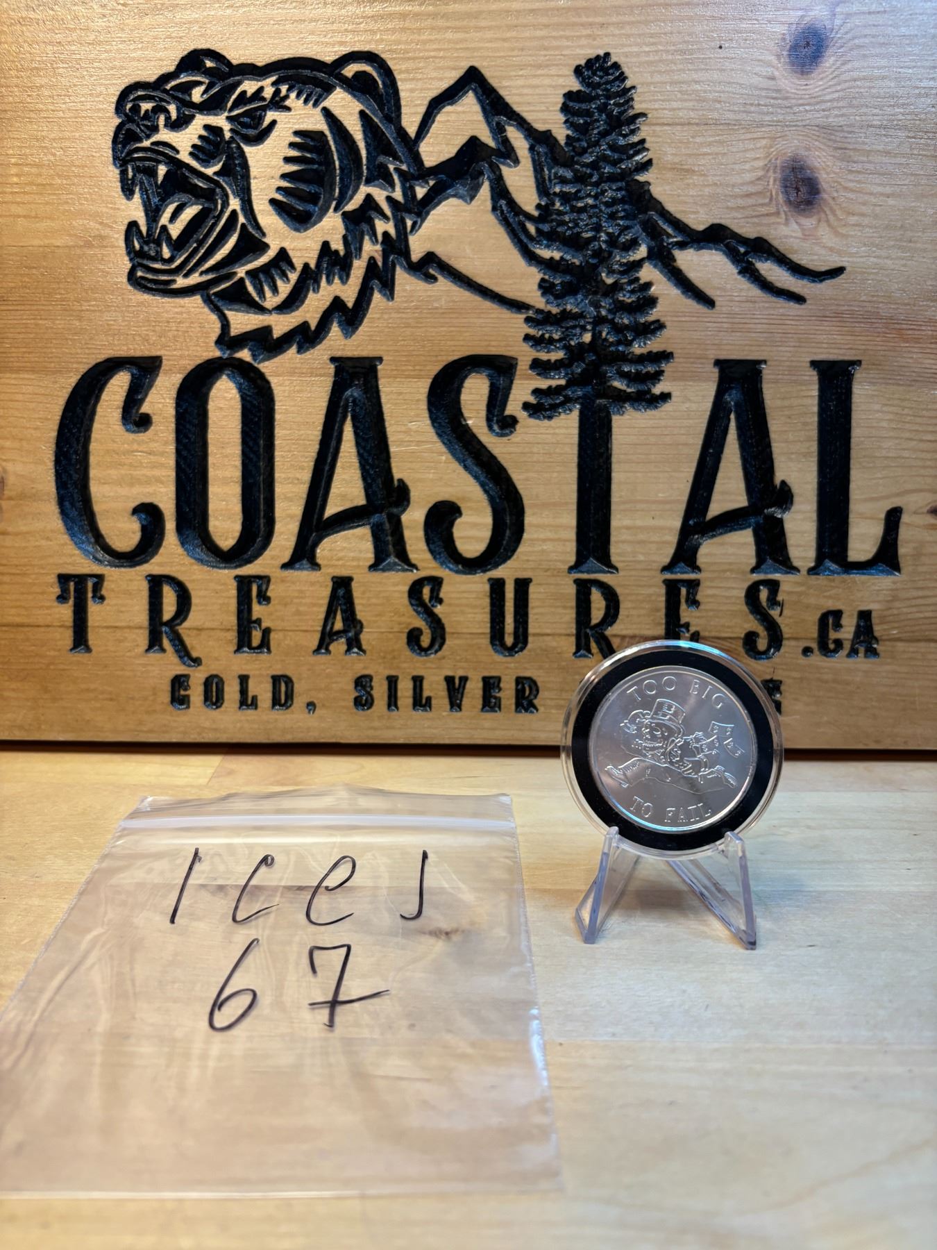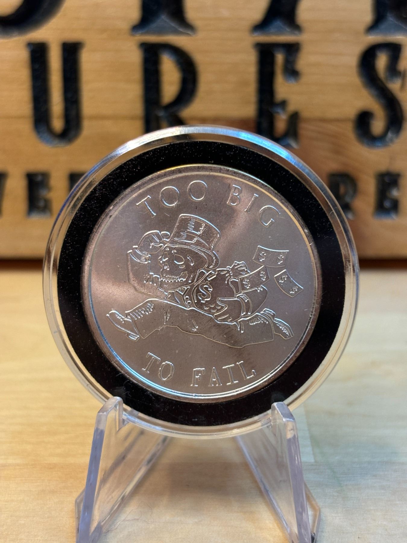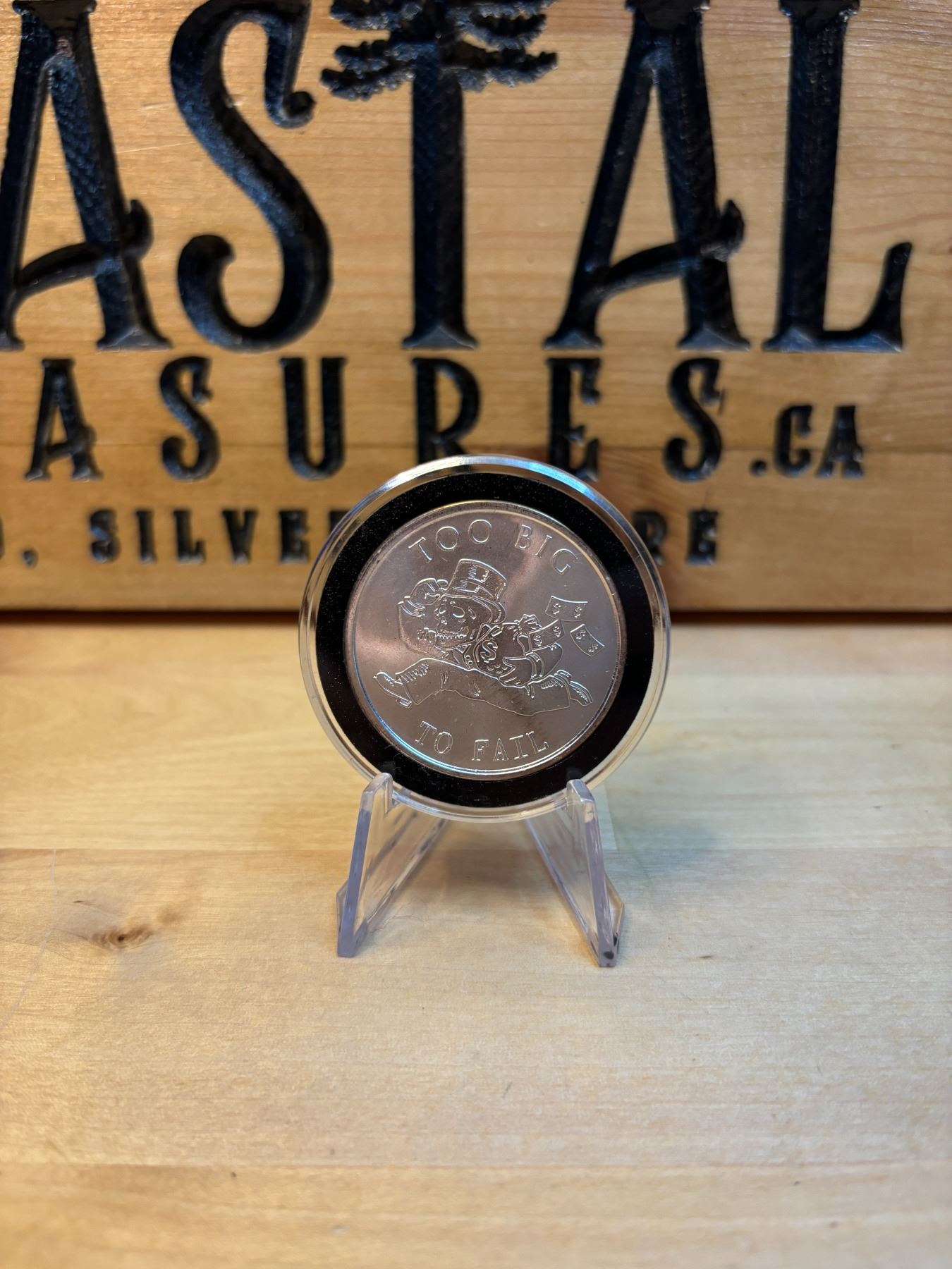 The 1 oz Too Big To Fail Silver Round is a 1-ounce silver round made from 99.9% pure silver. It features a design inspired by the financial crisis and the concept of "too big to fail," a phrase used to describe major financial institutions that are considered so large and interconnected that their failure could harm the broader economy. The round typically includes imagery related to banks, the economy, or symbols of financial power, often with a provocative or thought-provoking message. It's popular among collectors who are interested in economics or want to commemorate this significant phrase in financial history, valued for both its silver content and its symbolic design.