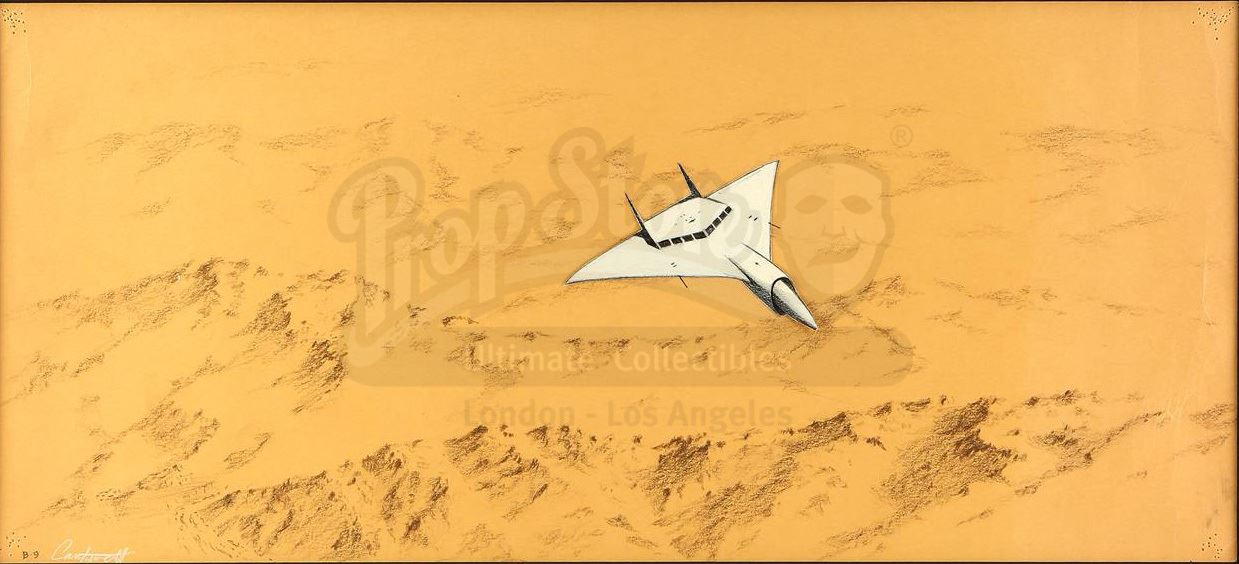 This early mixed-media concept collage was one of the first pieces of concept art done for Star Wars, and features a ship penciled in white and black graphite on illustration paper and applied to a hand-painted beige desert background marked "B-9" and signed by Cantwell. The piece is mounted behind glass in a black polished wooden frame. It is in excellent overall condition with some pinholes in the corners.