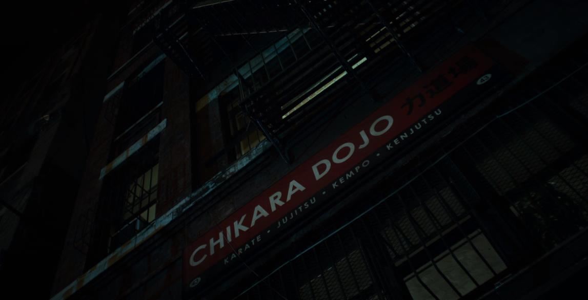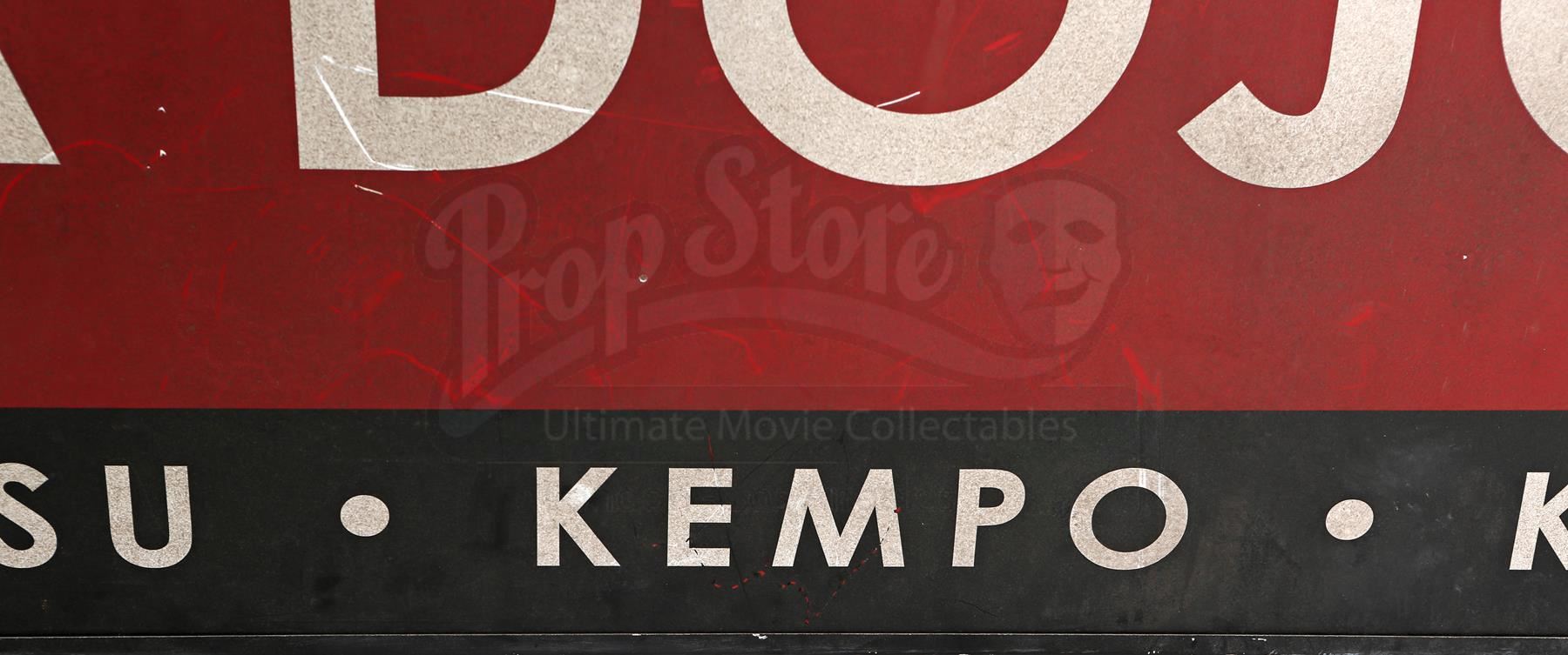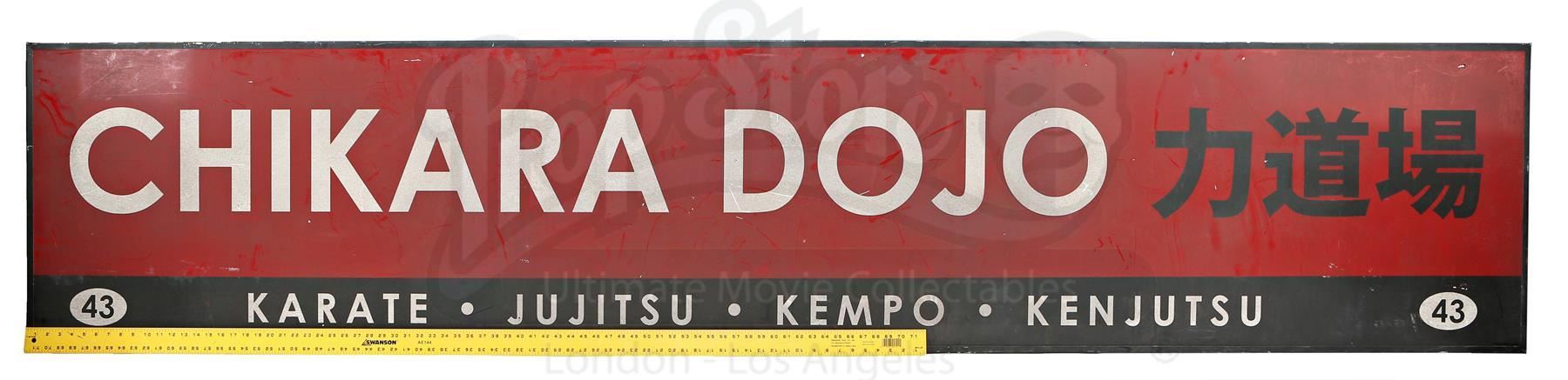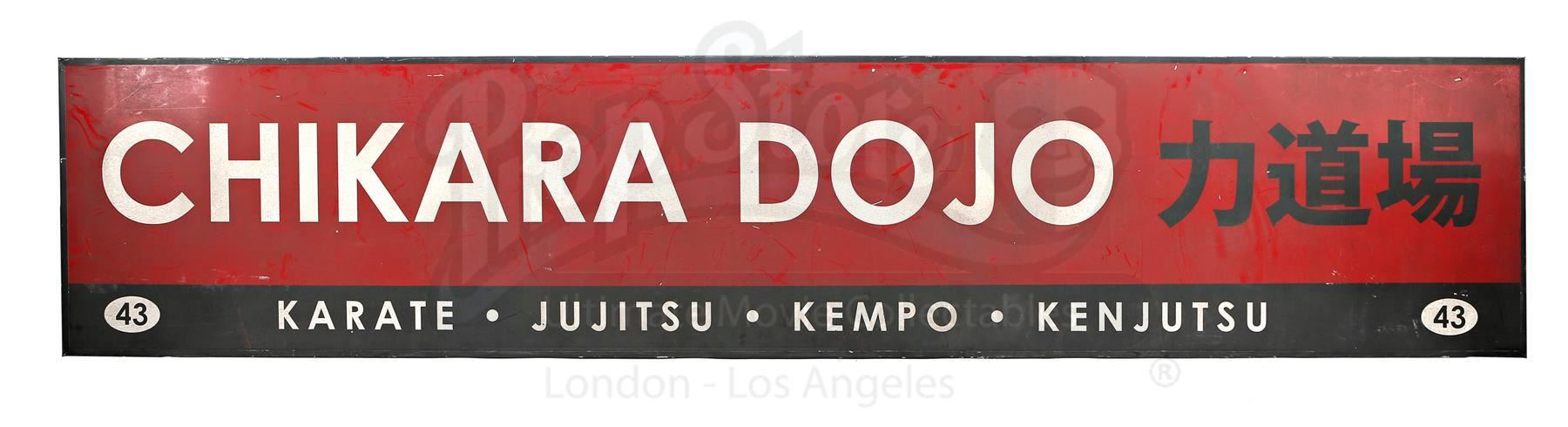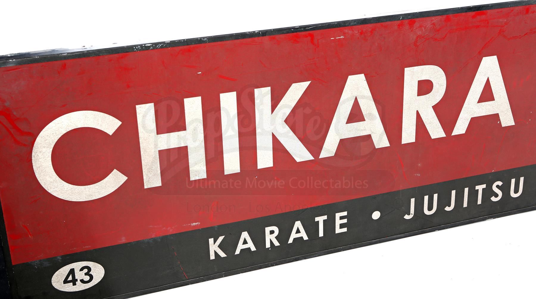 Chikara Dojo sign from Seasons 1 and 2 of Marvel’s Iron Fist. The sign hangs outside of the Chikara Dojo, where Colleen Wing trains students in martial arts and later where she and Danny Rand live together, throughout the series. This lot consists of a large red and black plastic sign with white lettering and a black metal frame. The sign is in good overall condition, with visible wear (such as minor scrapes and weathering) from production.