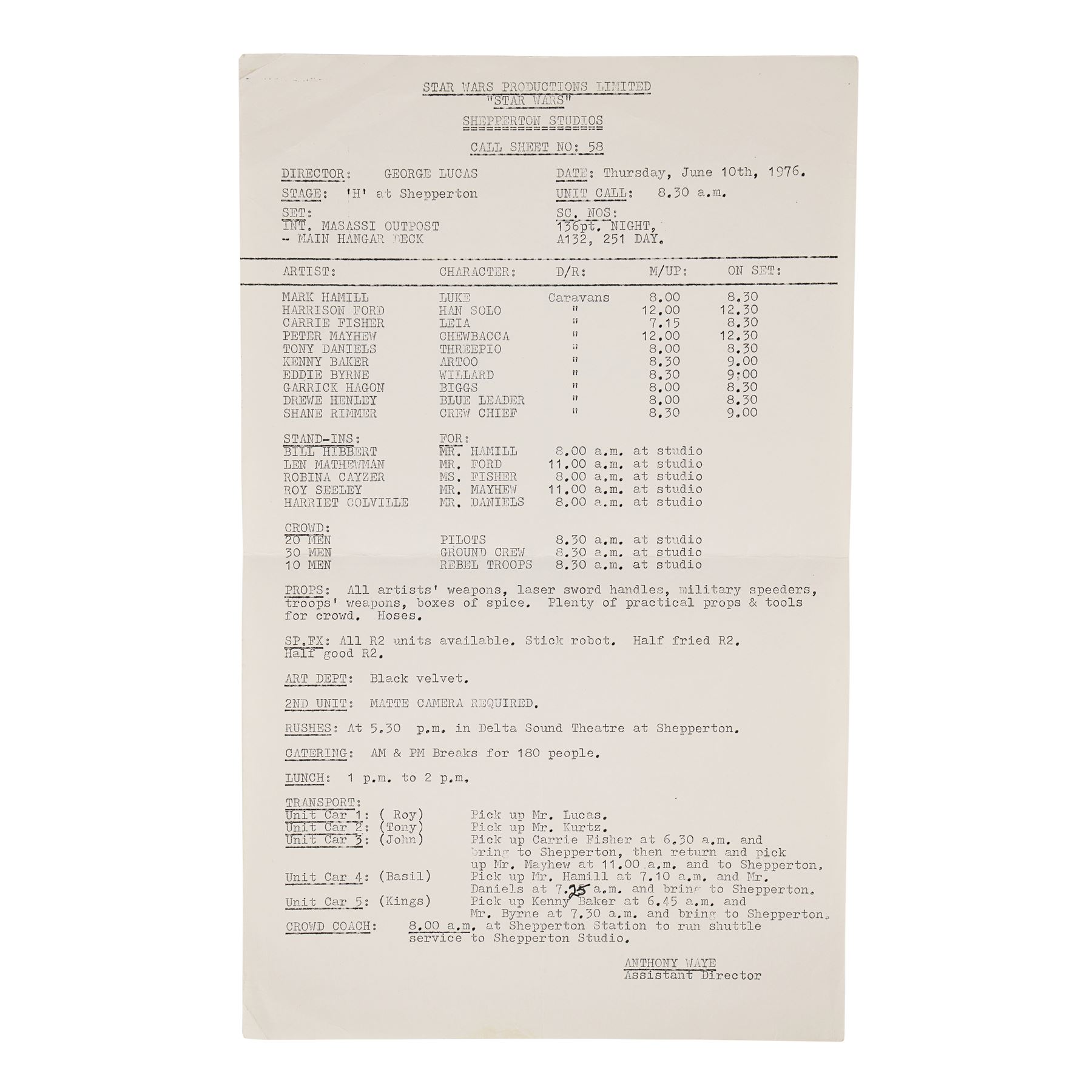 A call sheet from the production of George Lucas' Star Wars: A New Hope.