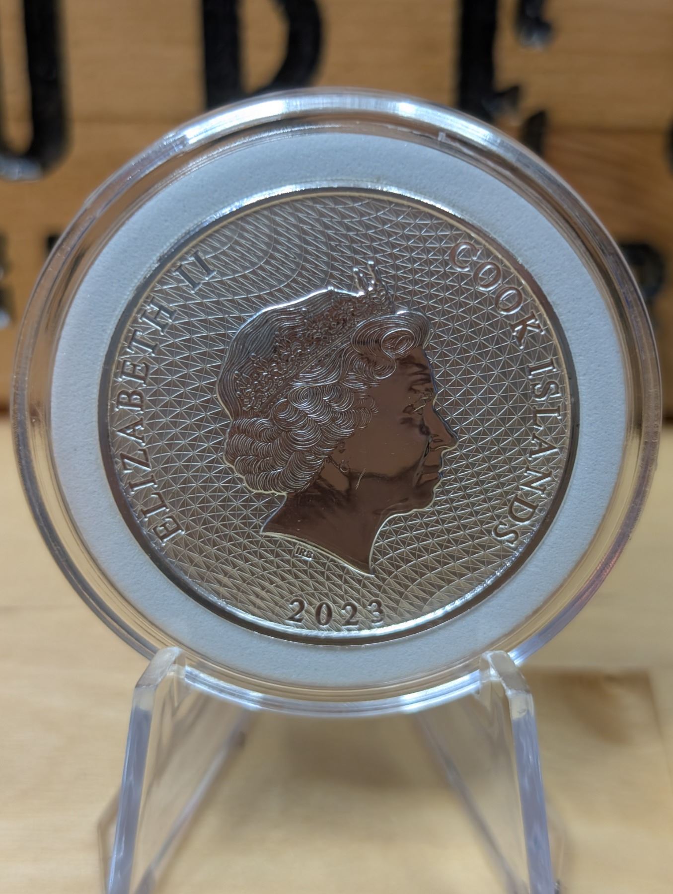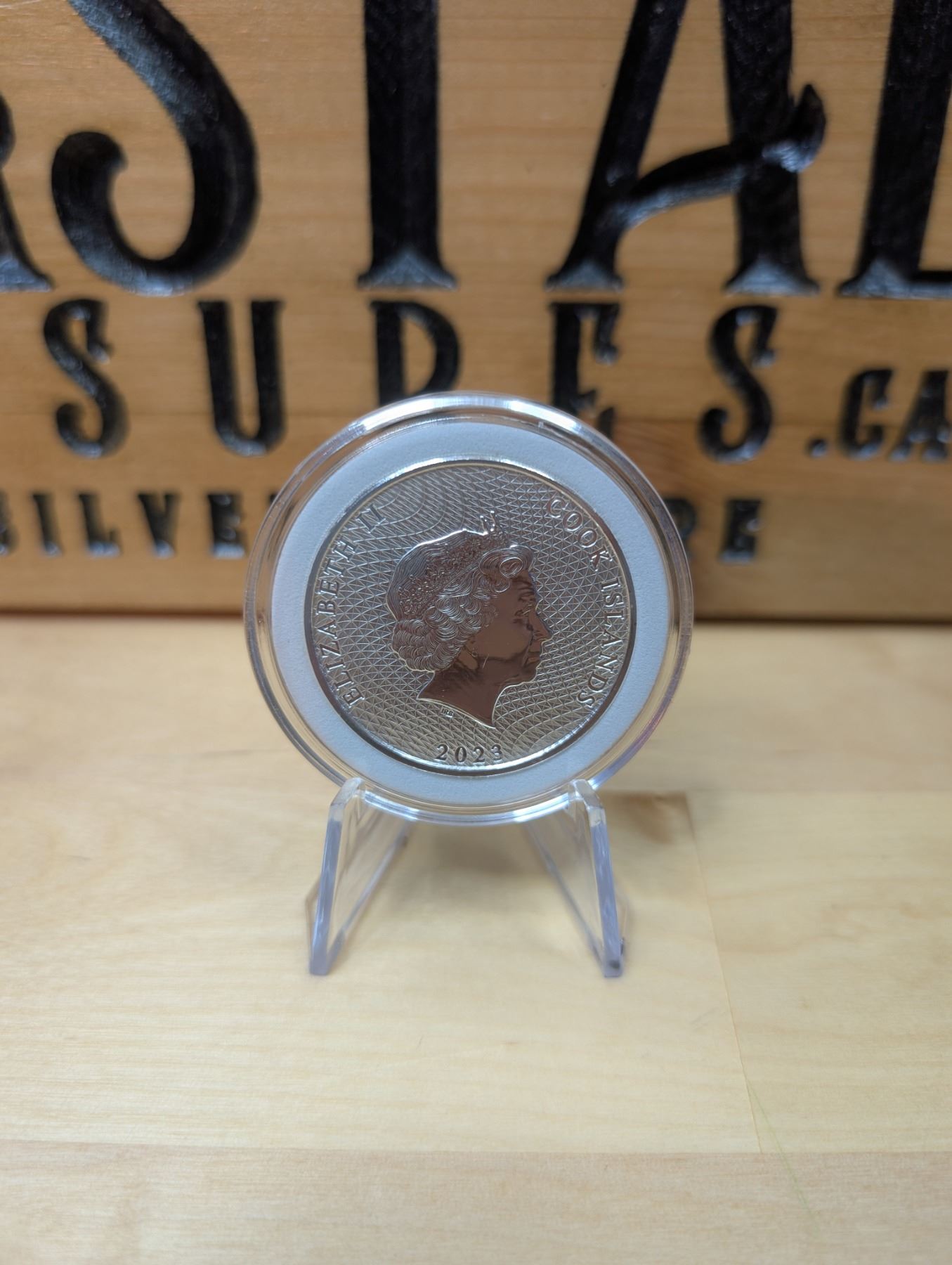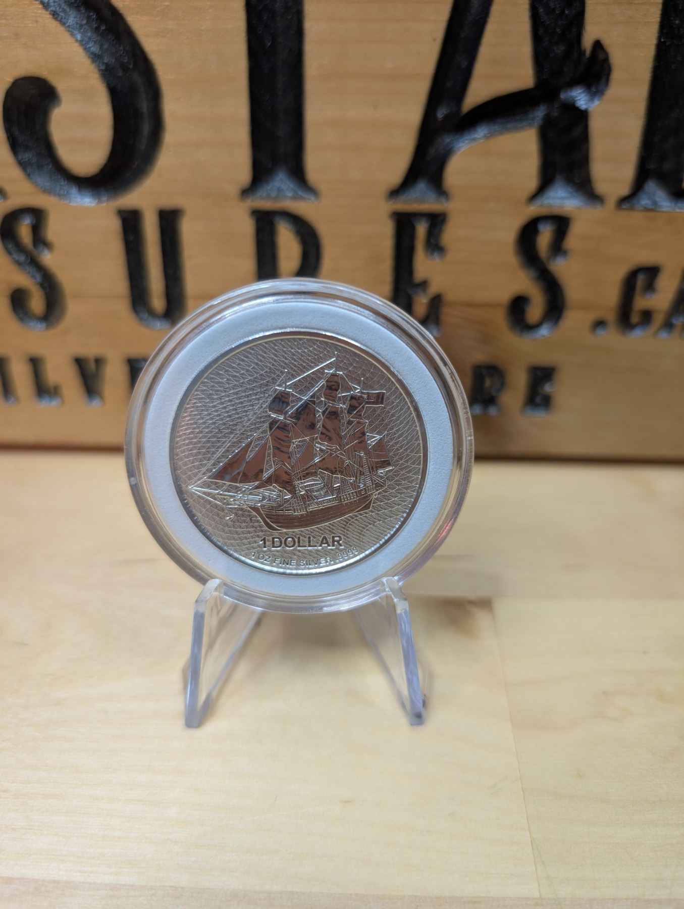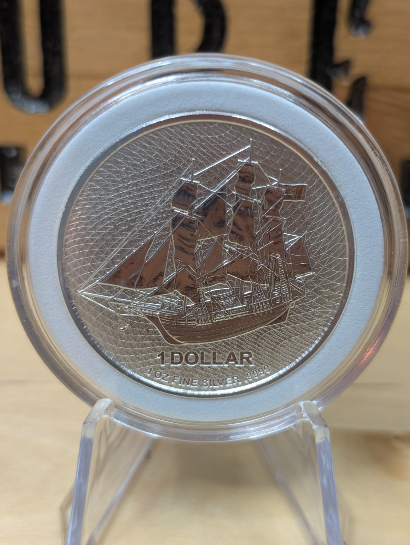 The 1 oz Cook Island Bounty Ship Silver Coin is a bullion coin made of 99.9% pure silver. It features a detailed image of the HMAV Bounty, a famous British ship, on the reverse. The coin's design typically includes the ship in full sail, along with a depiction of the Cook Islands' coat of arms and the year of issue. The obverse usually features the effigy of Queen Elizabeth II. This coin is popular among collectors for its historical theme and fine silver content.