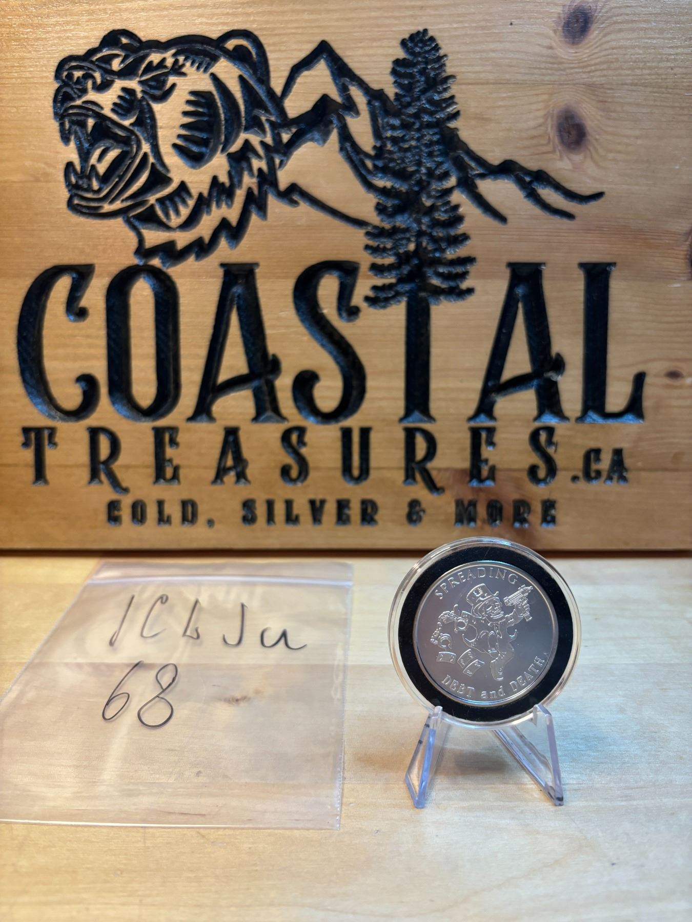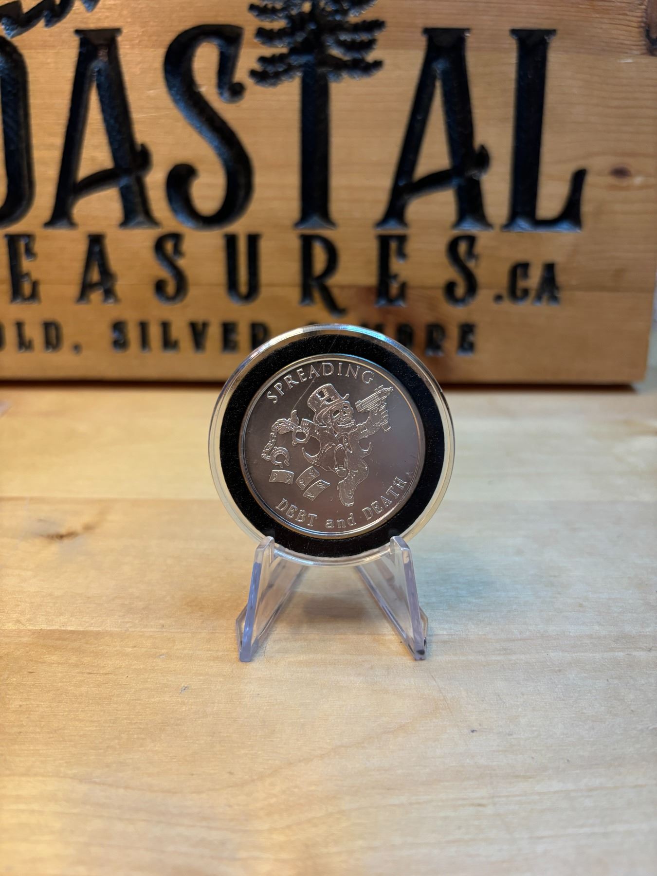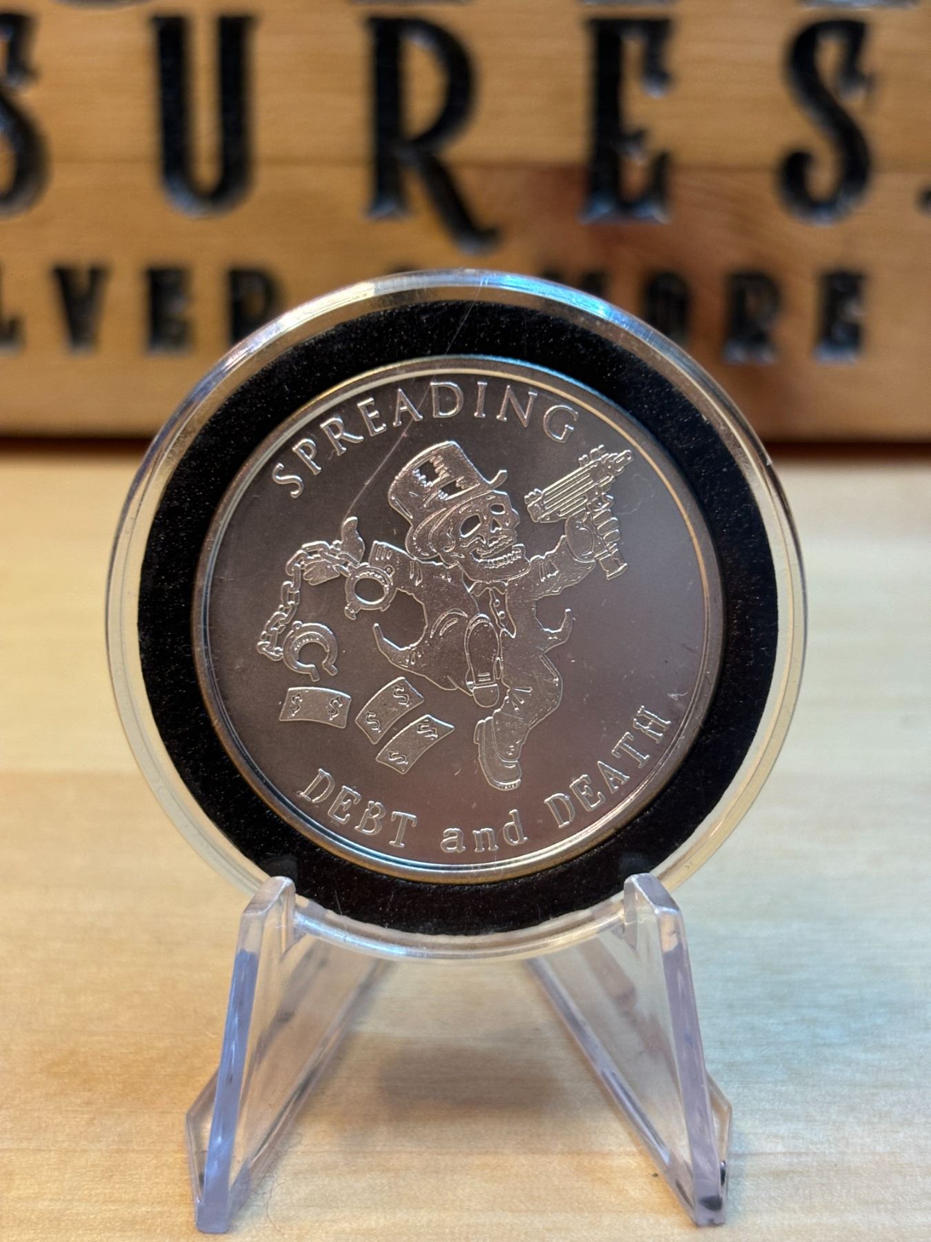 The 1 oz Spreading Debt and Death Silver Round is a 1-ounce silver round made from 99.9% pure silver. This round is known for its unique and often provocative design, which typically symbolizes the dangers and consequences of excessive debt, often with dramatic or dark imagery. It's not a legal tender coin, but rather a bullion round, valued for its silver content and distinct, thought-provoking artwork. Rounds like this are popular among collectors who appreciate unconventional designs and the themes they represent.