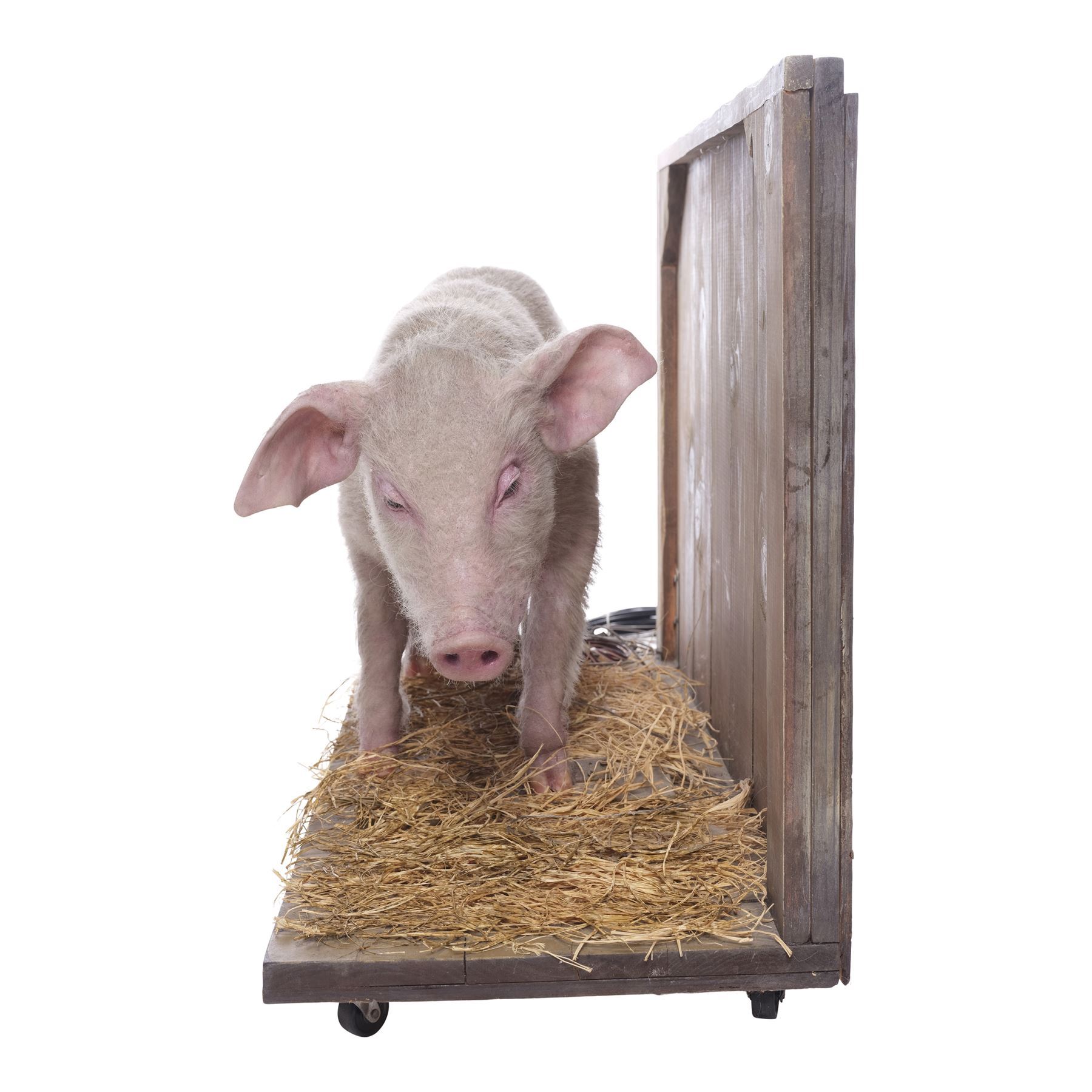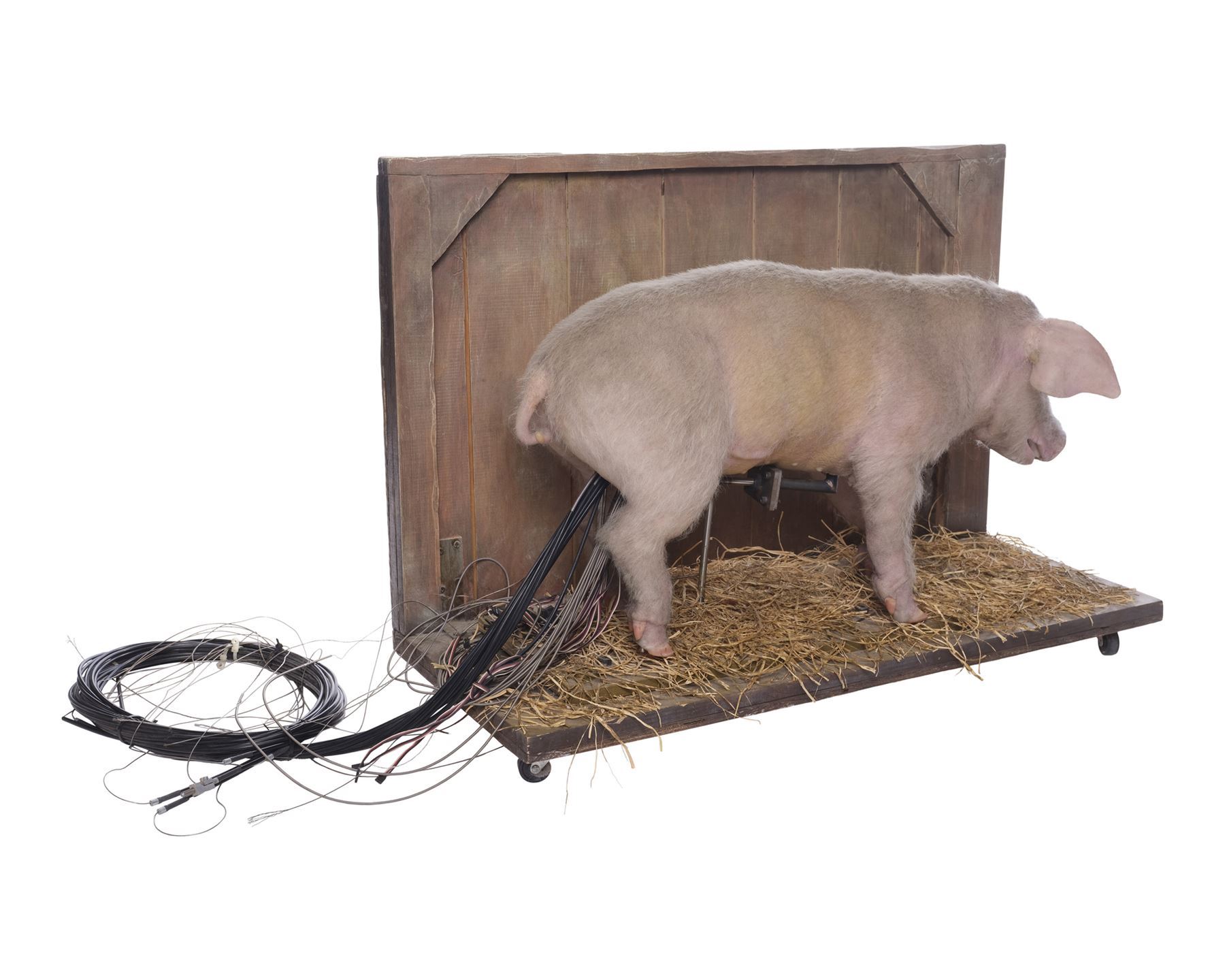 Originally made by Legacy Effects, this lot consists of one silicone puppet with hand-punched hair. It features a metal armature and wires for servo-control that extend outside the body. It comes with a custom-made display with hay to give the appearance of a barn. This puppet has undergone sympathetic repair. This lot exhibits silicone fragility from age with mild tearing and separation. Dimensions: 38" x 16" x 27" (96.5 cm x 40.75 cm x 68.5 cm)