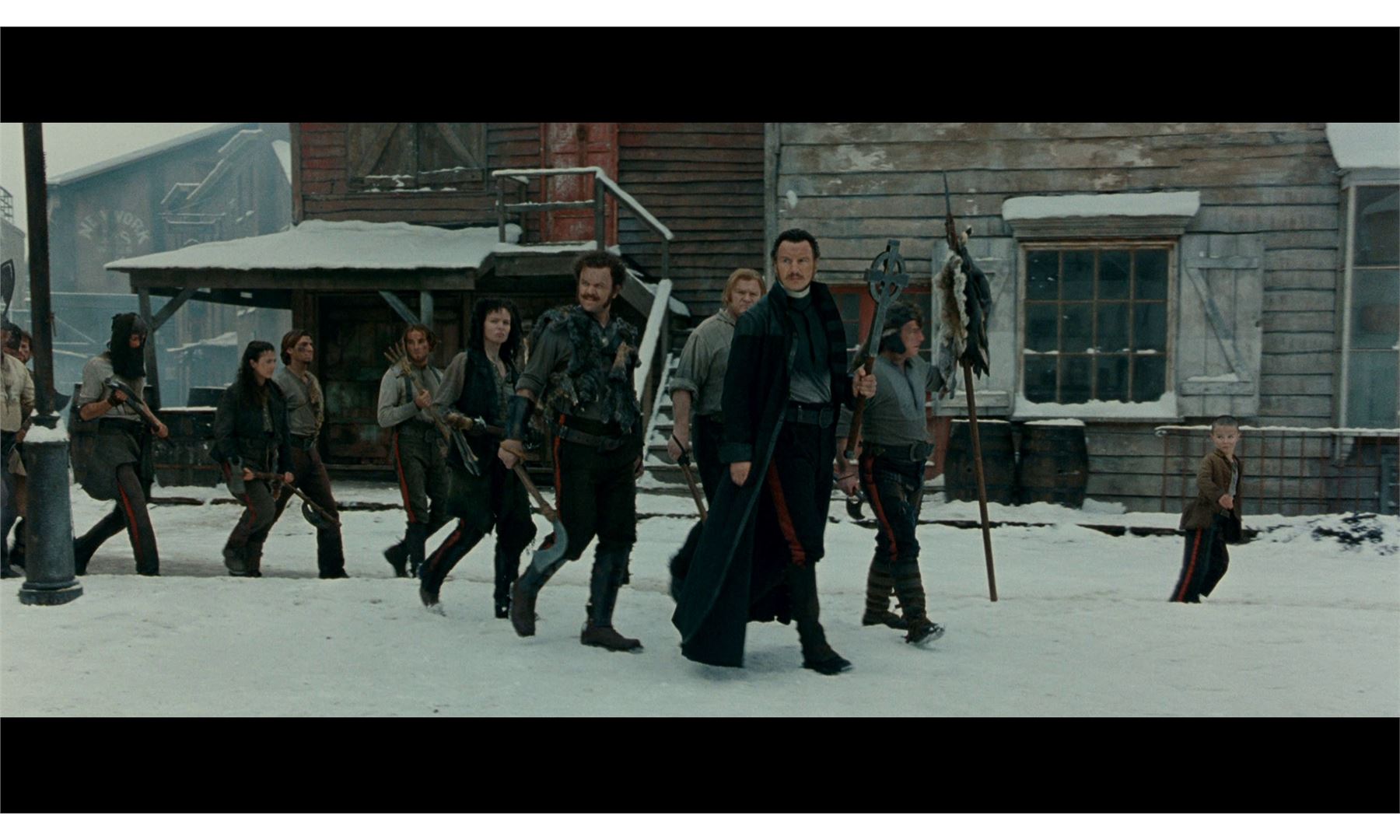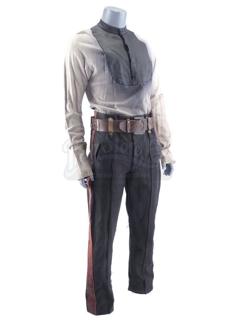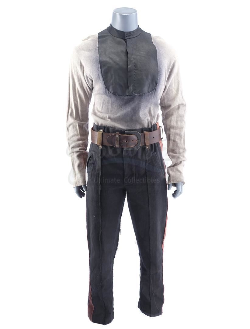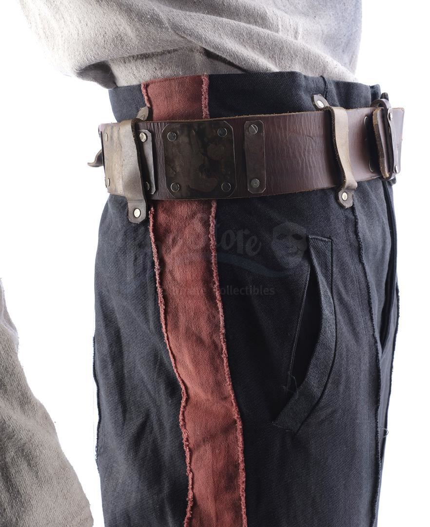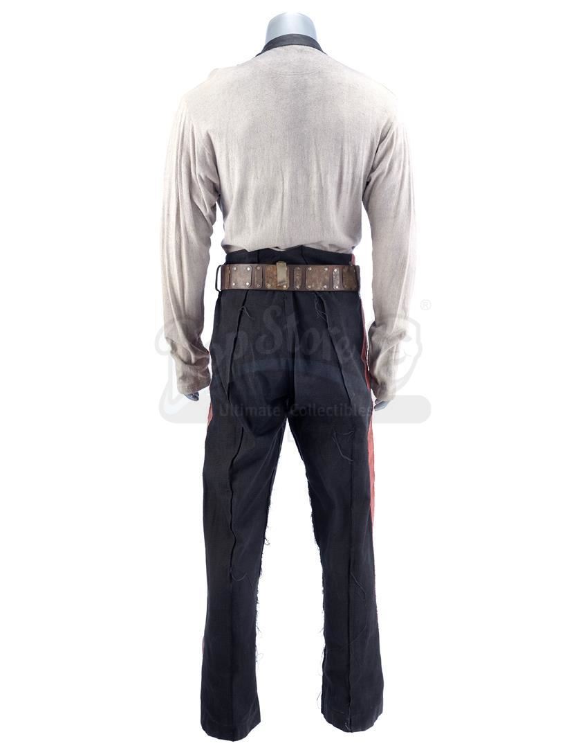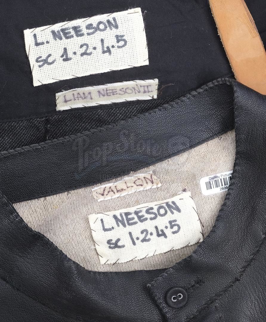 This lot will be auctioned on Wednesday, June 30th. The auction will begin at 9:00am PDT and lots are sold sequentially via live auctioneer; tune in to the live streaming broadcast on auction day to follow the pace. Note other lots in the auction may close on June 29th or July 1st. Priest Vallon's (Liam Neeson) costume from Martin Scorsese's historical crime film Gangs of New York. Vallon wore his costume while leading the Dead Rabbits in battle against William "Bill the Butcher" Cutting's (Daniel Day-Lewis) Natives for control of Five Points, Manhattan. The costume consists of a gray cotton blend long-sleeve button-up shirt marked "Vallon" and "L. Neeson" with a sewn-on black leather dickey tagged with a Disney Pictures wardrobe sticker; a brown leather belt marked "Vallon I" with dark metal embellishments; and a pair of navy wool blend pants marked "Liam Neeson" with the Dead Rabbits' signature red wool stripes running down each leg. The costume is in good overall condition with minimal wear from production and age. Estimate: $2,000 - 3,000