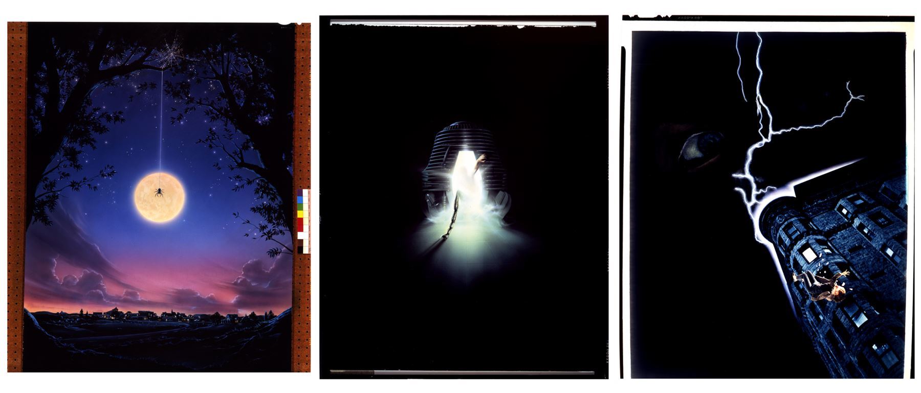 These textless cellulose acetate transparencies depict Richard Mahon's one-sheet art for The Fly, John Alvin's one-sheet art for Arachnophobia, and the one-sheet art for Child's Play. Each is numbered on the sides, and the Child's Play transparency features sprocket holes and a color bar in the margins. They exhibit print errors in the margins. Dimensions: (each) 8" x 10" (20.5 cm x 25.5 cm)