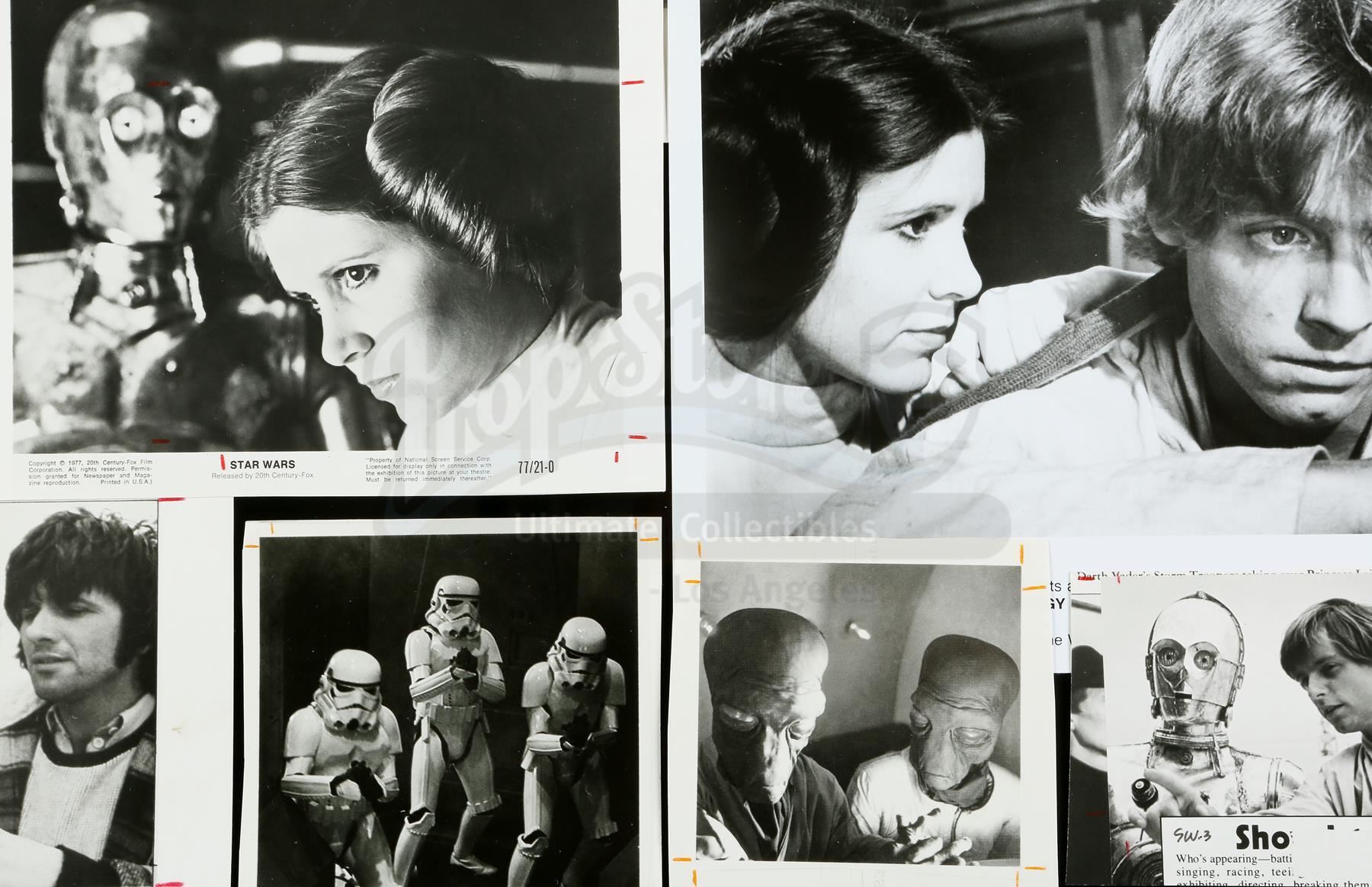 The set consists of 51 photos of varying sizes from throughout the production and promotion of the films, including publicity stills, behind-the-scenes images, and apparent reprints of some photos from other media, all in individual plastic sleeves. A film slide of one of the contest winners is also included with the copy. The lot is in good overall condition with handwritten notes throughout.