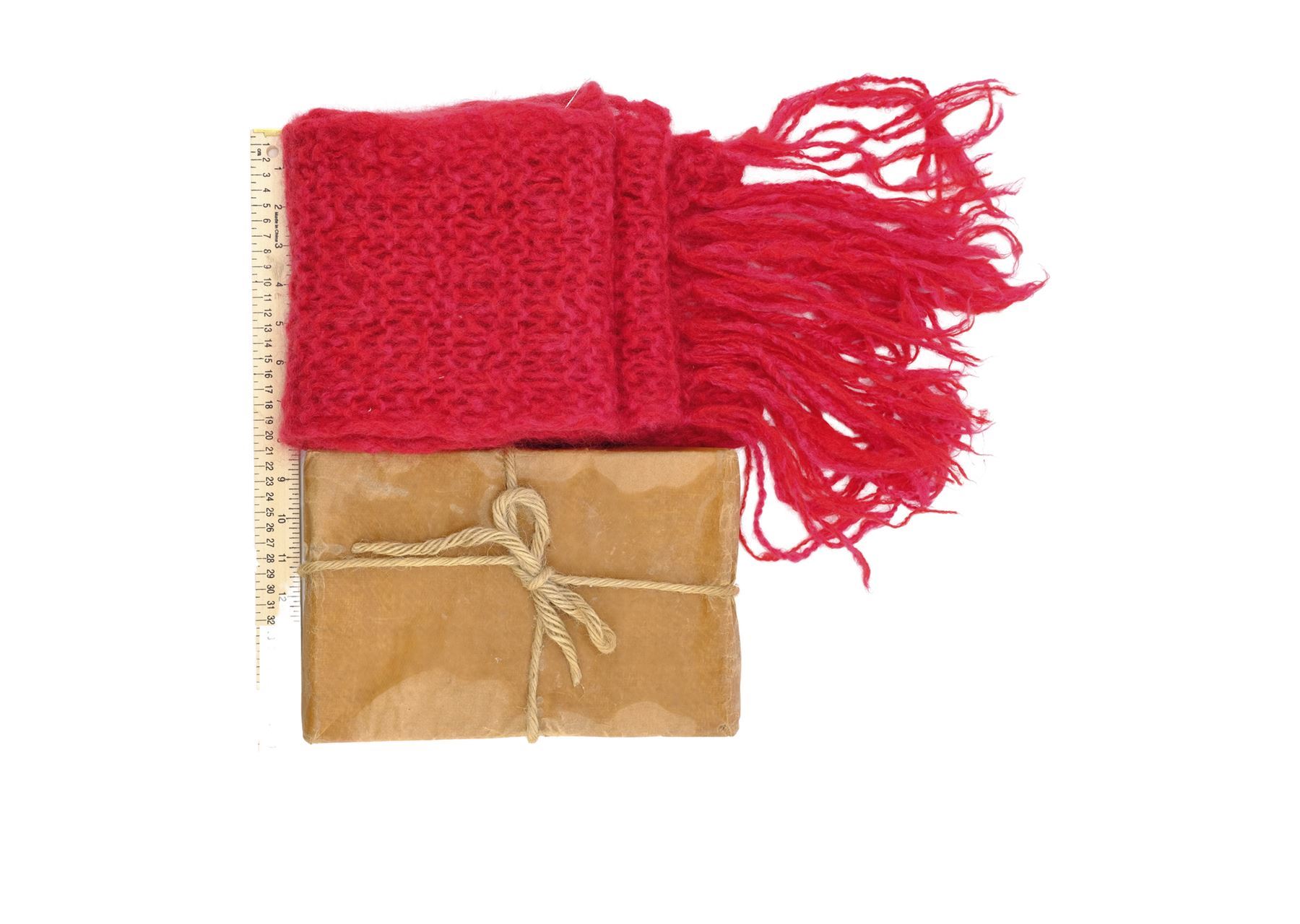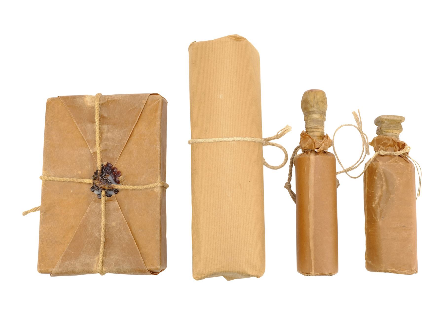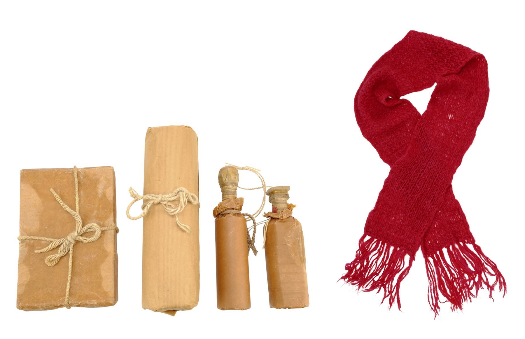 This lot consists of a crocheted red wool scarf with long fringe; one brown paper cylinder package with twine; two brown paper bottle packages attached together and decorated with twine; and one brown paper rectangular package wrapped in twine and red wax. This lot exhibits minor scuffs and dents from production use and age. Dimensions: 13.5" x 4" x 4" (34.5 cm x 10.25 cm x 10.25 cm)
