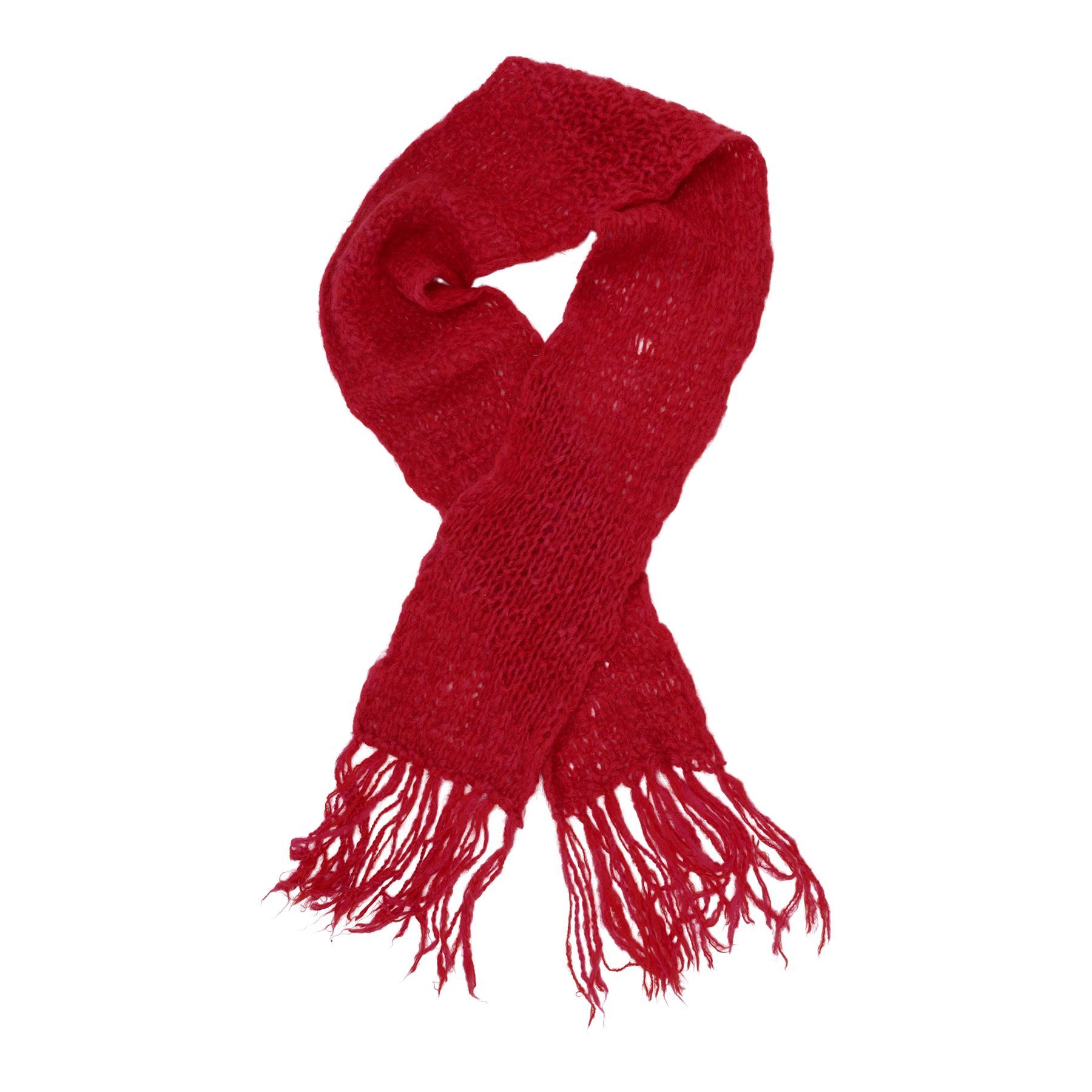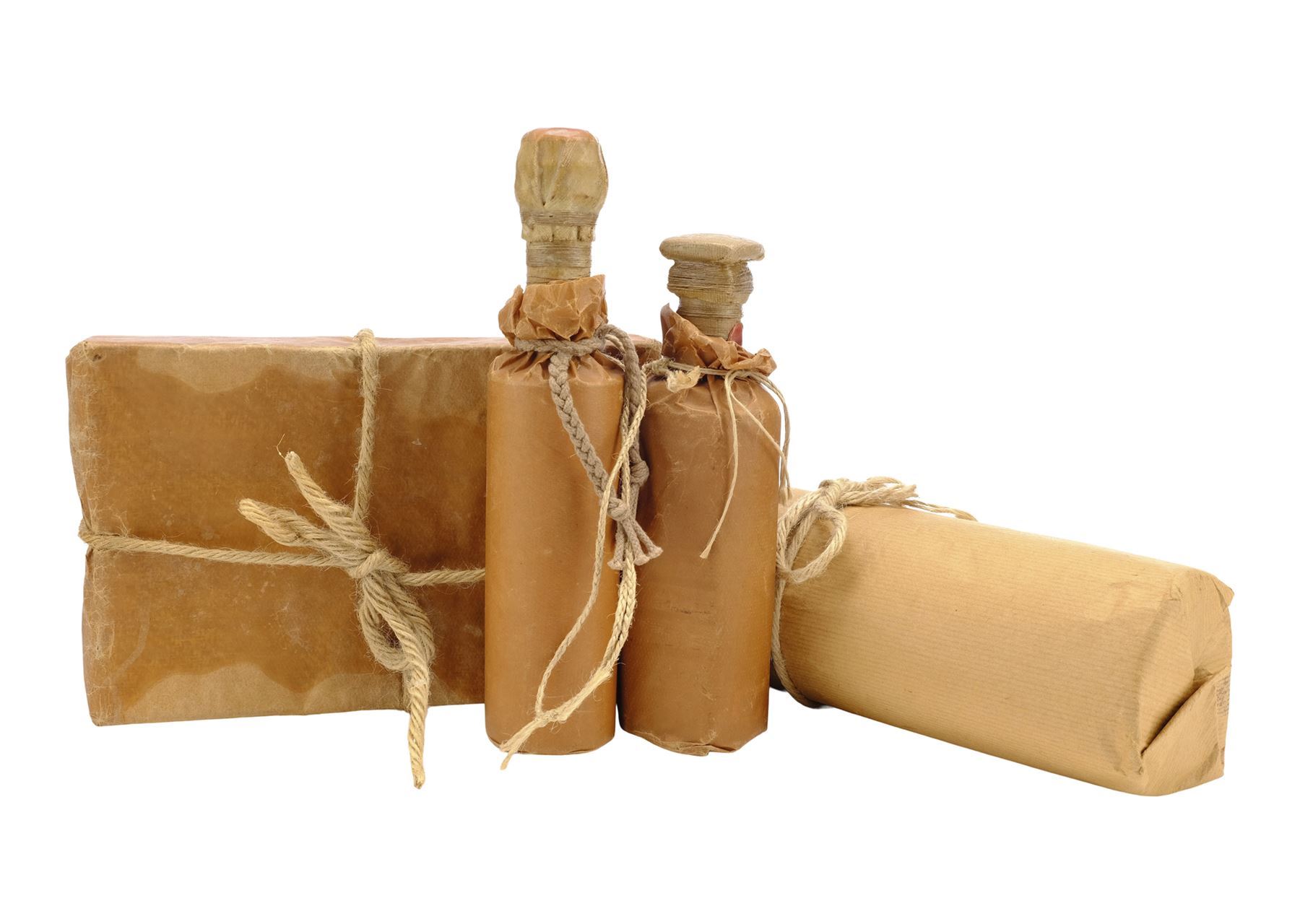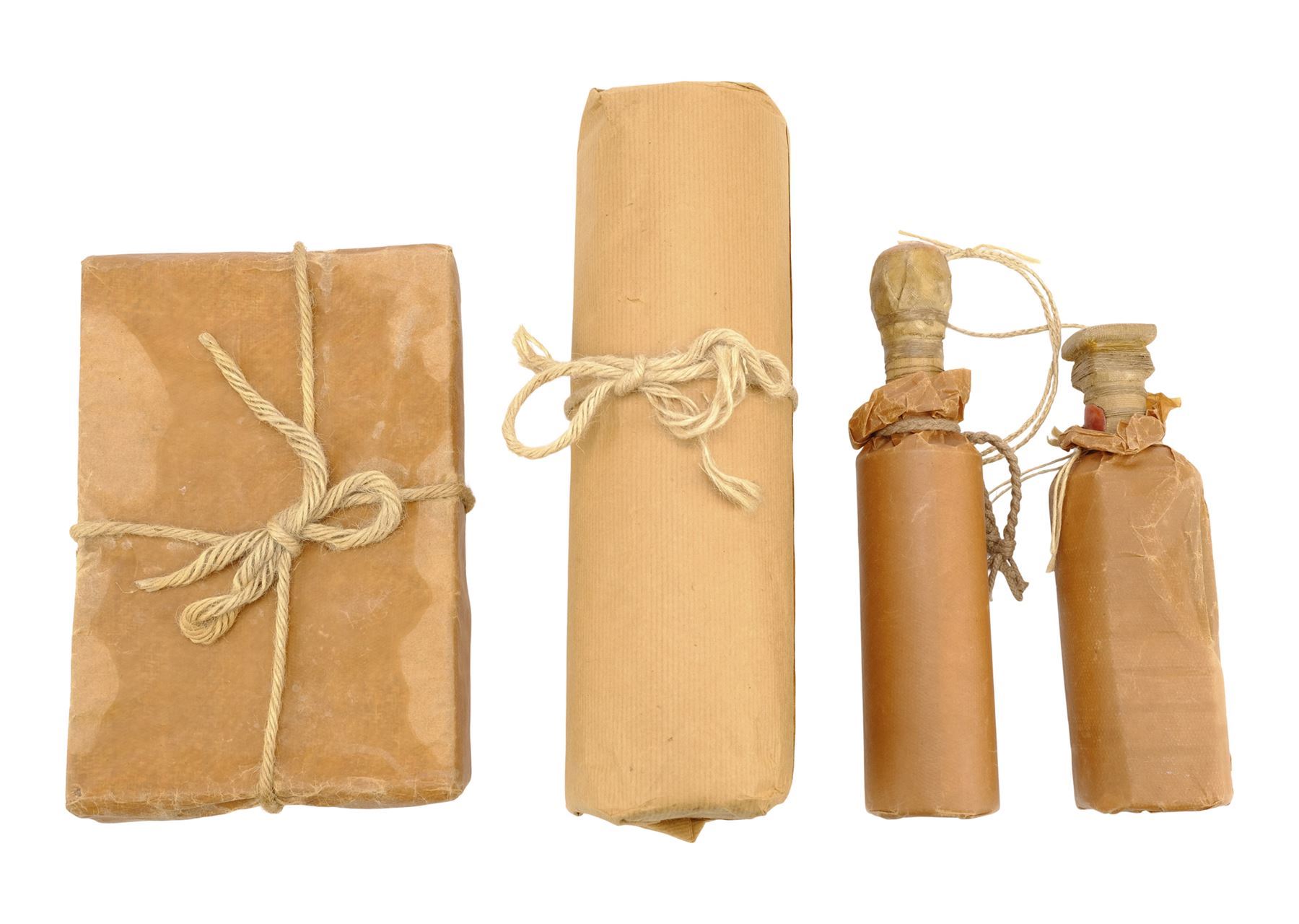 This lot consists of a crocheted red wool scarf with long fringe; one brown paper cylinder package with twine; two brown paper bottle packages attached together and decorated with twine; and one brown paper rectangular package wrapped in twine and red wax. This lot exhibits minor scuffs and dents from production use and age. Dimensions: 13.5" x 4" x 4" (34.5 cm x 10.25 cm x 10.25 cm)