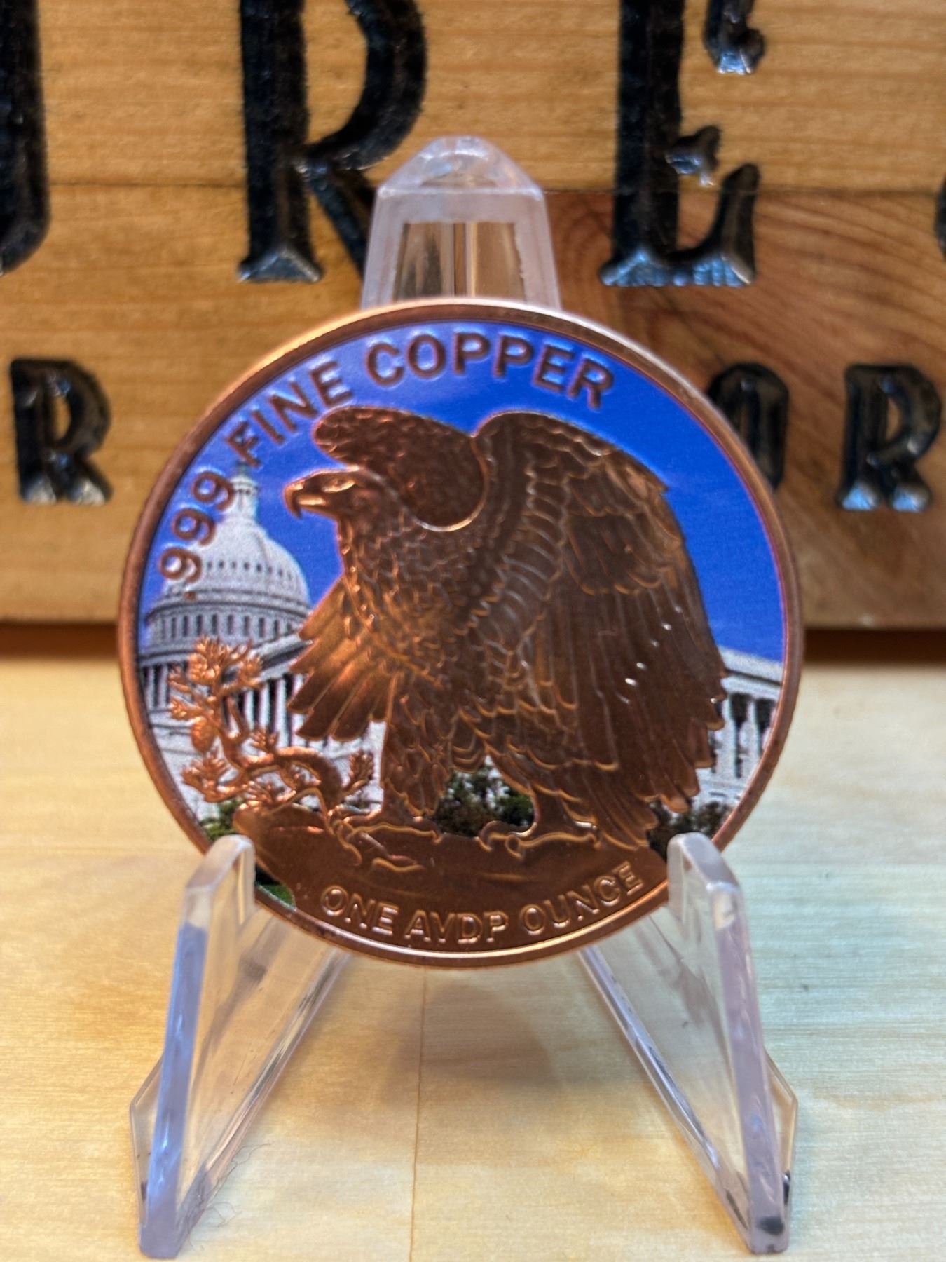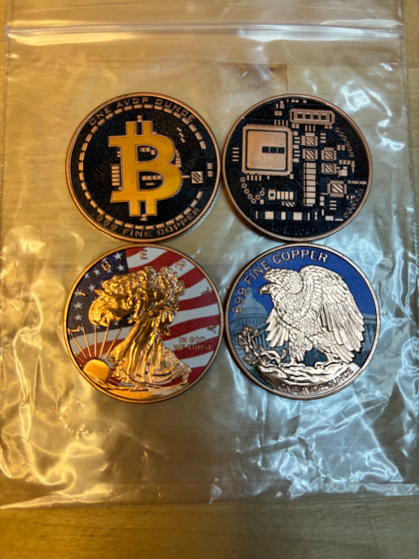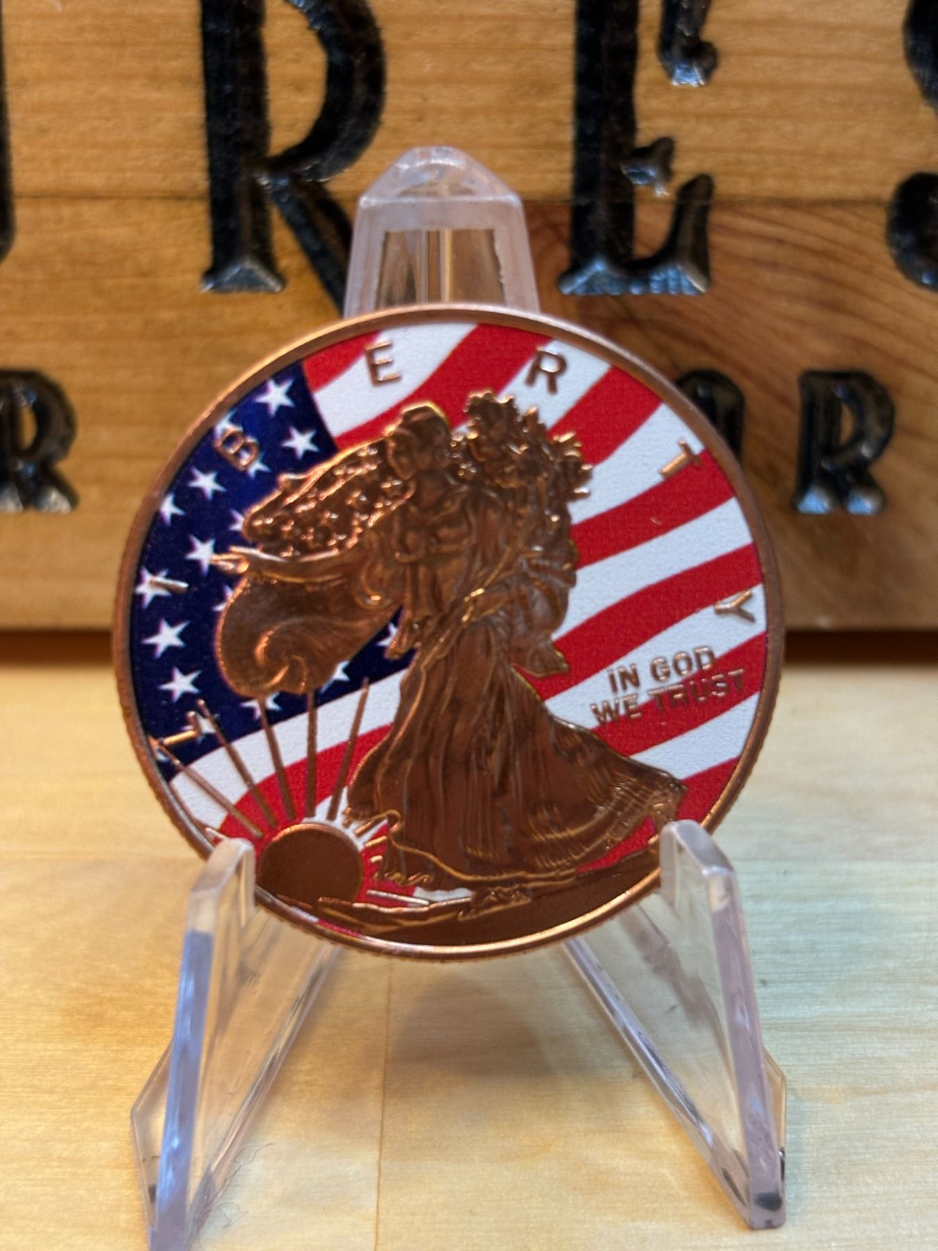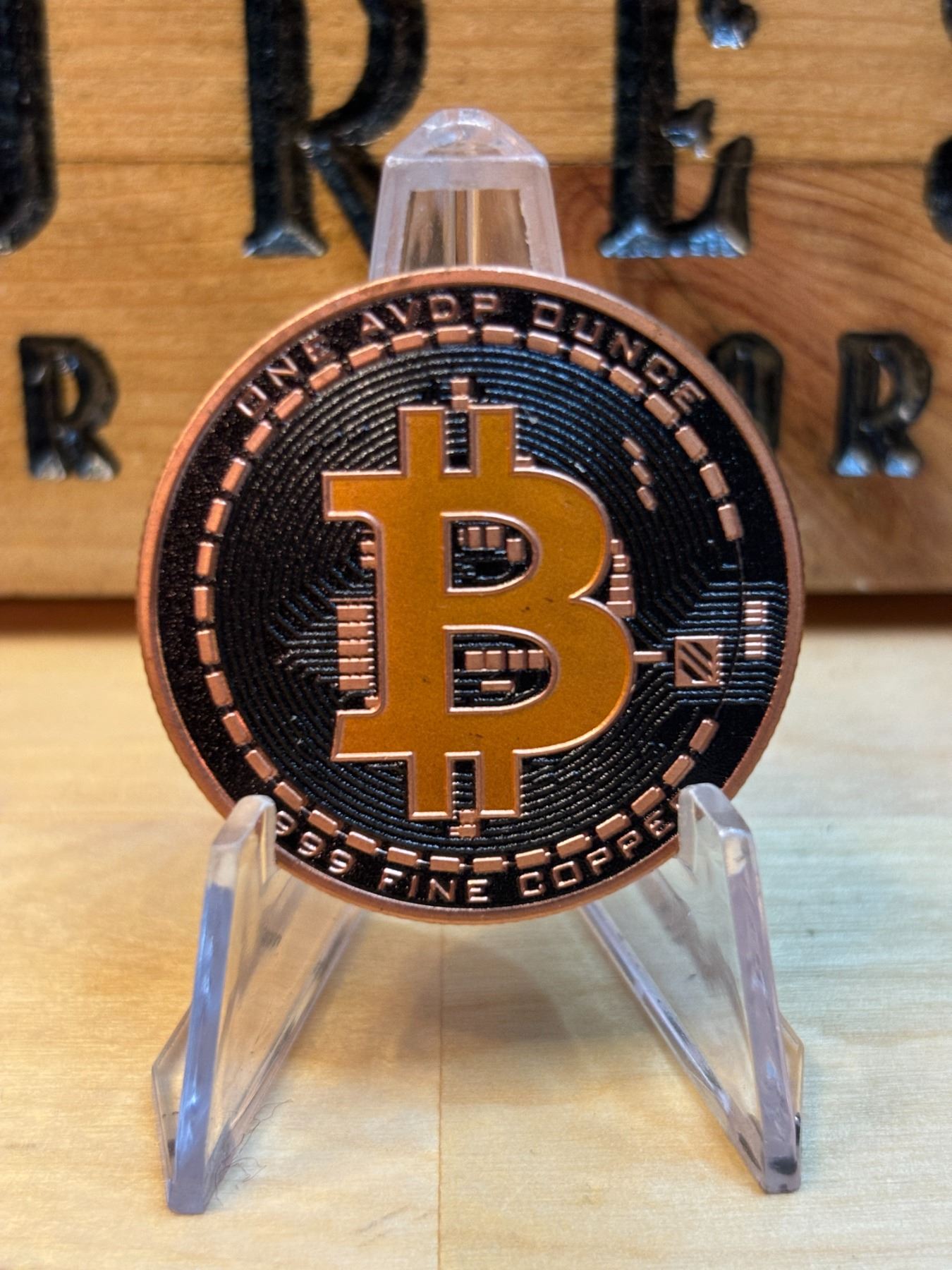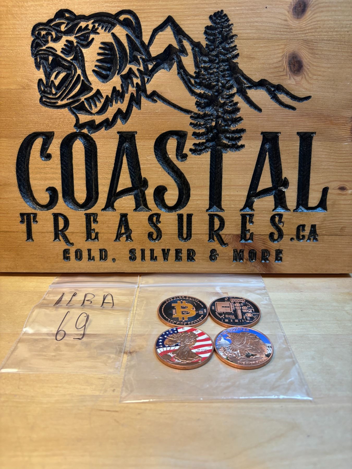 The 4 x 1 oz Mixed Coloured Copper Rounds featuring Bitcoin and Walking Liberty designs are a collection of four copper rounds, each weighing 1 ounce. These rounds showcase a blend of modern and classic themes, with one or more rounds featuring the Bitcoin logo, and others displaying the iconic Walking Liberty design. The rounds are often enhanced with vibrant colours, adding a unique visual appeal. Popular among collectors, these copper rounds offer an affordable way to own visually striking pieces that blend cryptocurrency and traditional numismatic design.