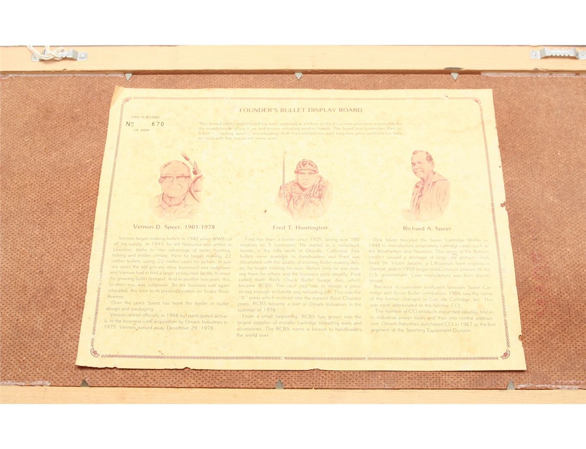 Limited Edition #670/4000 framed Omark Ind. (CCI, Speer & RCBS) Founders bullet display board - features the three founders of Omark - 110 asst'd handgun & rifle bullets from .22 caliber to .45 caliber - complete set with no missing bullets - in excellent condition - 21.5" x 12" framed size - ready to hang - non-ffl - 25VVFKIL056