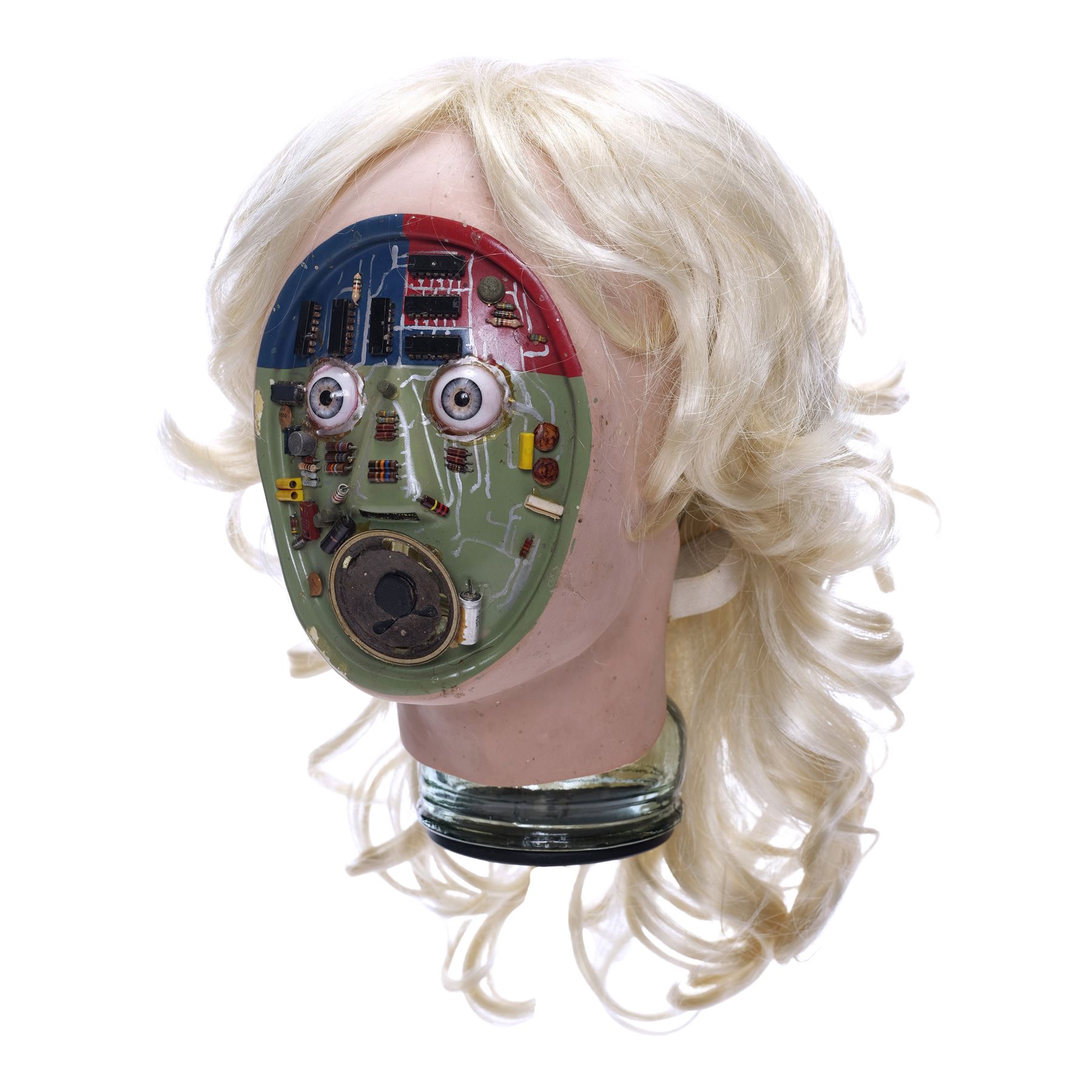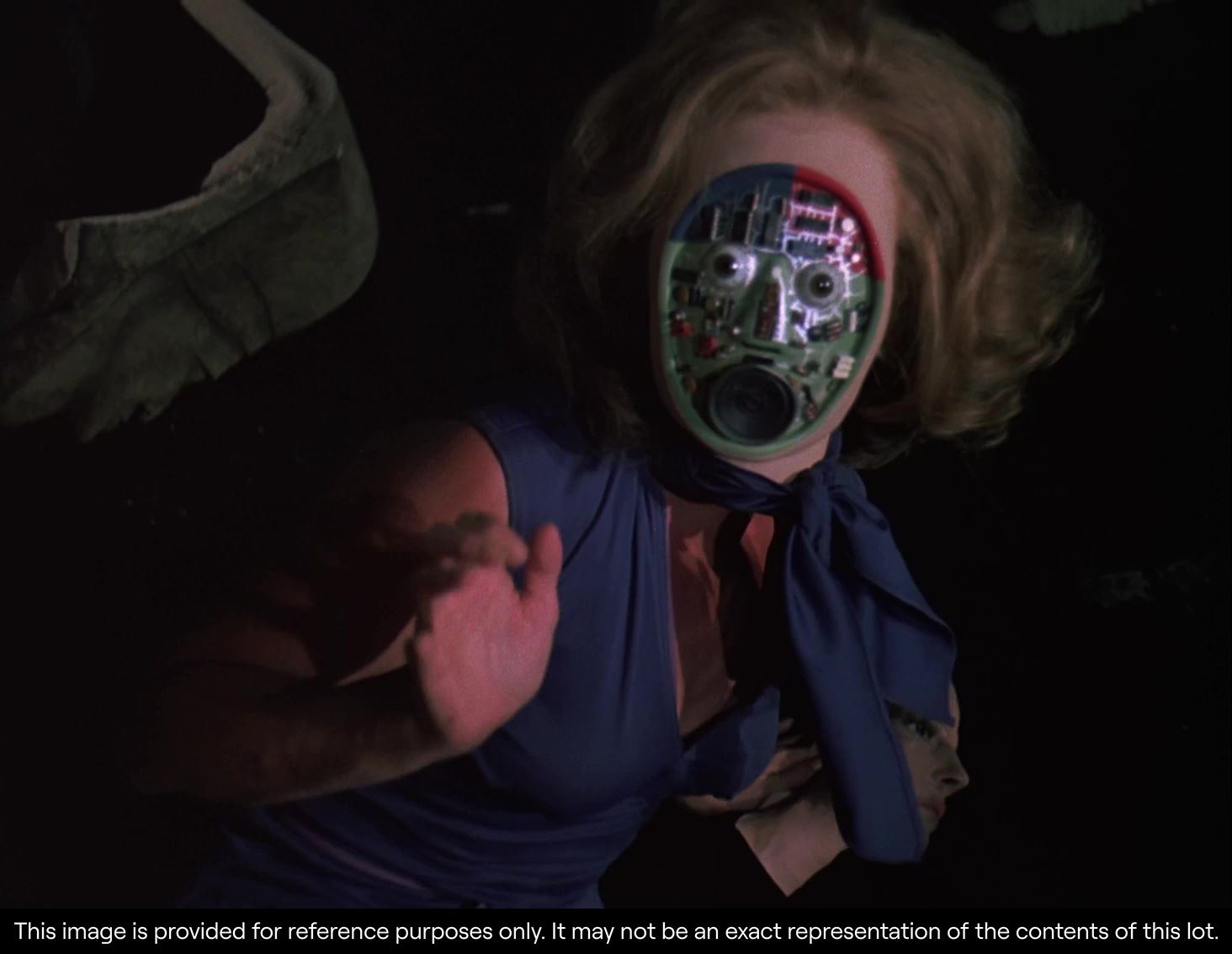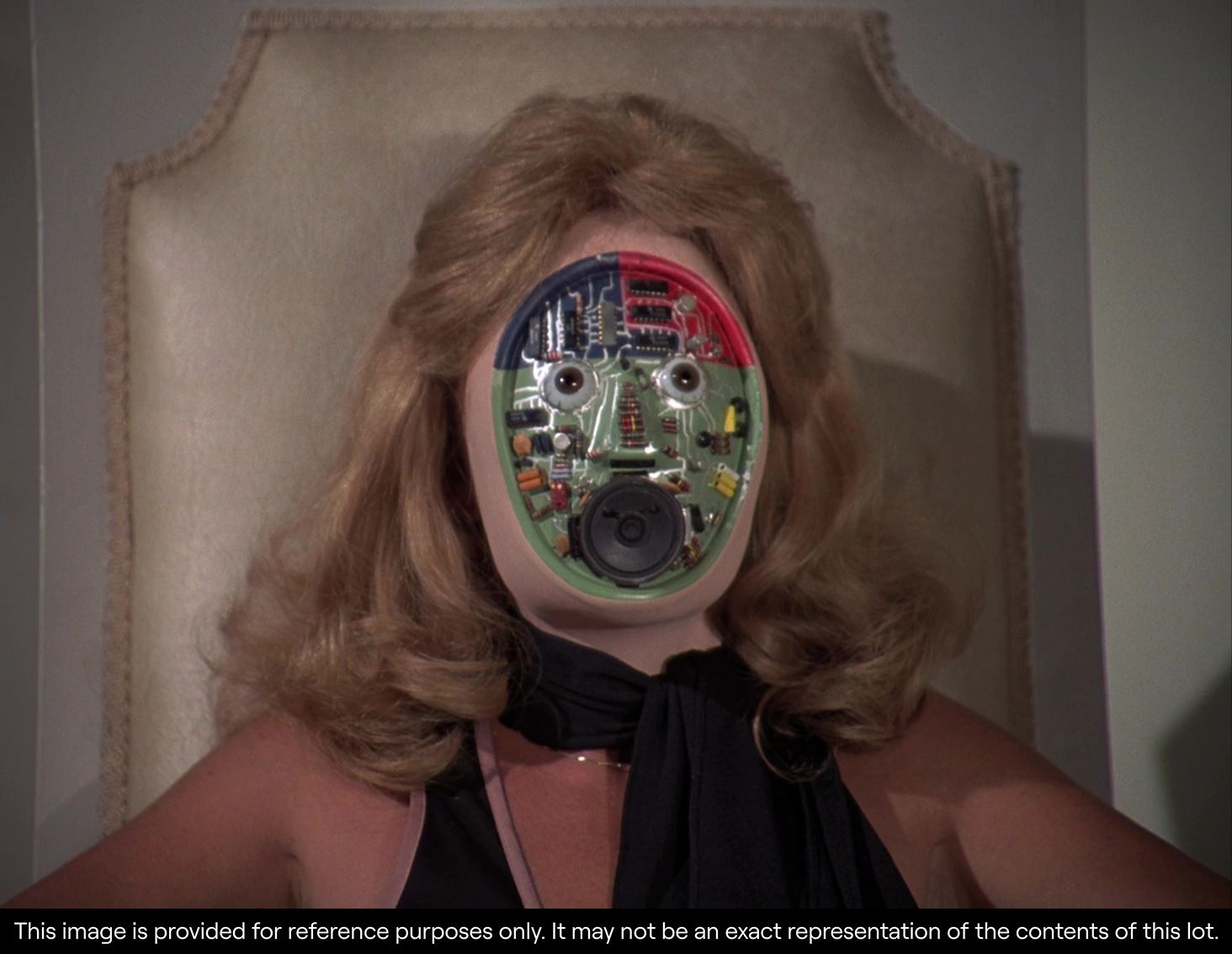 This fembot head consists of a plastic mask with a blonde synthetic wig affixed to a black flocked head. The face reveals multiple acrylic microchips, eyes, and a foam speaker. The head is fixed to a white plastic display stand with a "Fembot" plaque on the front. The wig and eyes are replicas that were added to complete the piece. This lot exhibits crumbled foam, discolouration on the mask, tangled hair fibres, and signs of restoration including paintwork and embellishments on the mouth speaker. Dimensions: 31.75 cm x 24.25 cm x 19 cm (12.5" x 9.5" x 7.5")