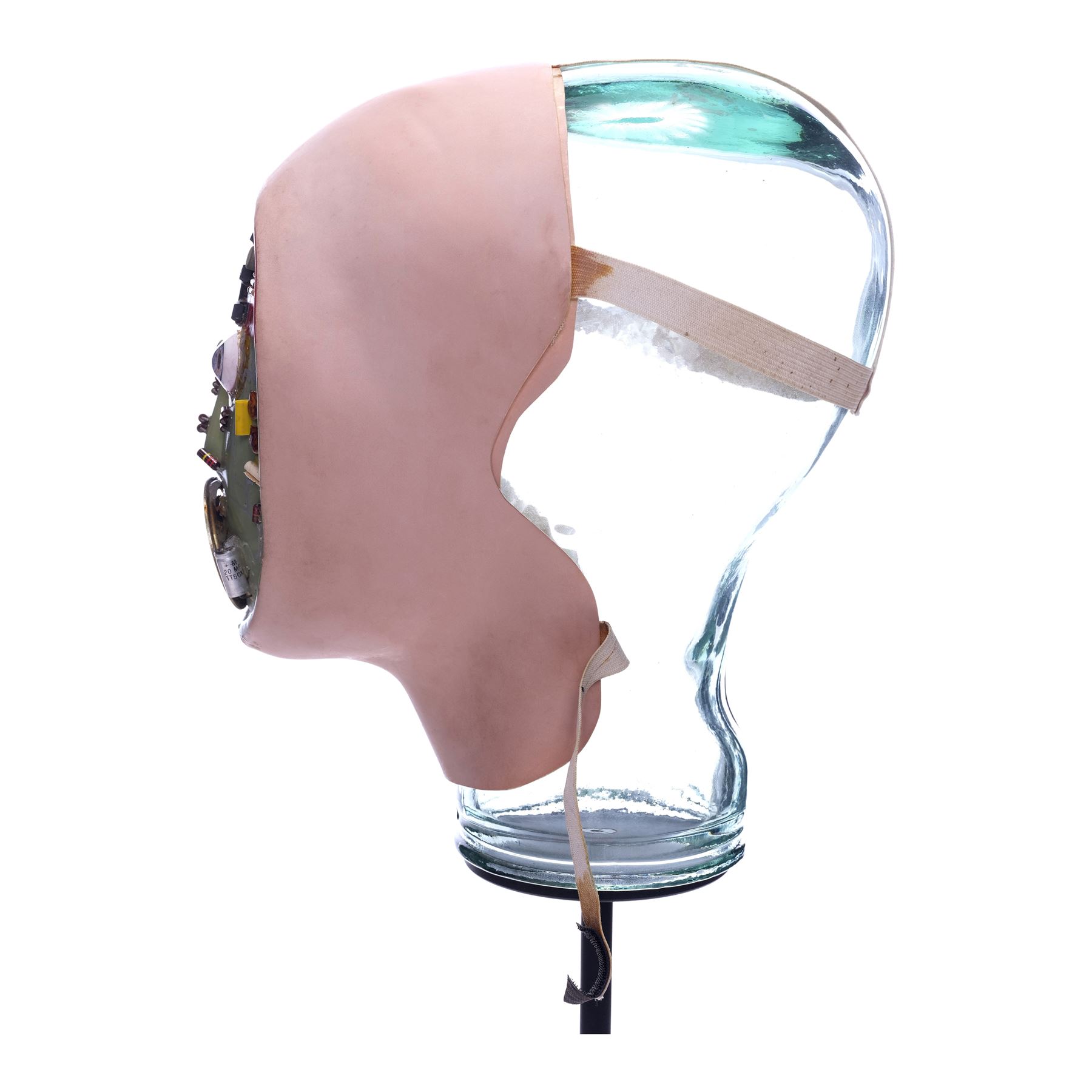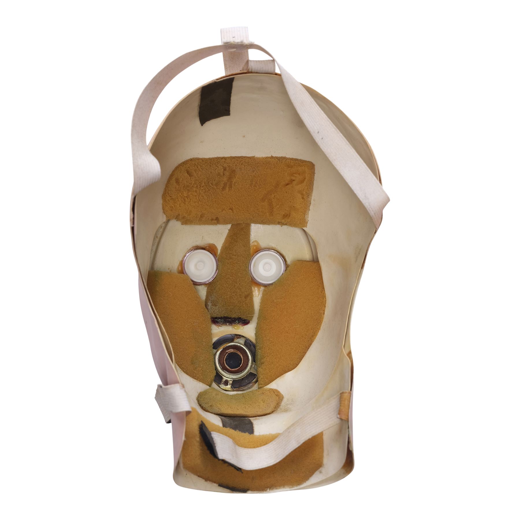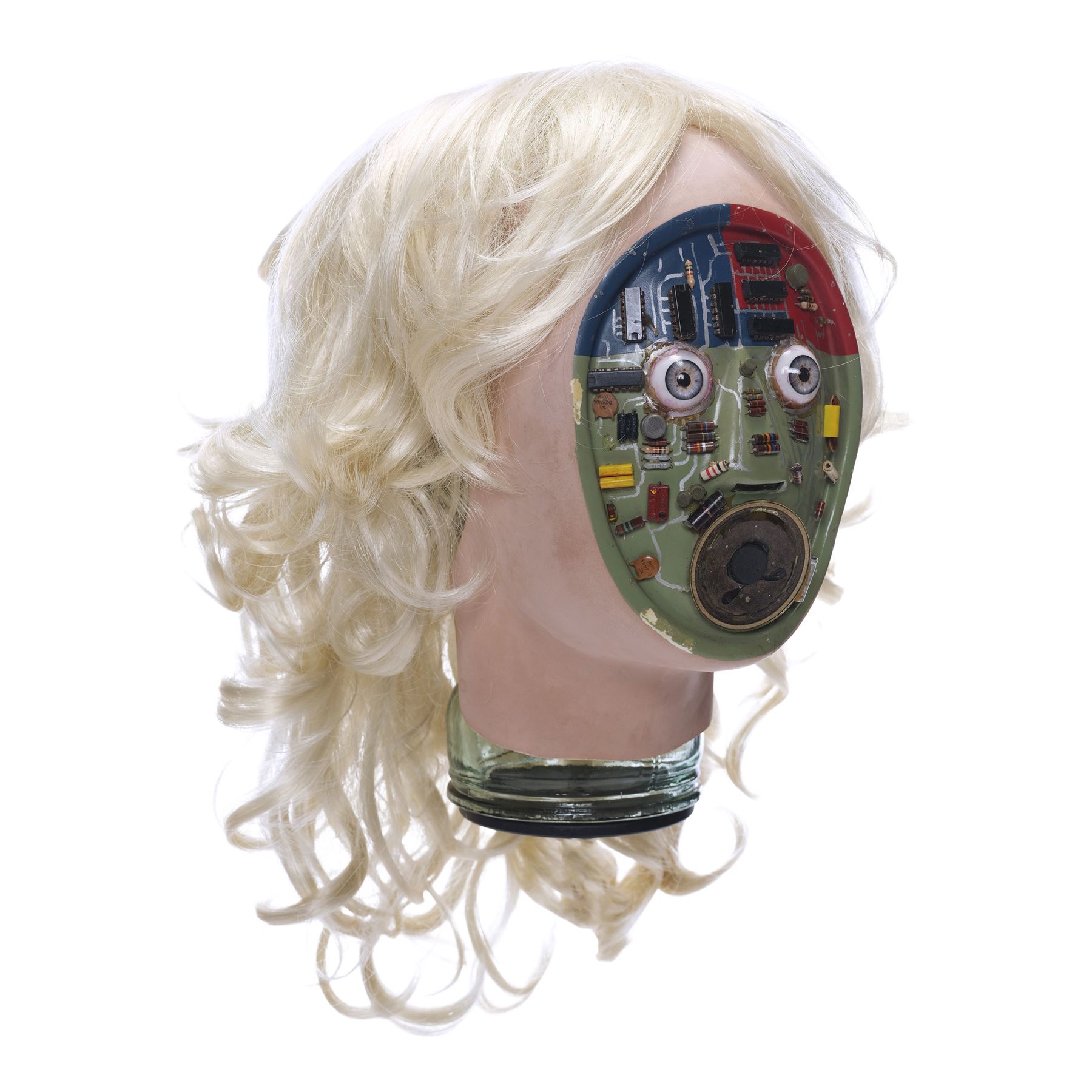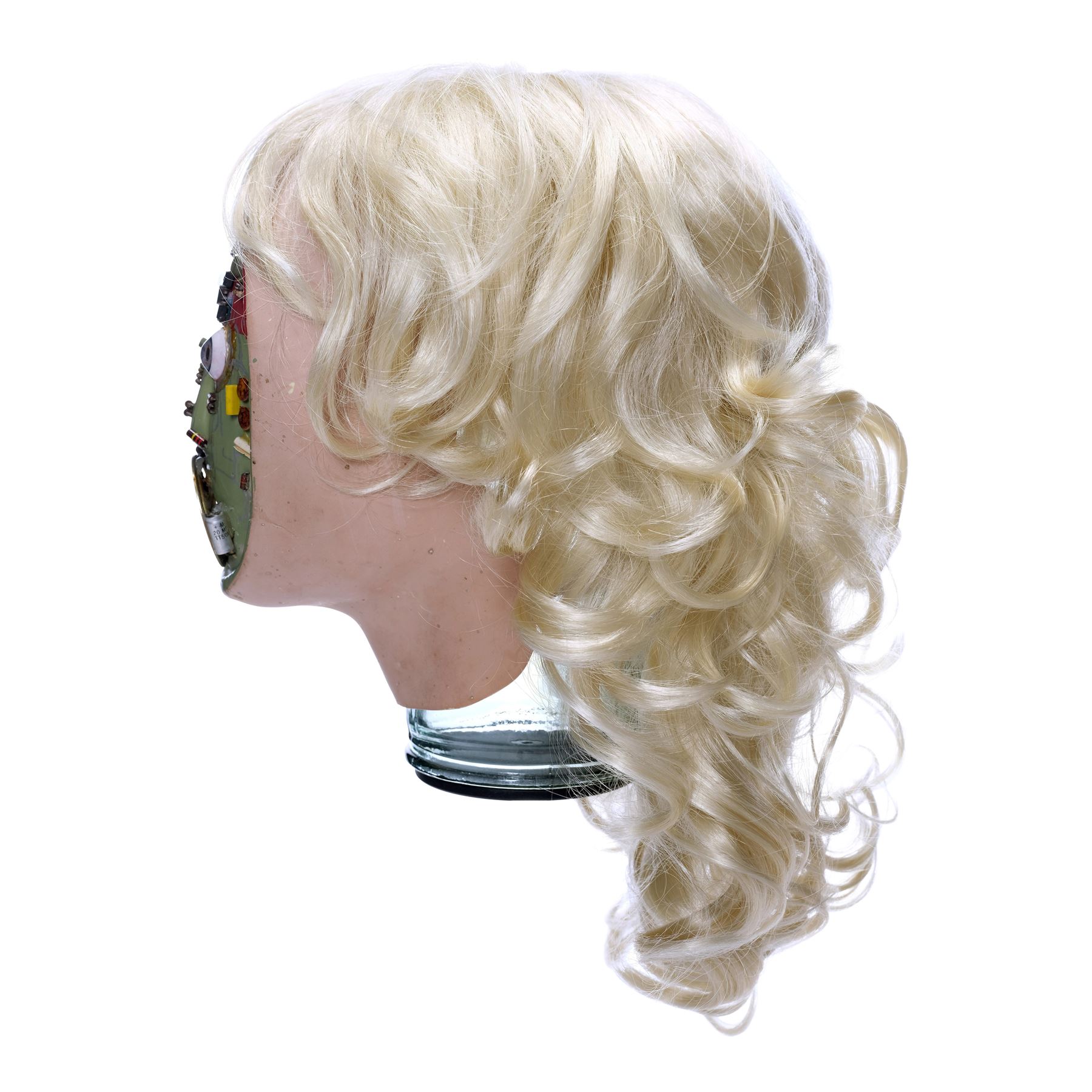 This fembot head consists of a plastic mask with a blonde synthetic wig affixed to a black flocked head. The face reveals multiple acrylic microchips, eyes, and a foam speaker. The head is fixed to a white plastic display stand with a "Fembot" plaque on the front. The wig and eyes are replicas that were added to complete the piece. This lot exhibits crumbled foam, discolouration on the mask, tangled hair fibres, and signs of restoration including paintwork and embellishments on the mouth speaker. Dimensions: 31.75 cm x 24.25 cm x 19 cm (12.5" x 9.5" x 7.5")