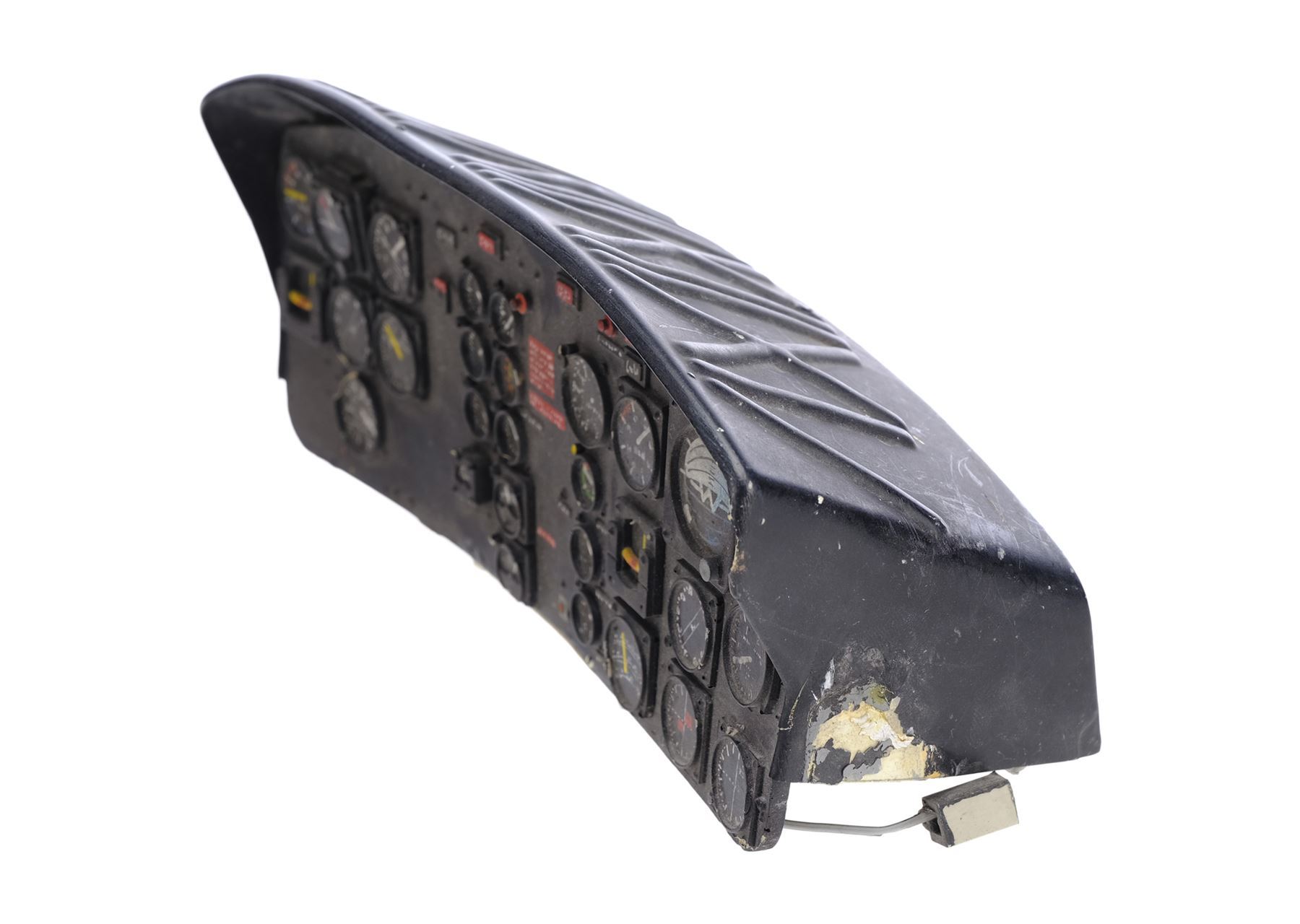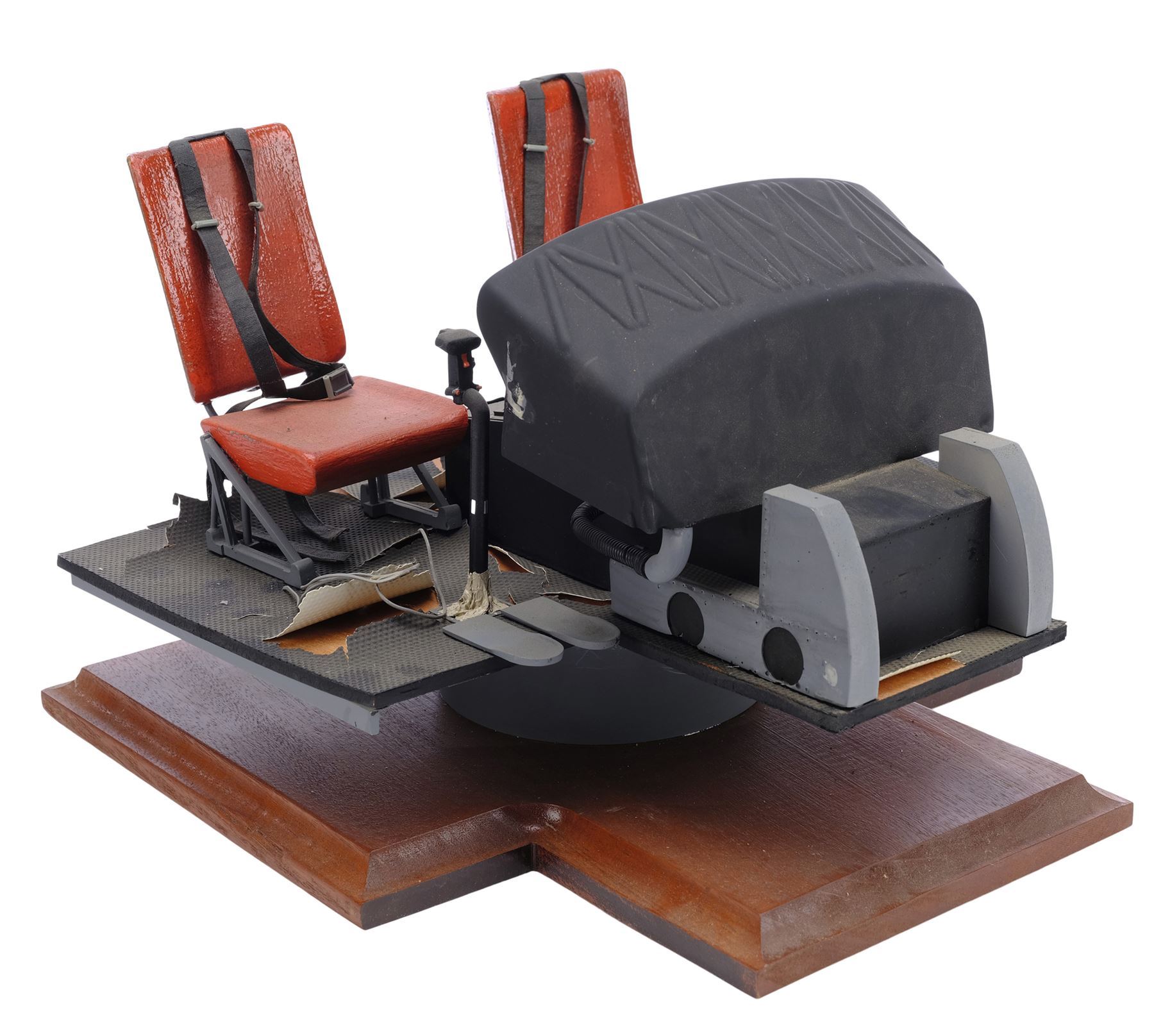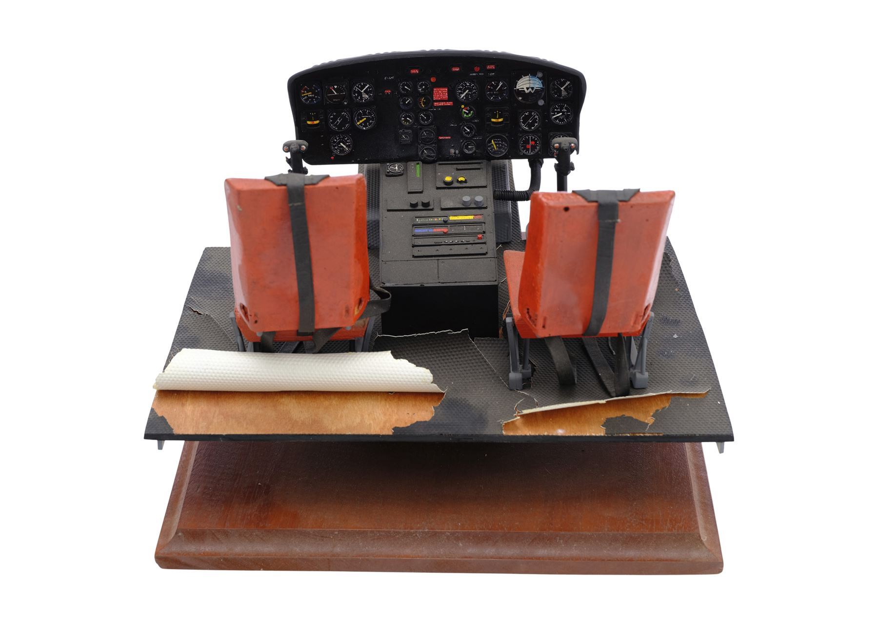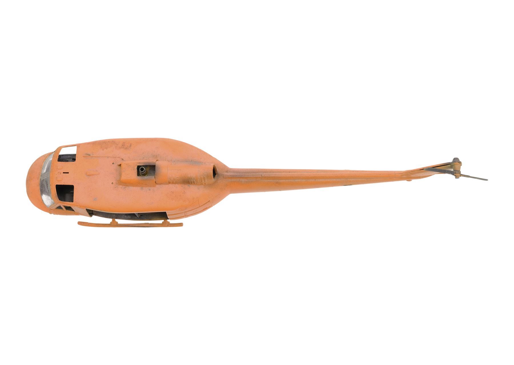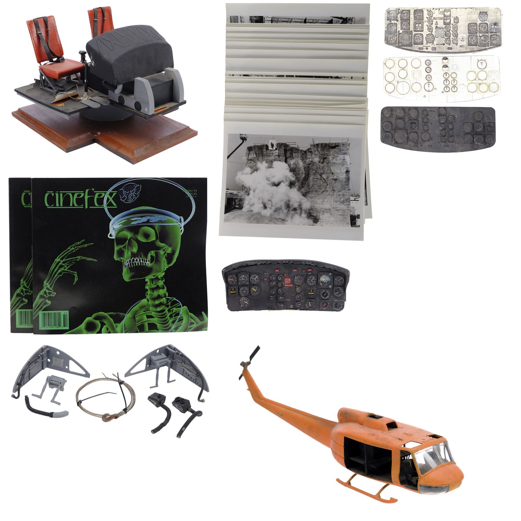 This lot comes from the collection of veteran model maker Dave Jones. It consists of a 1/4-scale fiberglass and resin helicopter cockpit model miniature; 11 miniature cockpit pieces; two Cineflix booklets; 31 behind-the-scenes photographs; a wood base; and a smaller Huey helicopter model miniature. The cockpit was purposefully distressed by production. This lot exhibits scratches, scuffs, a buildup of grime, and discoloration. Dimensions: (largest) 12.5" x 13.5" x 10" (31.75 cm x 34.5 cm x 25.5)