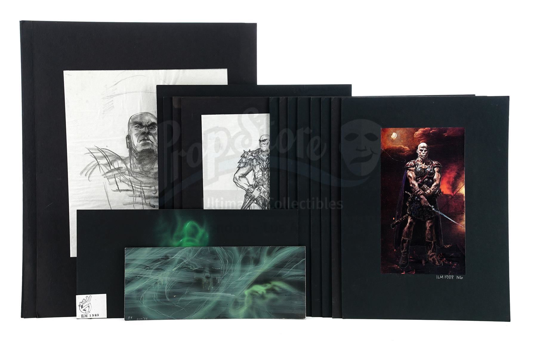 This lot will be auctioned on Wednesday, June 30th. The auction will begin at 9:00am PDT and lots are sold sequentially via live auctioneer; tune in to the live streaming broadcast on auction day to follow the pace. Note other lots in the auction may close on June 29th or July 1st. Production artwork from Ivan Reitman's supernatural comedy sequel Ghostbusters II. Paranormal investigators reunited to stop Viggo the Carpathian (Wilhelm von Homburg). This lot consists of hand-drawn concept sketches of Viggo rendered in pencil on illustration paper, eleven pages of printed concept designs of Viggo; a hand-drawn color storyboard featuring "river of slime" images; one "Slimer" airbrushed color image; one hand-painted color "skull smoke" image, and one black-and-white printed "living mink coat" design. Most are affixed to black poster board. All show wear from age, but remain in good overall condition. Dimensions: 21" x 17" x 4" (53.5 cm x 43.25 cm x 10.25 cm) Sold without copyright; please refer to Buyer's Guide. Estimate: $1,000 - 1,500