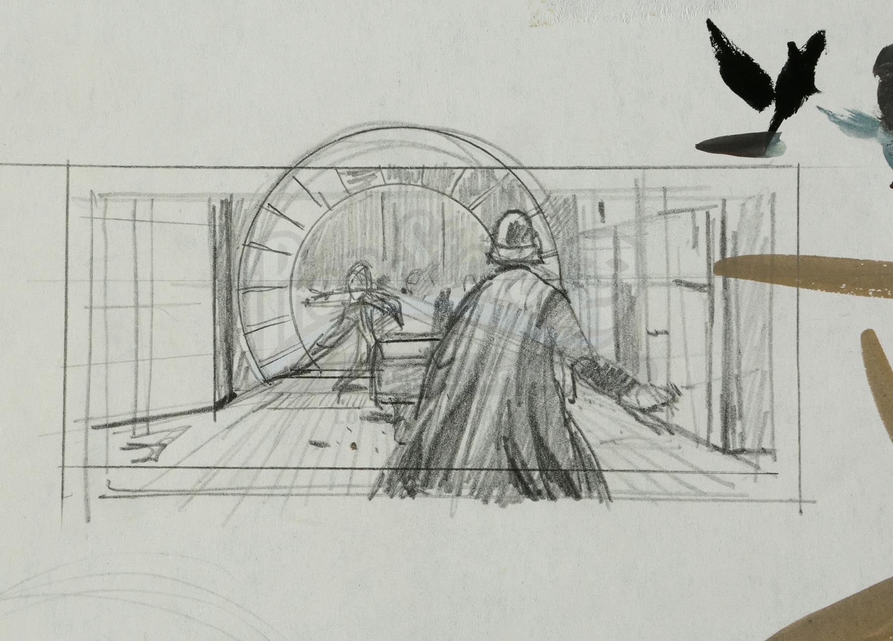 A hand-drawn Ralph McQuarrie thumbnail sketch of Darth Vader and Luke Skywalker at the Cloud City window from the production of Irvin Kershner's Star Wars: The Empire Strikes Back. Luke Skywalker (Mark Hamill) and Darth Vader's (David Prowse) climactic lightsaber duel took them into the bowels of Cloud City.