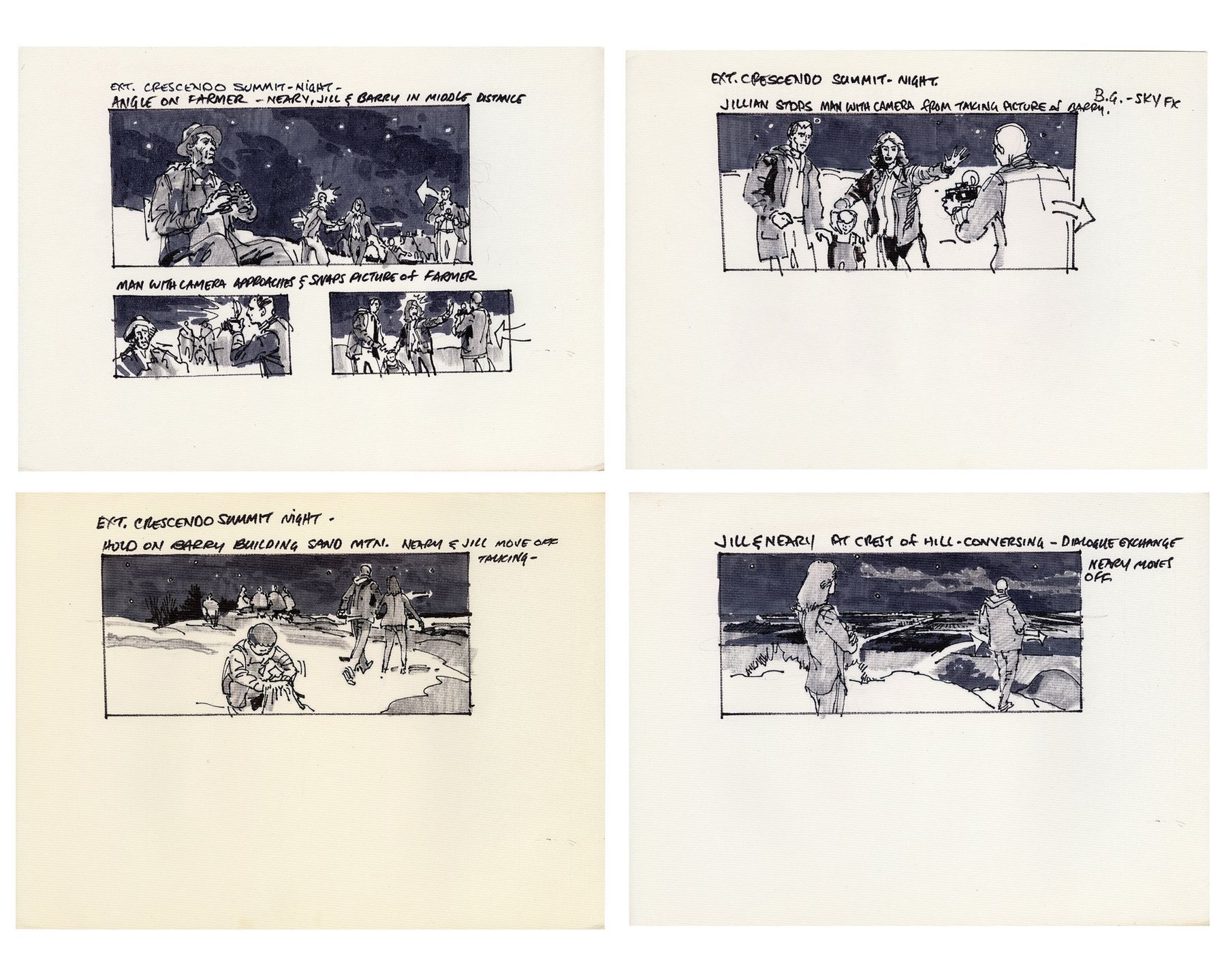 CLOSE ENCOUNTERS OF THE THIRD KIND (1977) - Set of Four Hand-Drawn George Jenson Crescendo Summit Storyboards - Four Crescendo Summit storyboards hand-drawn by George Jenson for Steven Spielberg's sci-fi film Close Encounters of the Third Kind. Locals gathered at Crescendo Summit in hopes of seeing the extraterrestrial vessels that visited their town.