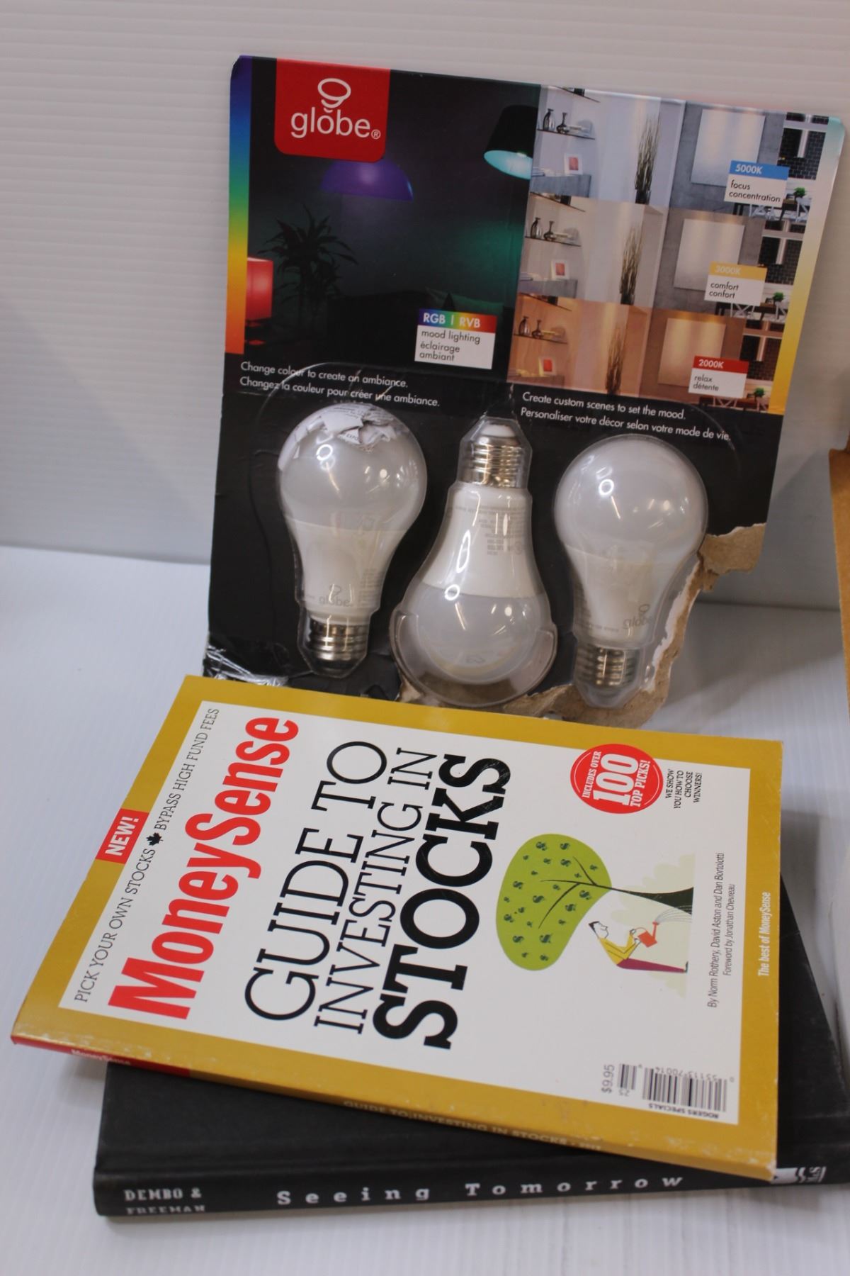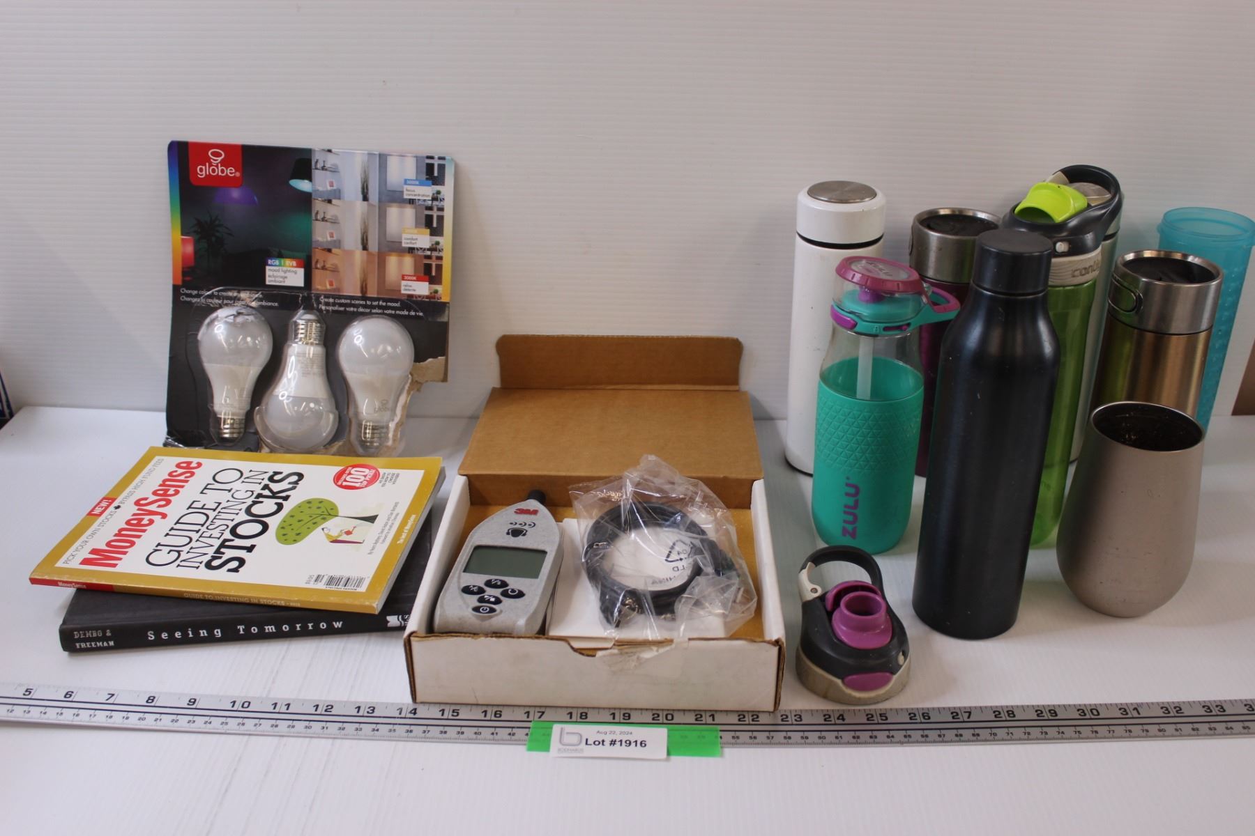 Lot: (7) Water Bottles, Light Bulbs, 3M Sound Doctor, (2) Money Books