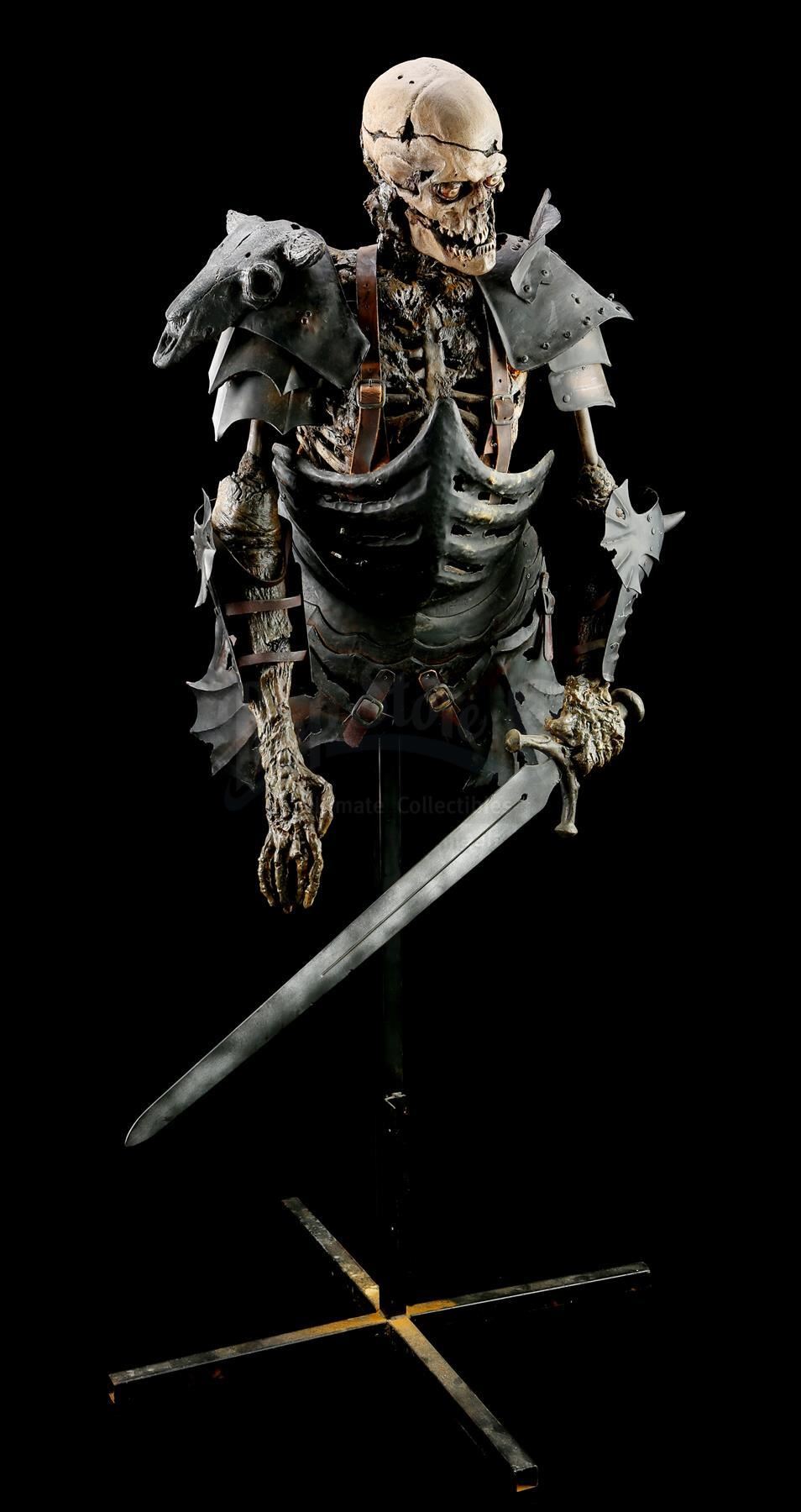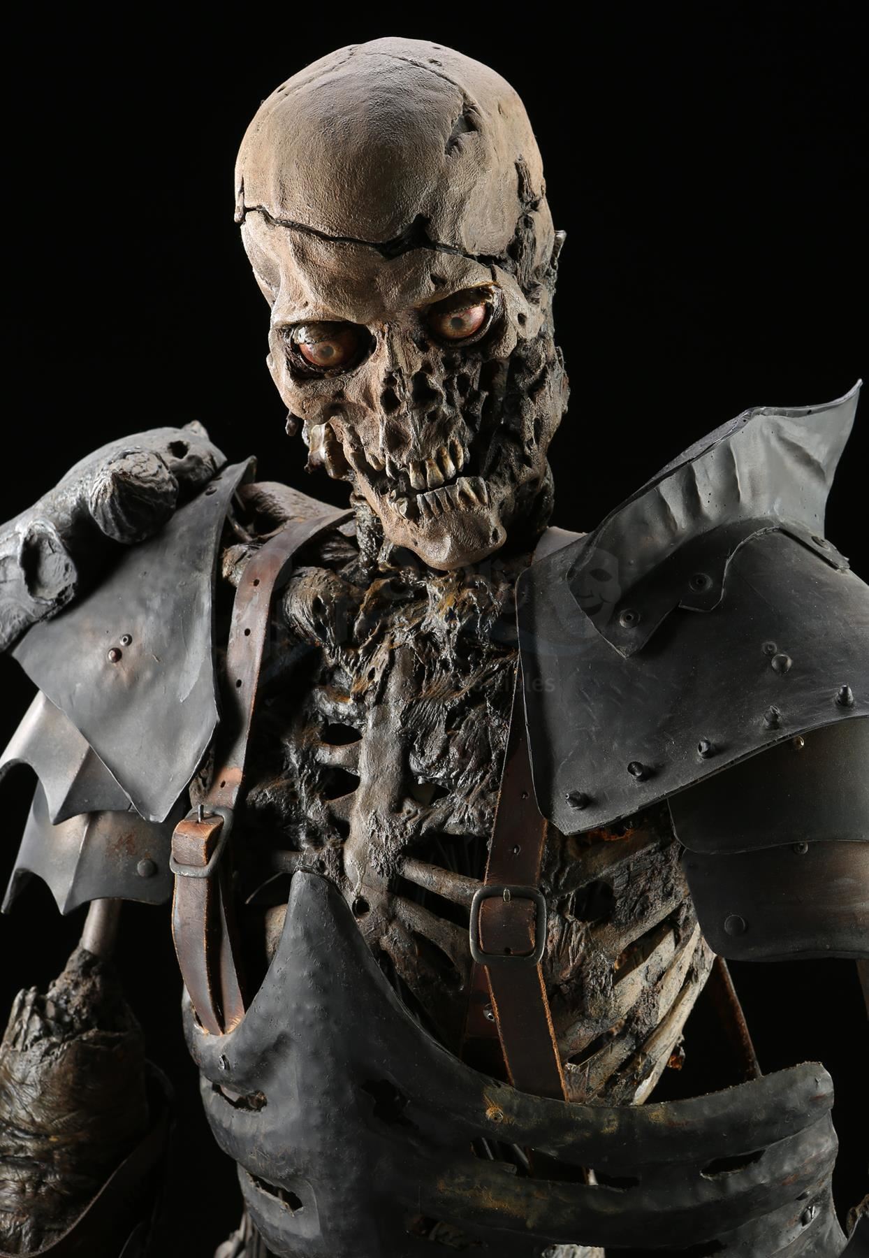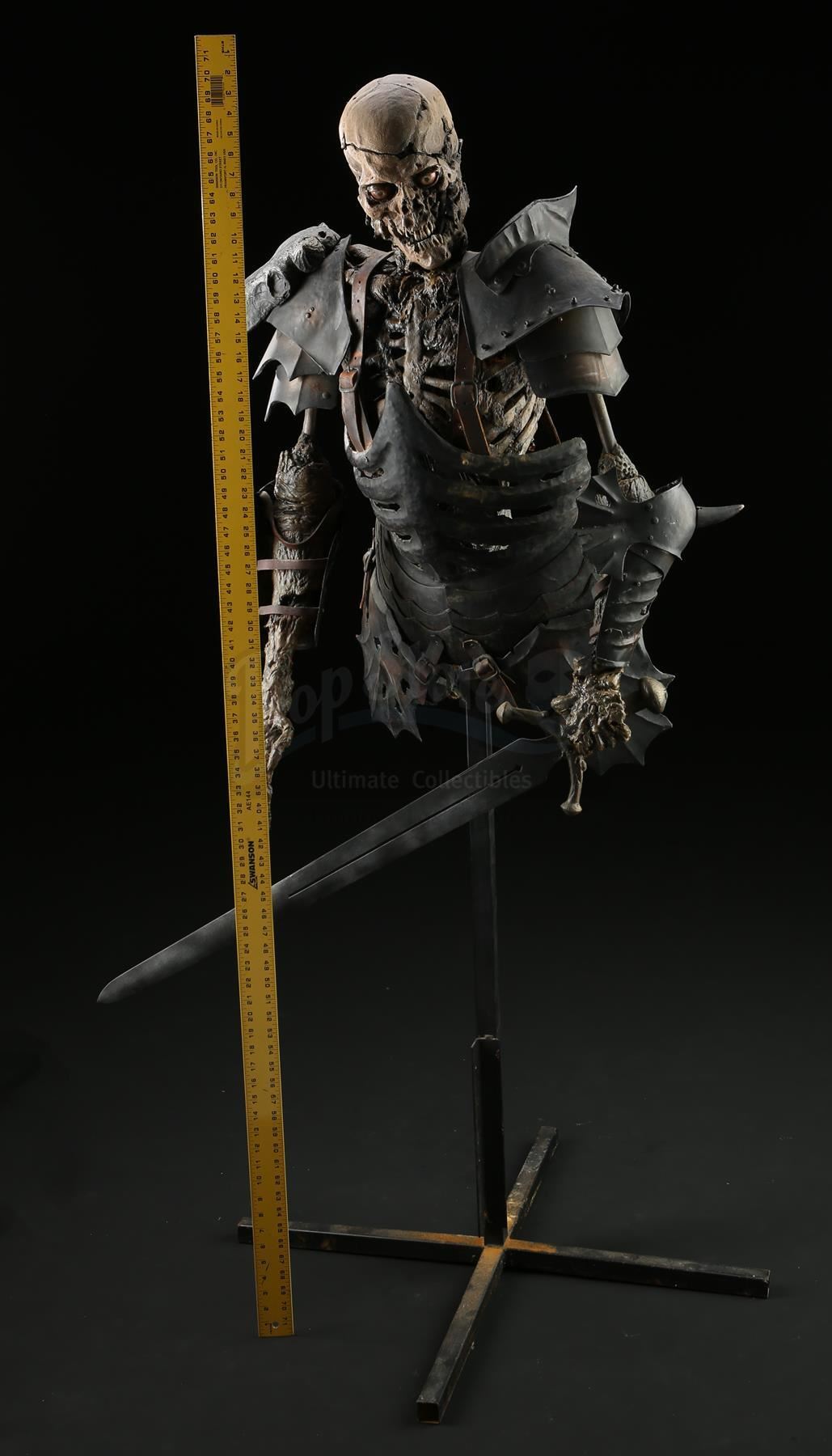 The puppet consists of a foam latex skin with fiberglass bones over a metallic inner structure. The torso is dressed in various armor components made of vacuum-formed plastic, rigid foam and resin. The armor is attached to the puppet with leather straps. Evil Ash carries a resin sword in his left hand. The head was designed with articulating facial features, allowing for controlled movement to the eyes, jaws and neck. Cable controls lead from the interior of the skull and down the spine, where they have been cut. The eyes were operated via radio control. The puppet rests on a steel frame with a cross base.
