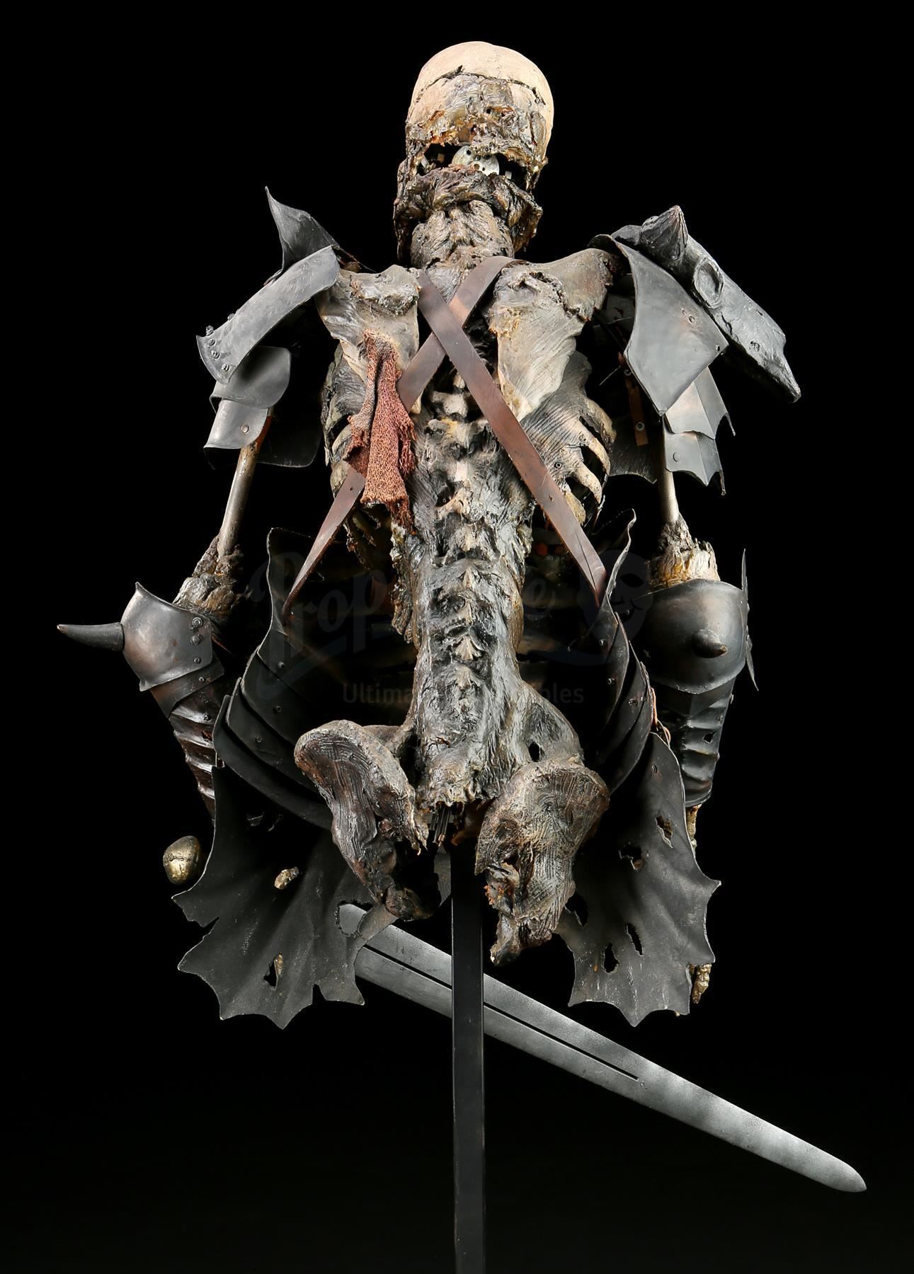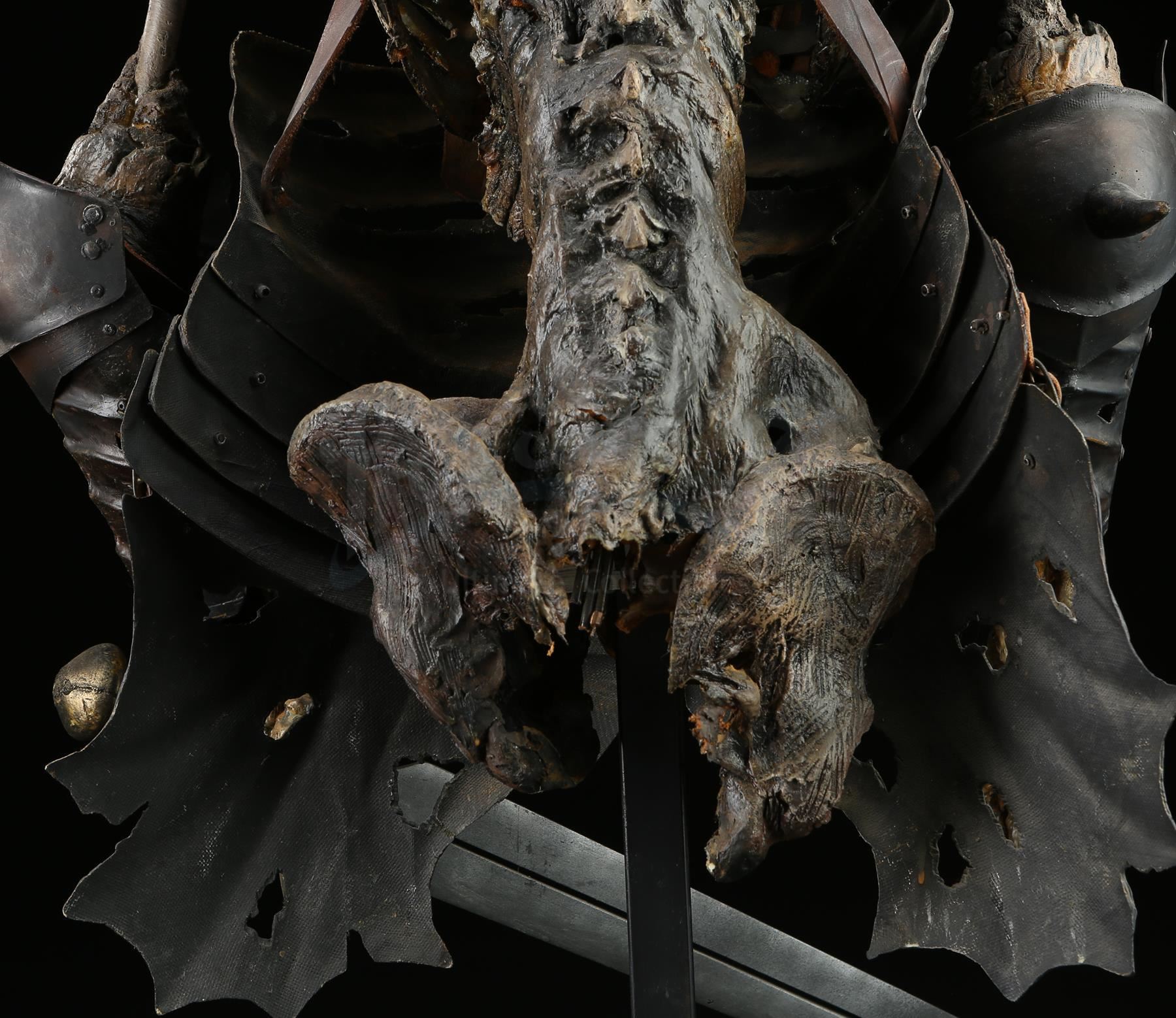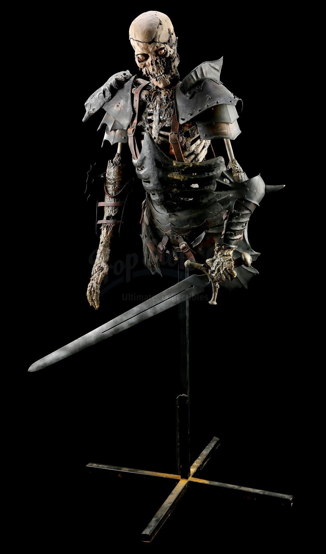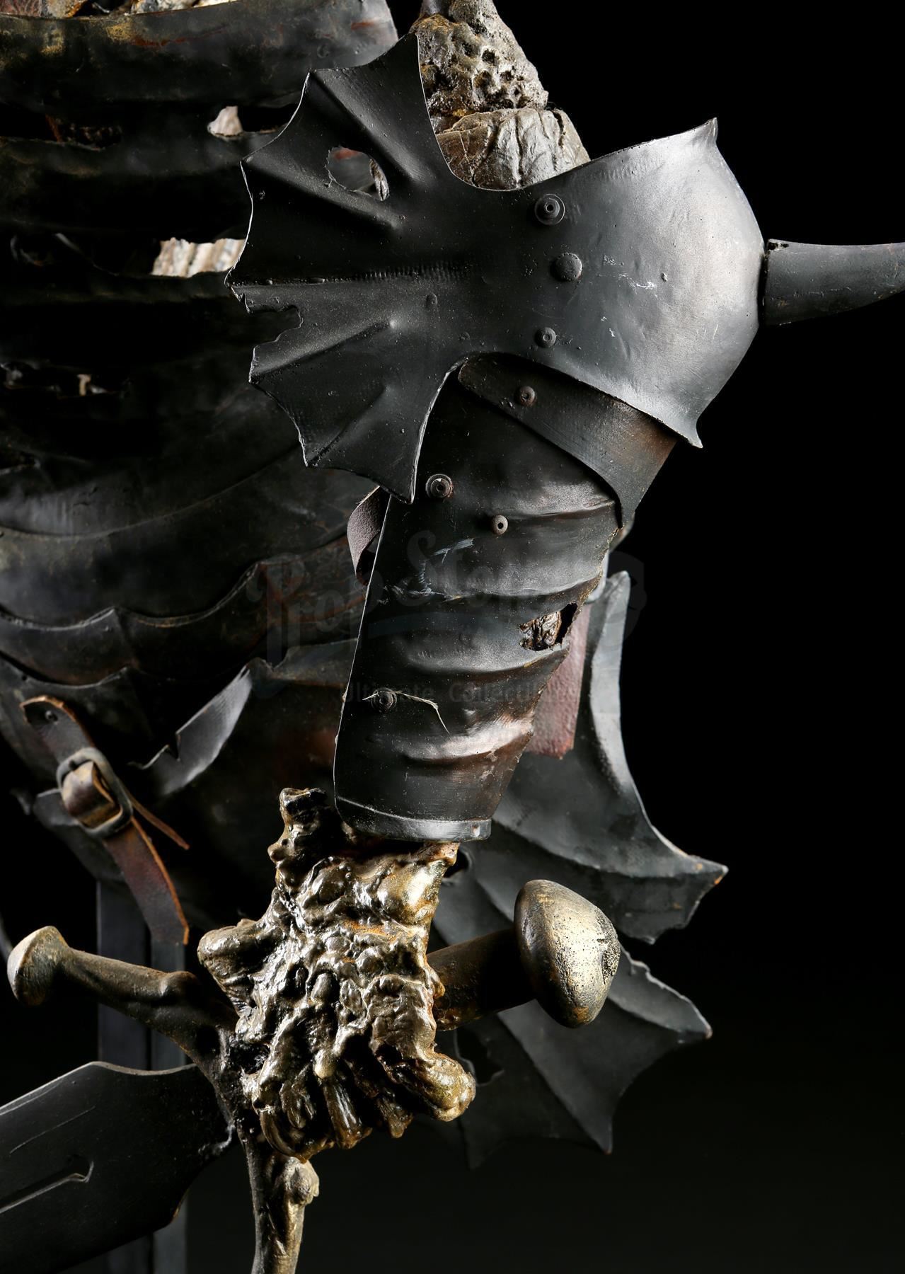 The puppet consists of a foam latex skin with fiberglass bones over a metallic inner structure. The torso is dressed in various armor components made of vacuum-formed plastic, rigid foam and resin. The armor is attached to the puppet with leather straps. Evil Ash carries a resin sword in his left hand. The head was designed with articulating facial features, allowing for controlled movement to the eyes, jaws and neck. Cable controls lead from the interior of the skull and down the spine, where they have been cut. The eyes were operated via radio control. The puppet rests on a steel frame with a cross base.