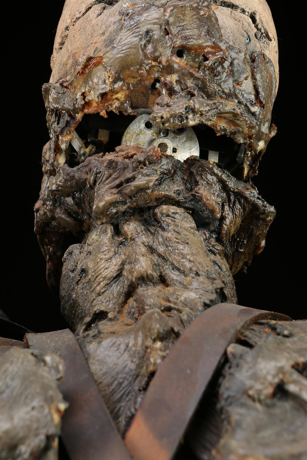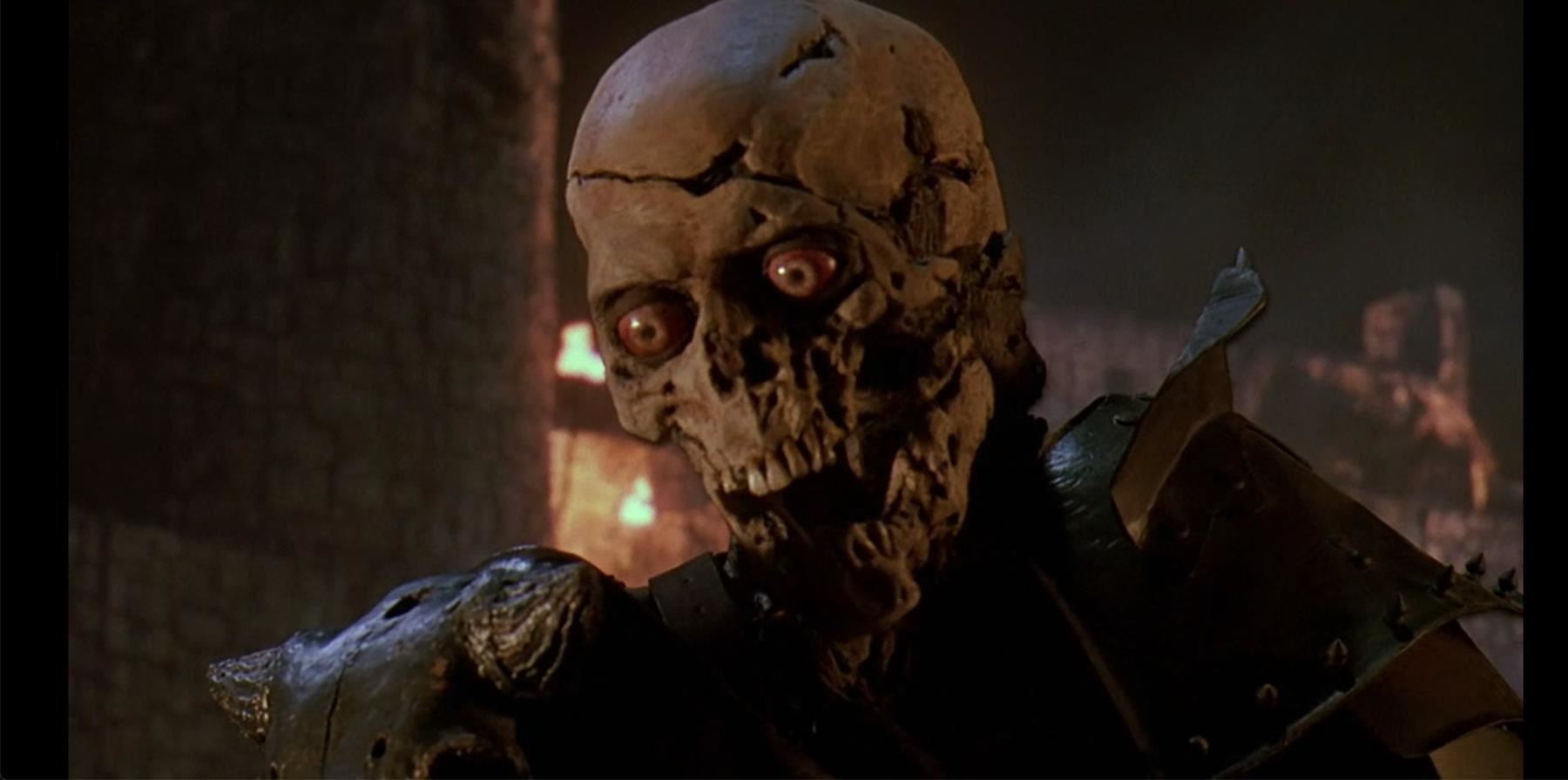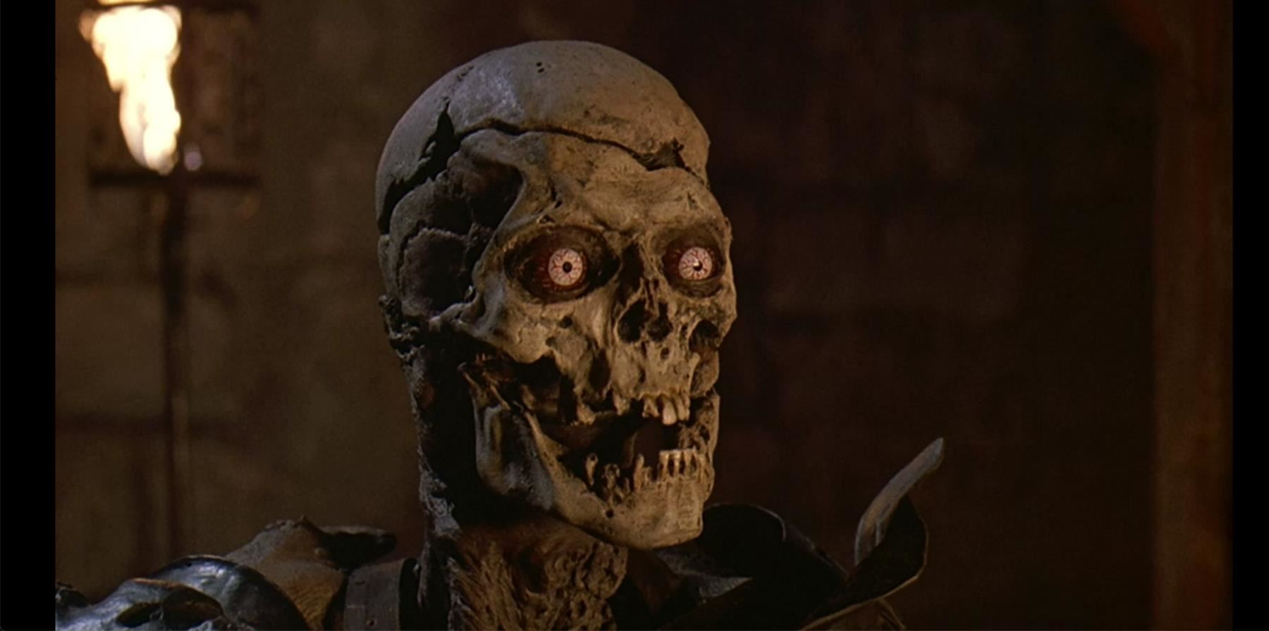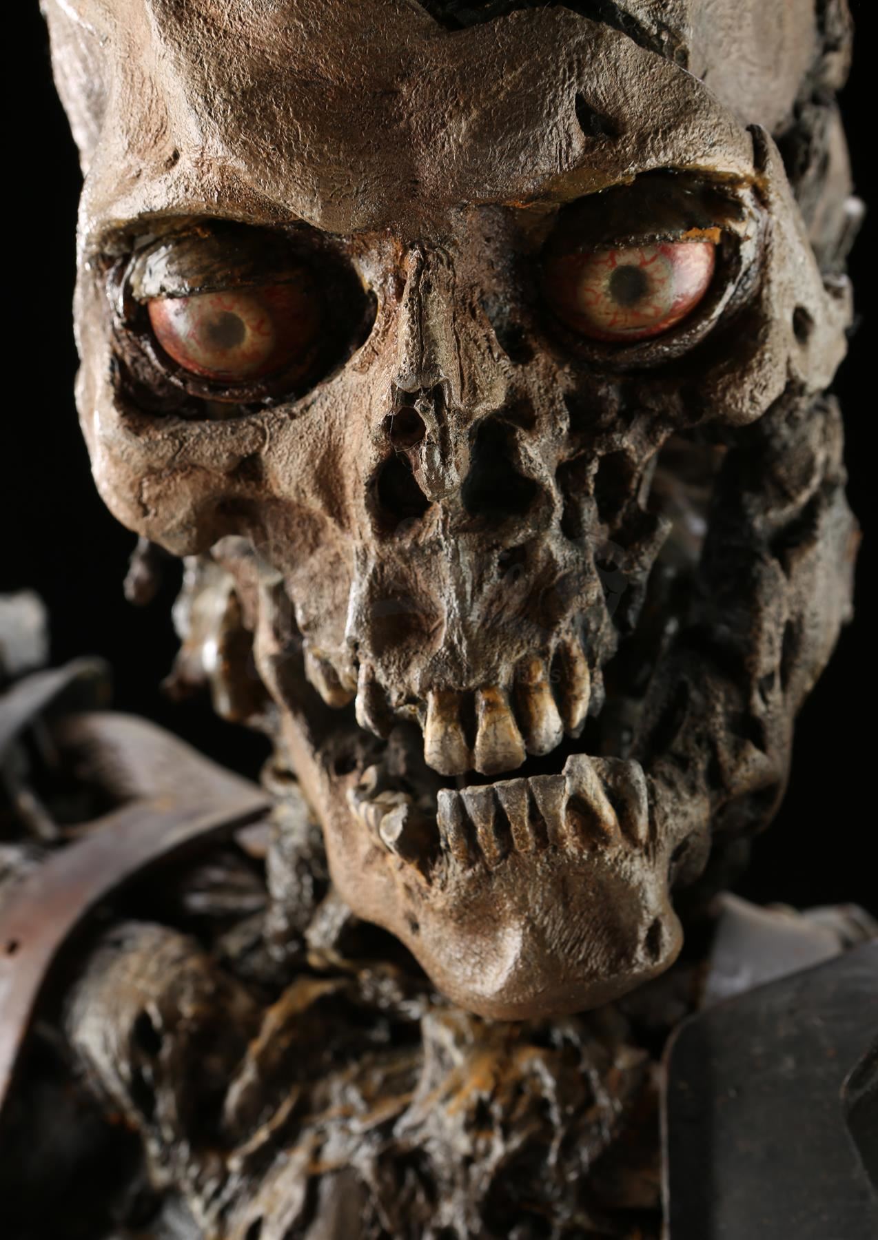 A full-size Evil Ash (Bruce Campbell) cable-controlled puppet from Sam Raimi's comedy horror sequel Army of Darkness. In the finale of the film, Ash Williams (Bruce Campbell) battles his evil deadite clone. This puppet is designed to reflect Evil Ash's skeletal state after his skin melted away, and was used for shots in which Evil Ash was seen from the torso up.