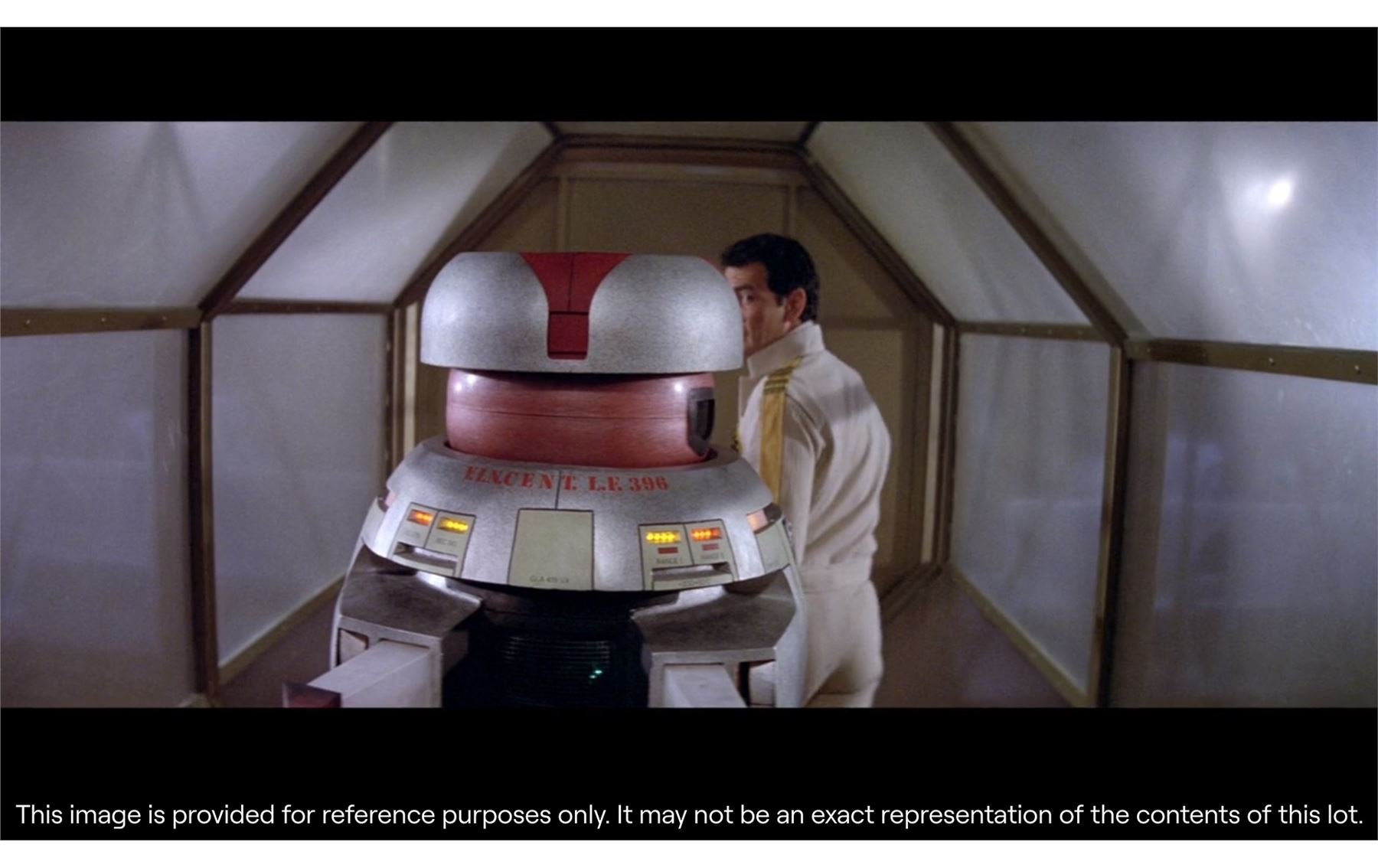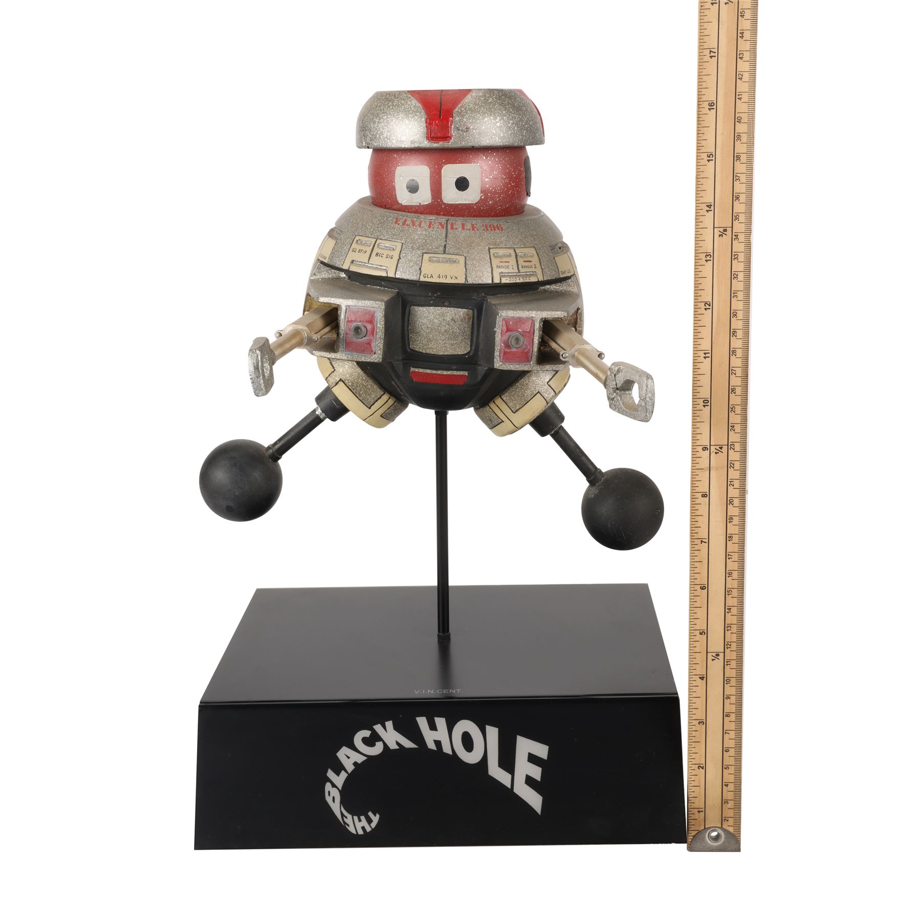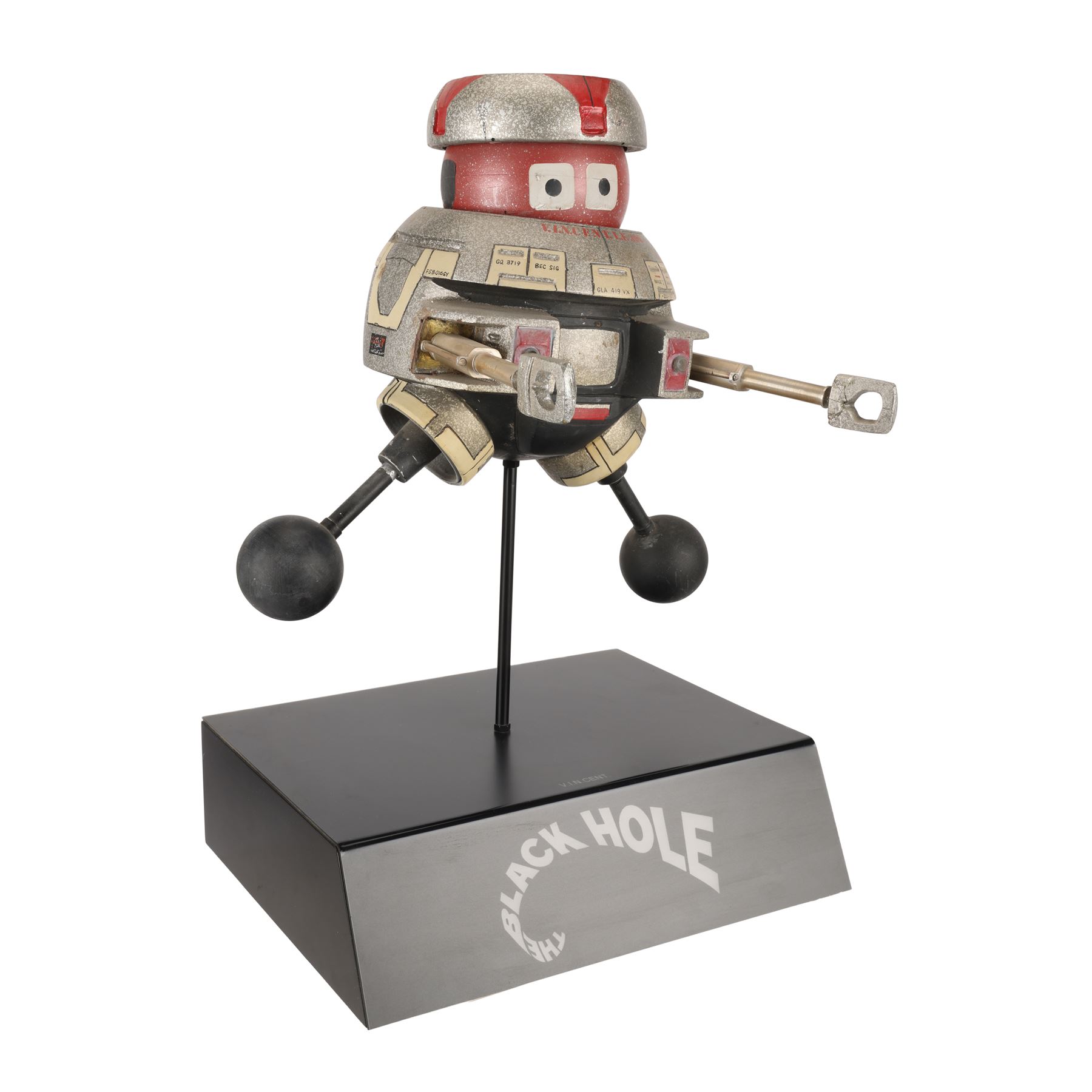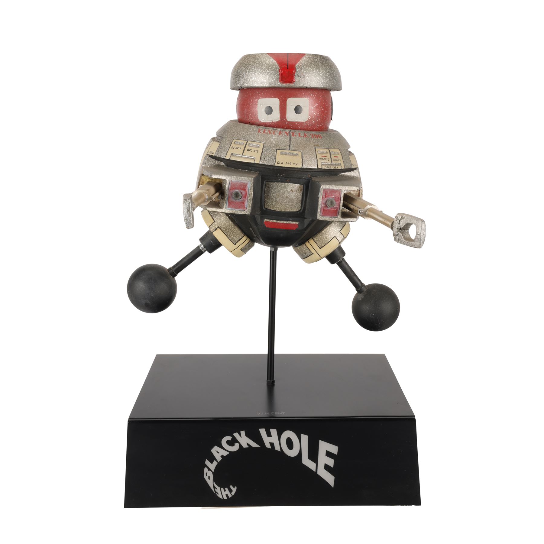 A V.I.N.CENT filming miniature from Gary Nelson's 1979 sci-fi film The Black Hole. V.I.N.CENT stands for "Vital Information Necessary CENTralized". It was designed by Disney Imagineer George McGinnis and voiced by Roddy McDowall (uncredited). V.I.N.CENT served as a utility robot on the USS Palomino, and befriended a similar robot called B.O.B. (voiced by Slim Pickens) after boarding the USS Cygnus.