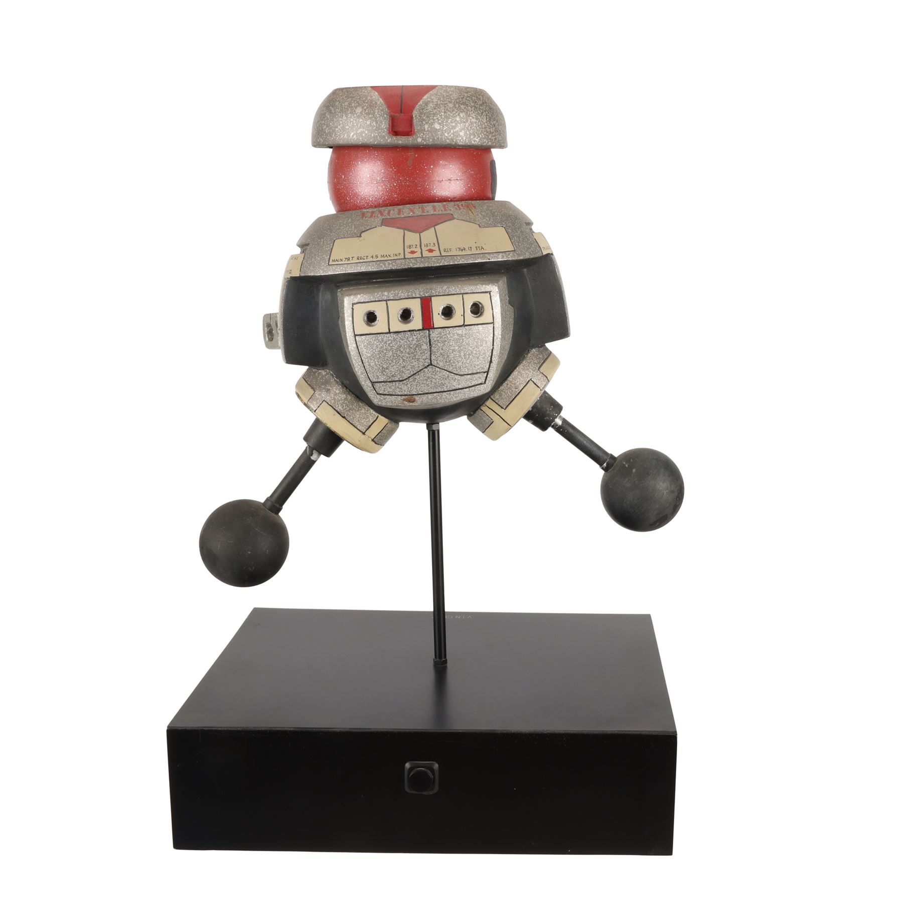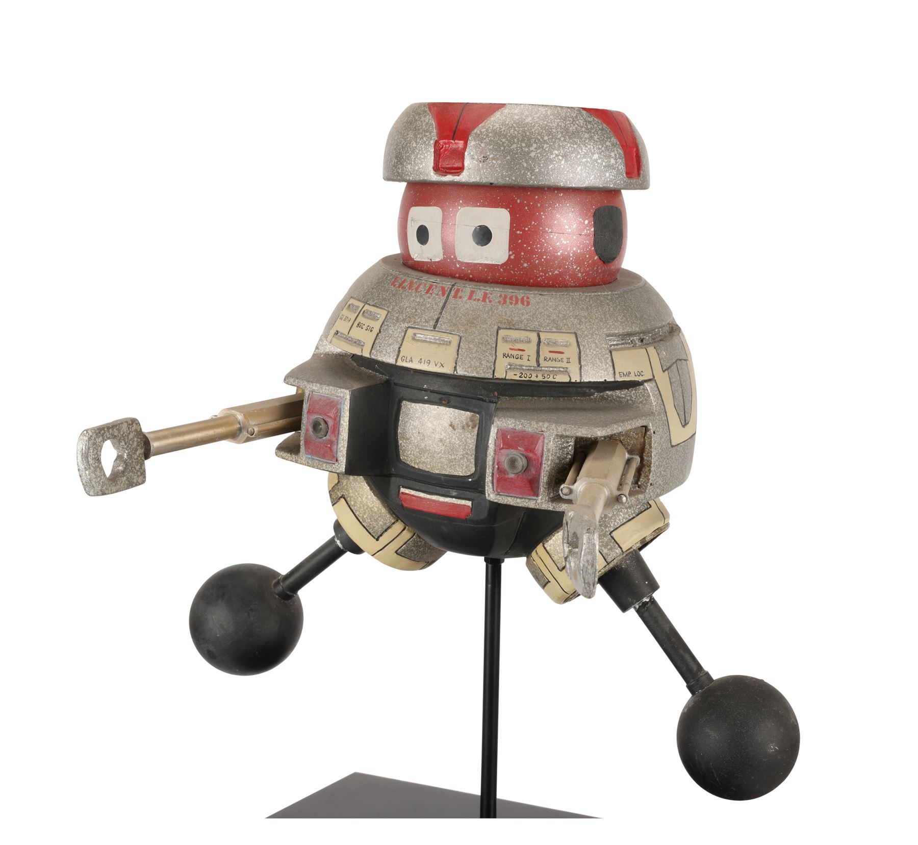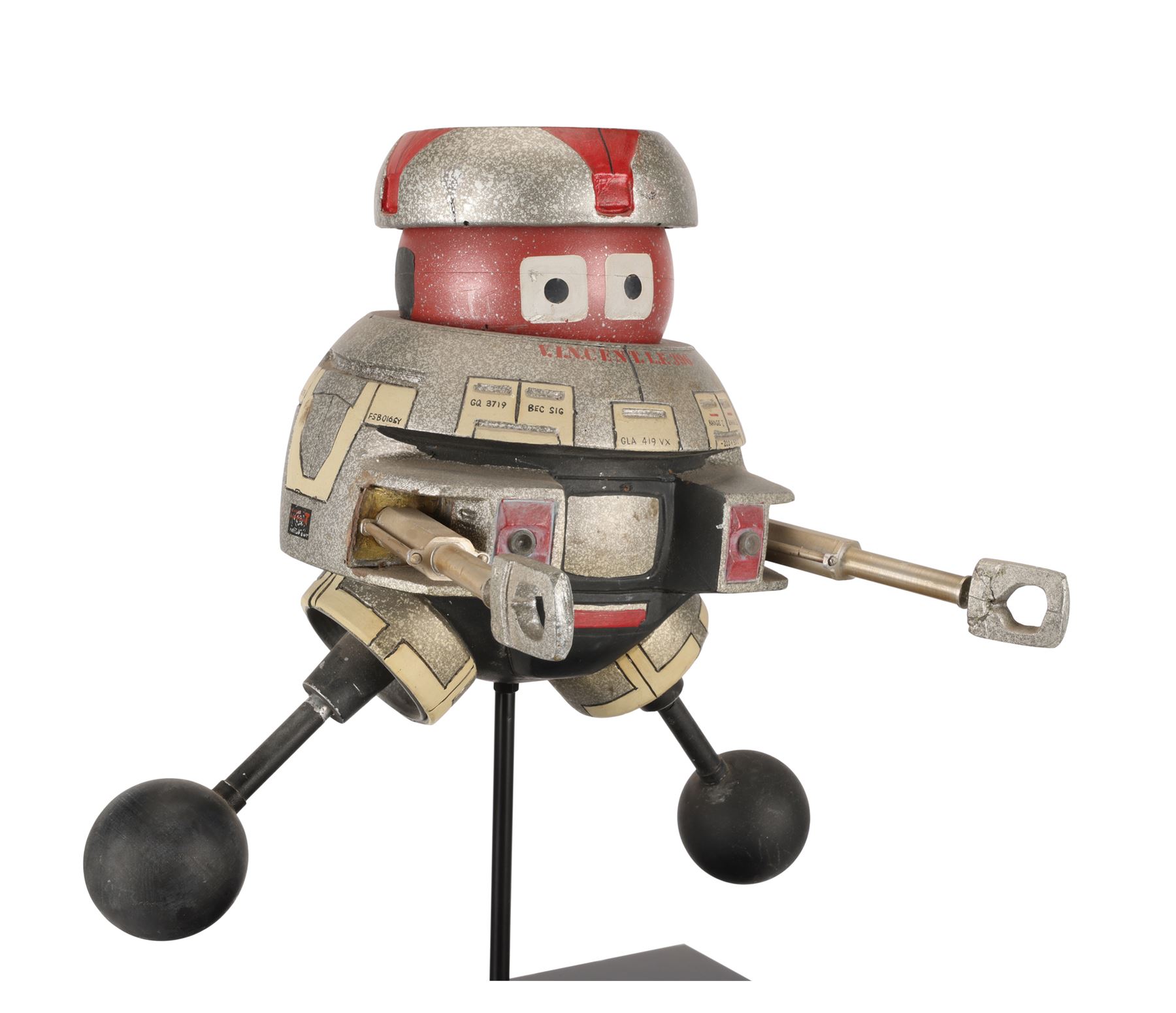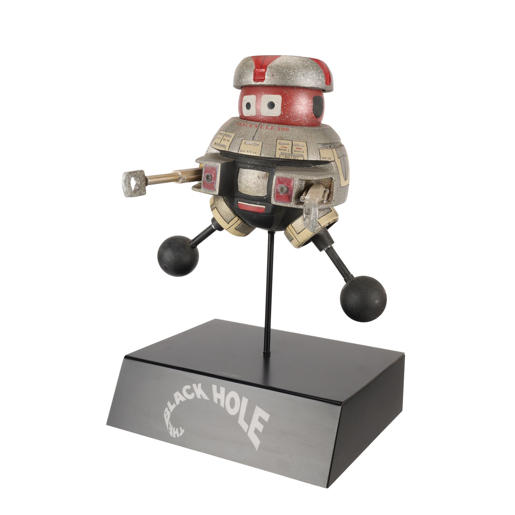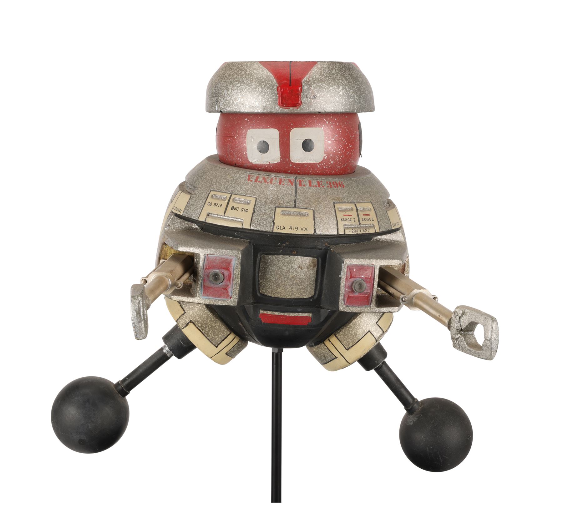 This filming miniature is carefully crafted to resemble the full-scale model. Made of resin, it is expertly painted red, marbled grey, cream and black. It features a barrel-shaped torso, dual arm and leg appendages, a spherical head and a flat headpiece. There are four lateral holes across the back, and the robot's familiar square-shaped eyes are painted on the head. Technical data is written across faux panels on the torso, and the name "V.I.N.CENT L.F.396" is stencilled in red on the front and back.