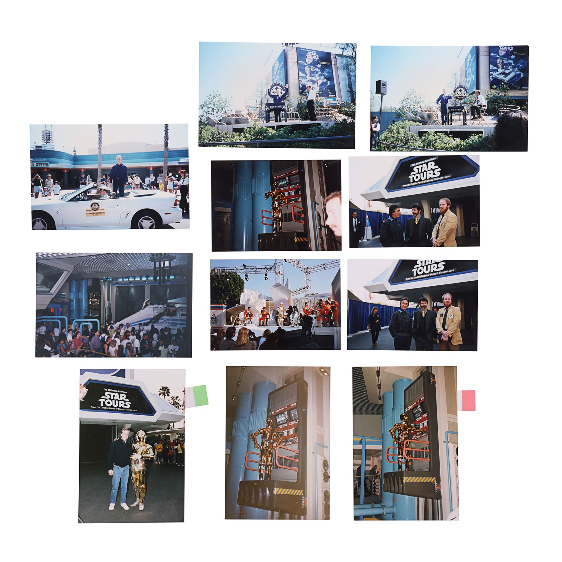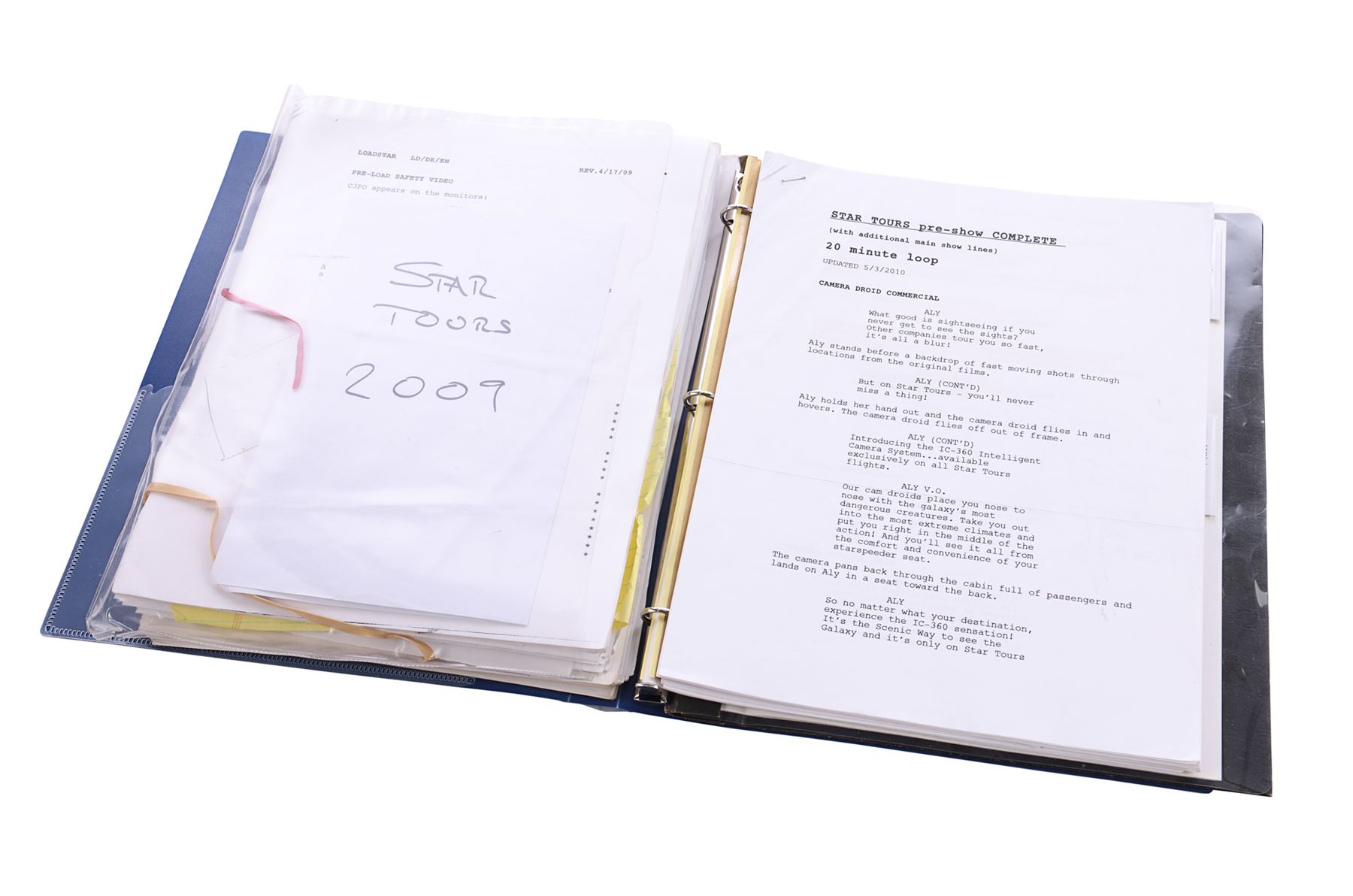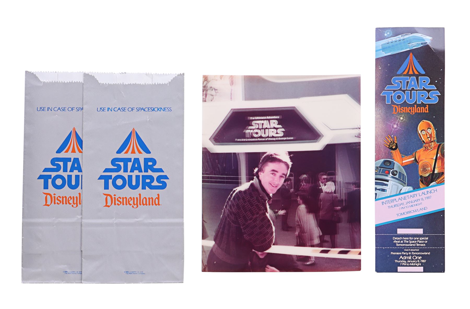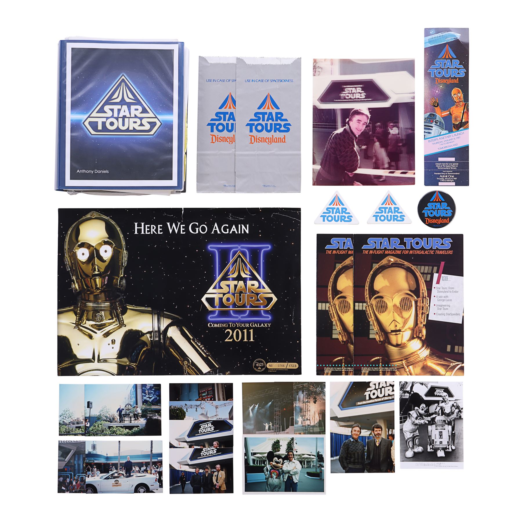 A collection of items related to the Disney theme-park ride Star Tours. This lot includes several scripts - in English and French - hand-annotated by Anthony Daniels; hand-annotated ADR cue sheets; photographs of Daniels at Disneyland, including several alongside George Lucas; a lenticular photograph of Daniels; a ticket to the 1987 premiere; a pair of "Spacesickness" sick bags; a pair of stickers and a badge; and additional paraphernalia. Dimensions (scripts): 30 cm x 25 cm x 4 cm (11 3/4" x 9 3/4" x 1 1/2")