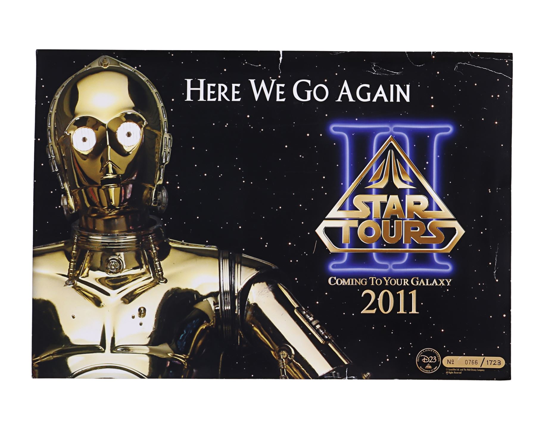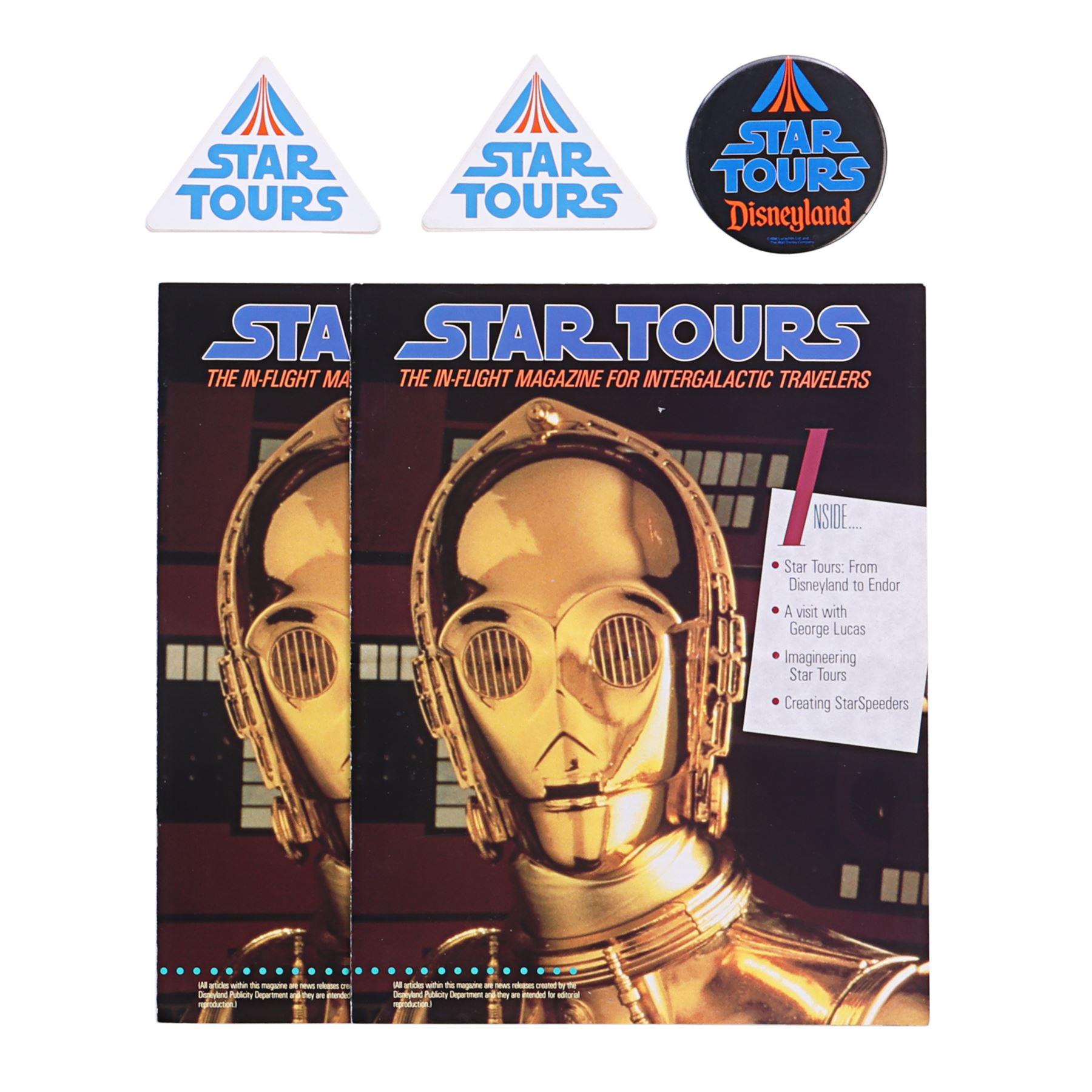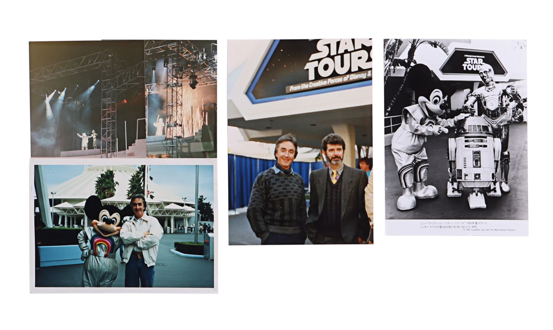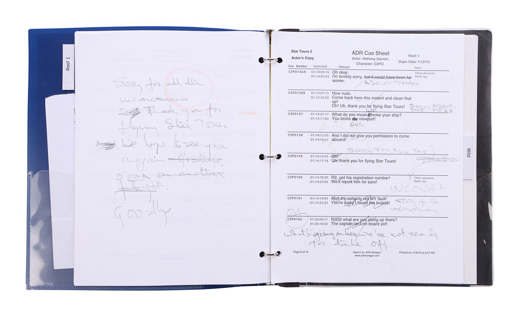 A collection of items related to the Disney theme-park ride Star Tours. This lot includes several scripts - in English and French - hand-annotated by Anthony Daniels; hand-annotated ADR cue sheets; photographs of Daniels at Disneyland, including several alongside George Lucas; a lenticular photograph of Daniels; a ticket to the 1987 premiere; a pair of "Spacesickness" sick bags; a pair of stickers and a badge; and additional paraphernalia. Dimensions (scripts): 30 cm x 25 cm x 4 cm (11 3/4" x 9 3/4" x 1 1/2")