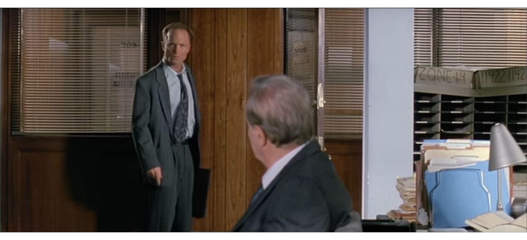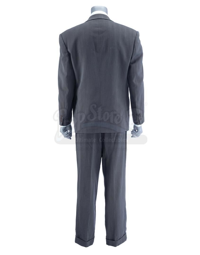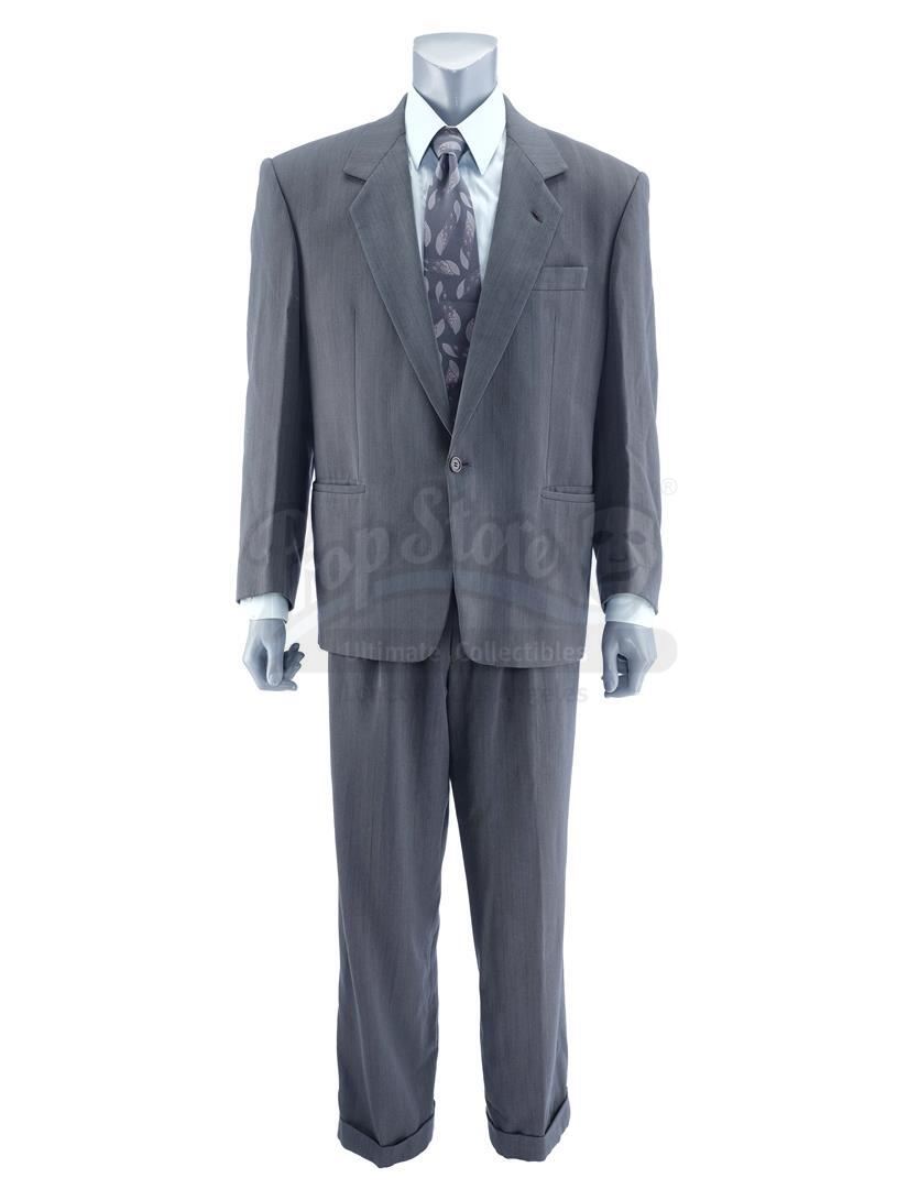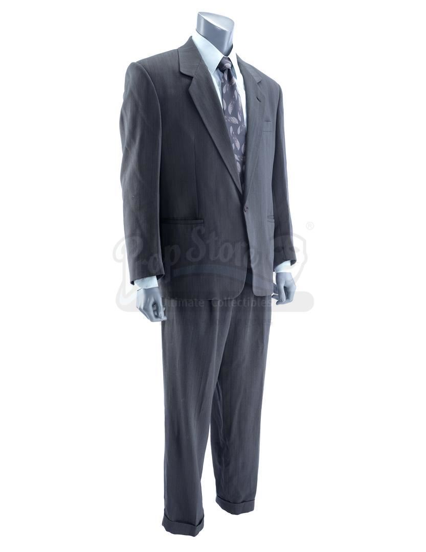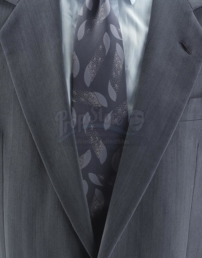 This lot will be auctioned on Wednesday, June 30th. The auction will begin at 9:00am PDT and lots are sold sequentially via live auctioneer; tune in to the live streaming broadcast on auction day to follow the pace. Note other lots in the auction may close on June 29th or July 1st. Dave Moss' (Ed Harris) costume from James Floey's drama Glengarry Glen Ross. Beleaguered real estate salesman Moss wore his costume while being interrogated by the police after a break-in the night before at his office where he argued with fellow salesman Ricky Roma (Al Pacino). This costume consists of dark gray wool and polyester blend striped suit jacket with matching pants, a light blue cotton button-up dress shirt, and a dark gray silk blend tie with cylindrical gray details. The costume is in good overall condition with "B" on the interior by production and minor scuffs throughout from wear. Estimate: $2,000 - 3,000