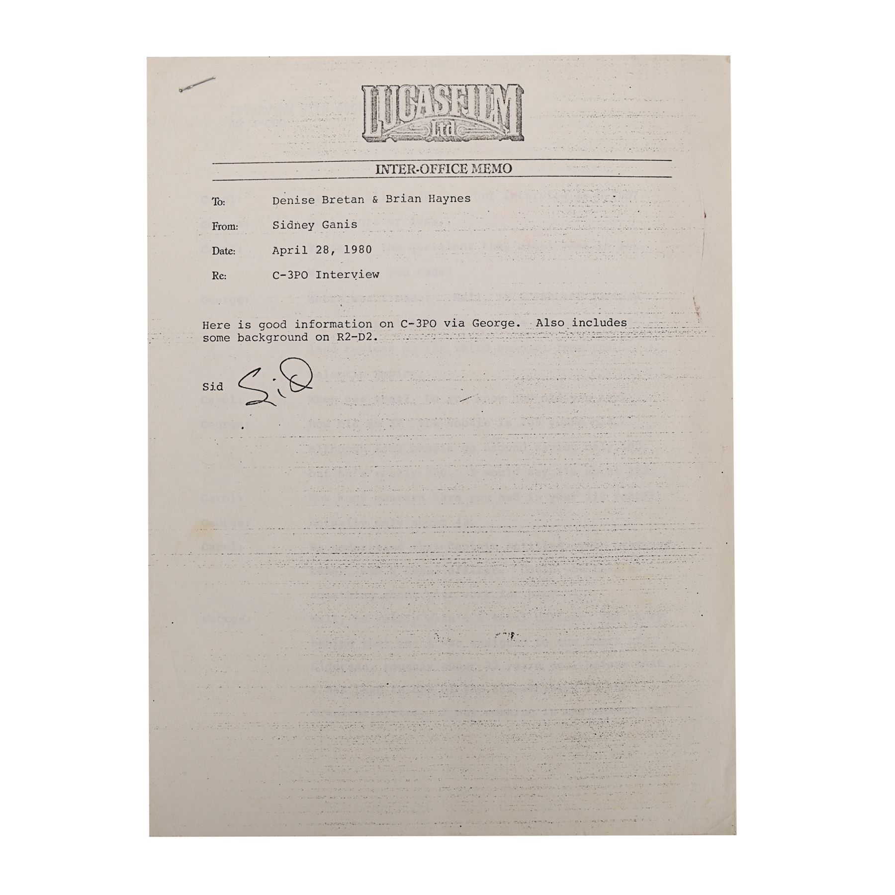 The interview is accompanied by a memo - dated "April 28, 1980" - from Sid Ganis, who was responsible for marketing The Empire Strikes Back and Return of the Jedi. There is a typo at the top of the first page, with C-3PO referred to as "3-CPO". Dimensions: 28 cm x 21.5 cm (11" x 8 1/2")