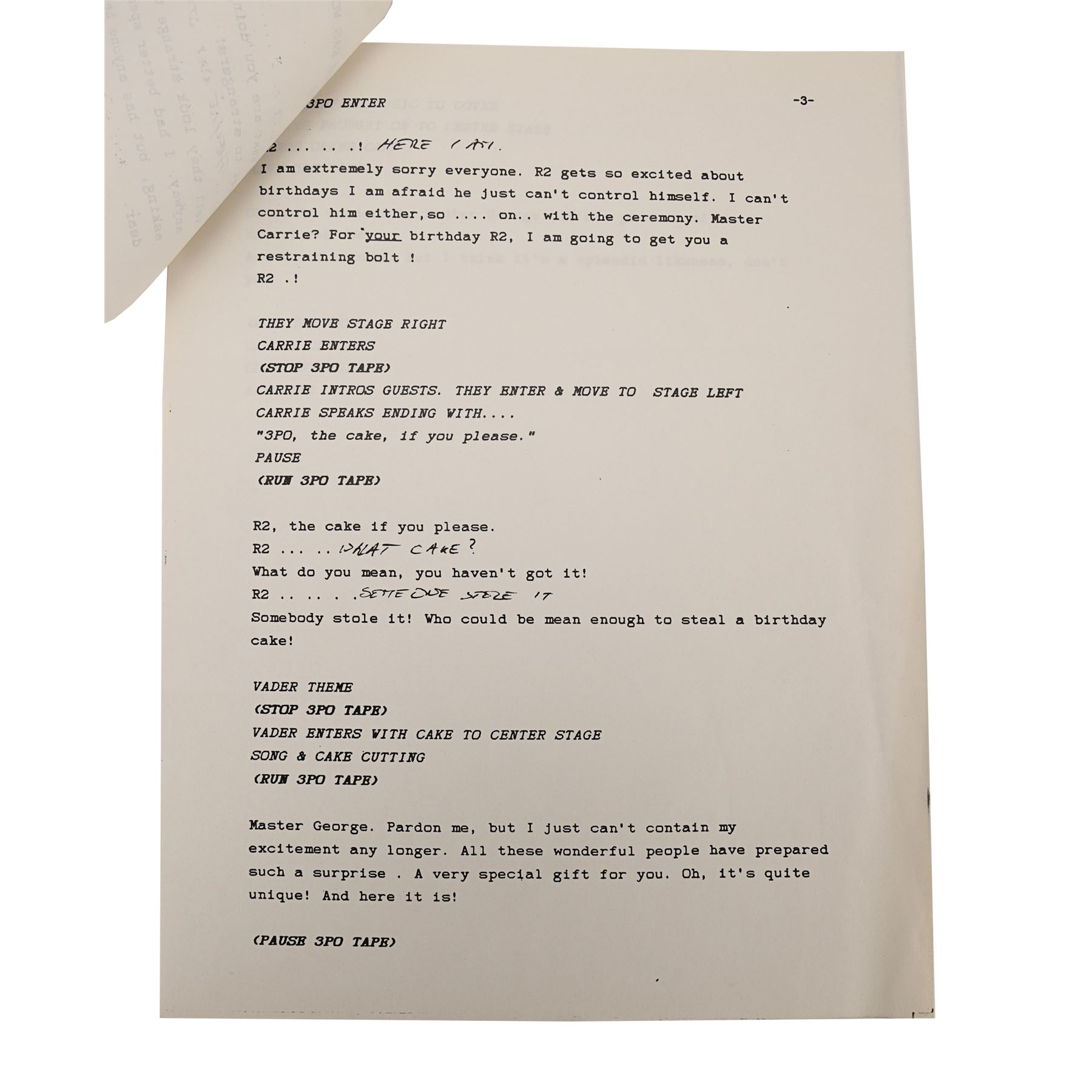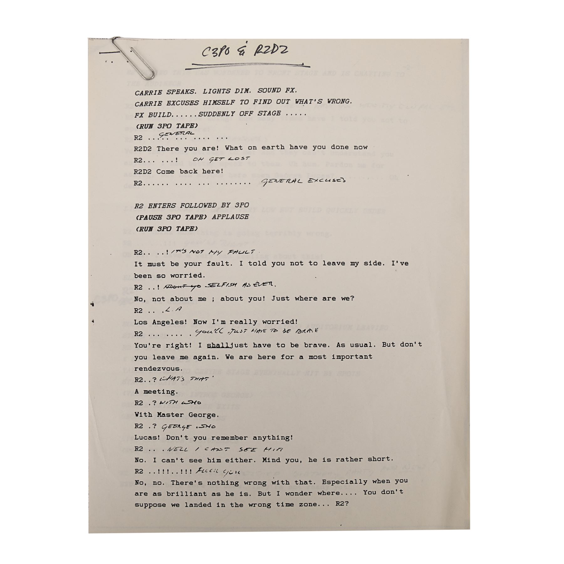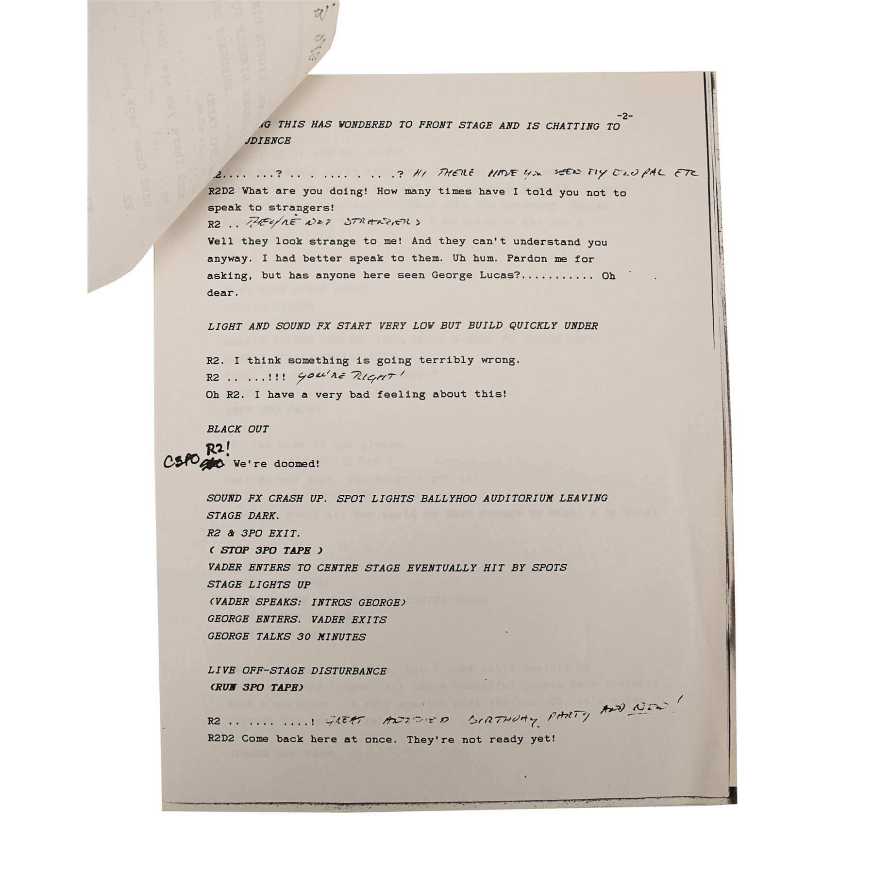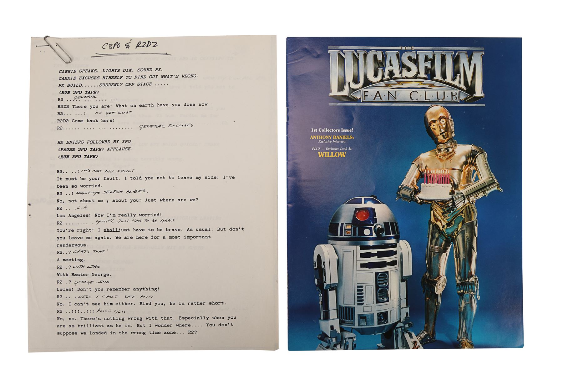 Daniels wrote the script for C-3PO and R2-D2 at Starlog Salutes Star Wars, aka the 10th Anniversary Convention, at the Stouffer Concourse Hotel in LA, 23-25 May 1987. The script is four pages long and has printed handwritten translations for R2-D2's lines. It is accompanied by a copy of the "1st Collectors" issue of the Lucasfilm Fan Club magazine, published in October 1987, which features an interview with Daniels. Dimensions (script): 28 cm x 21.5 cm (11" x 8 1/2")