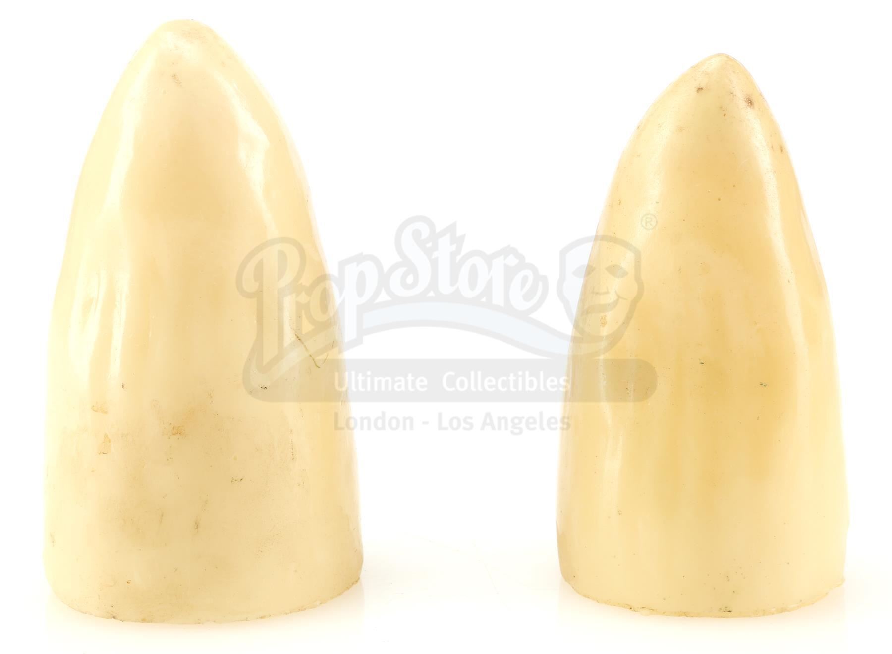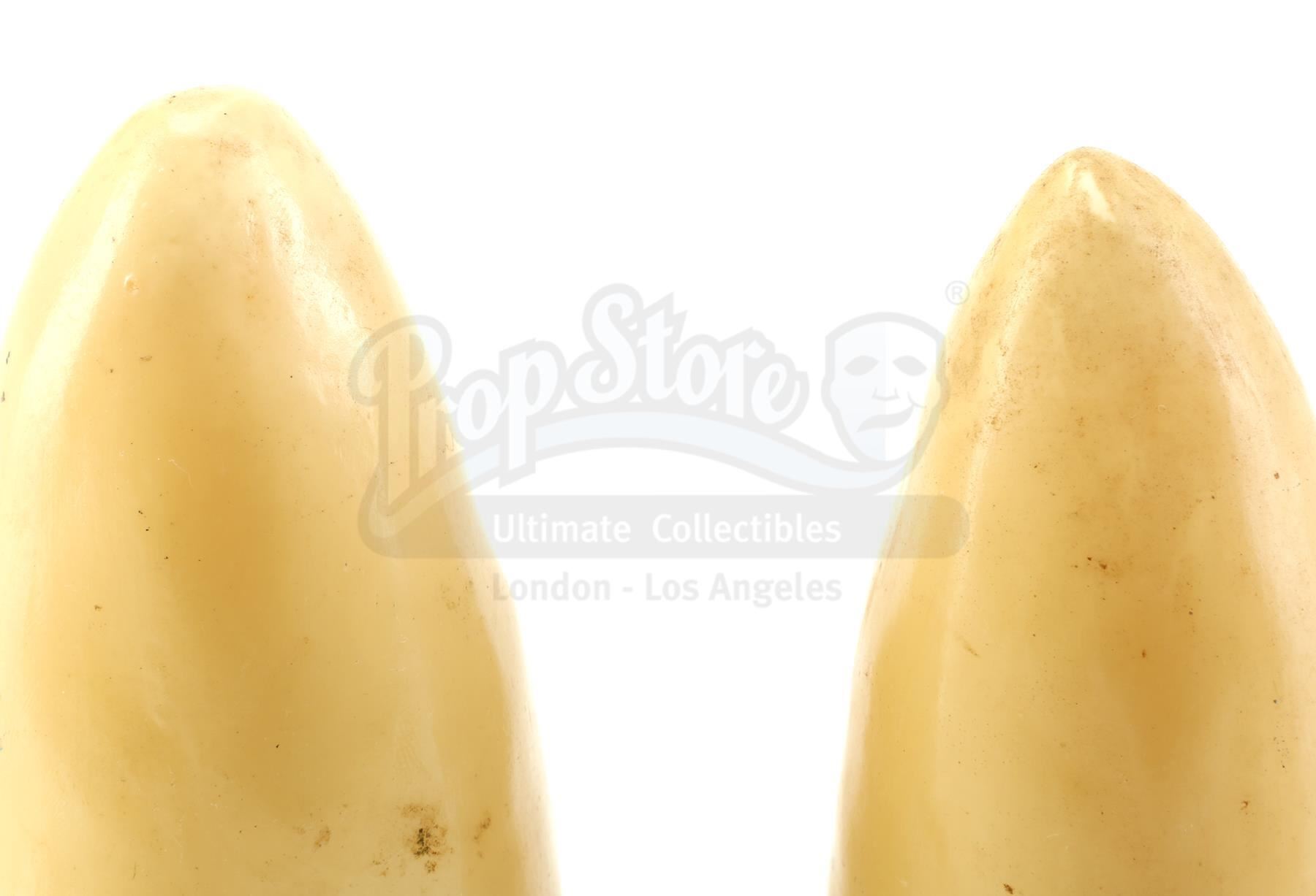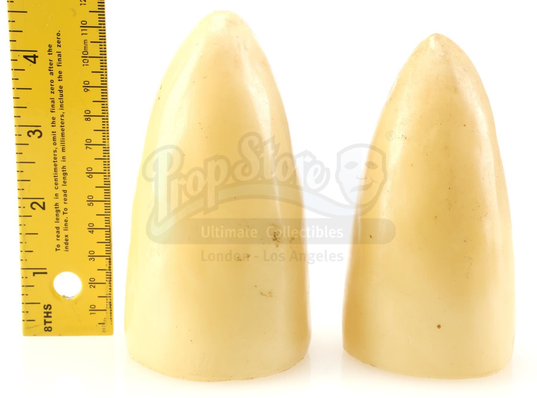 A pair of slug teeth from Irvin Kershner's Star Wars: The Empire Strikes Back. With TIE fighters hot on their trail, Han Solo (Harrison Ford) and Chewbacca (Peter Mayhew) accidentally hid the Millennium Falcon in the mouth of a colossal space slug, barely escaping before its teeth could crush the ship.
