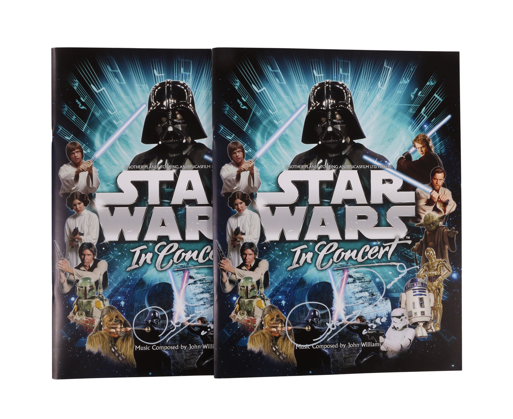 The lot includes items related to Star Wars in Concert shows, including an autographed and annotated script (in English and Japanese); eight tickets (five autographed by Anthony Daniels); an autographed poster; four large autographed Japanese booklets; and an autographed flyer. Also included are an autographed booklet from The Art of Star Wars exhibition and five autographed empty folders from the Star Wars - Where Science Meets Imagination exhibition. Dimensions (large booklets): 39.5 cm x 30.5 cm (15 1/2" x 12")