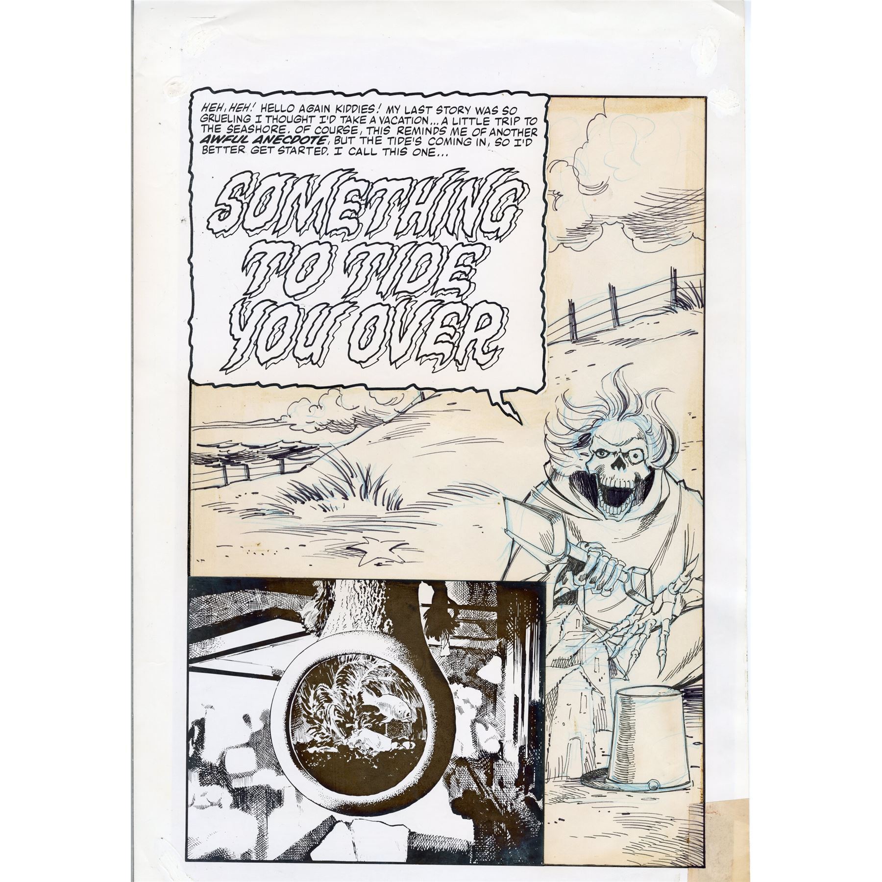 CREEPSHOW (1982) - Hand-Drawn Ron Frenz Transition "Something to Tide You Over" Comic Artwork - A hand-drawn Ron Frenz transition "Something to Tide You Over" comic artwork from George A. Romero's fantasy-horror film Creepshow. At the end of "The Lonesome Death of Jordy Verrill," the skeletal ghost Creep addressed the reader in transition to the next segment "Something To Tide You Over." This hand-drawn comic features Creep in black and blue lines making a sand castle with a printed comic panel and Creep's printed speech bubble. The comic panel and speech bubble are glued over the hand-drawn comic. Along the footer of the printed page are handwritten notes "1 5/5 1 5 3/4 WIDE" and "56 1/2." This lot exhibits white-out residue around the border and discoloration from glue residue. Dimensions: 12" x 18" (30.5 cm x 45.75 cm)