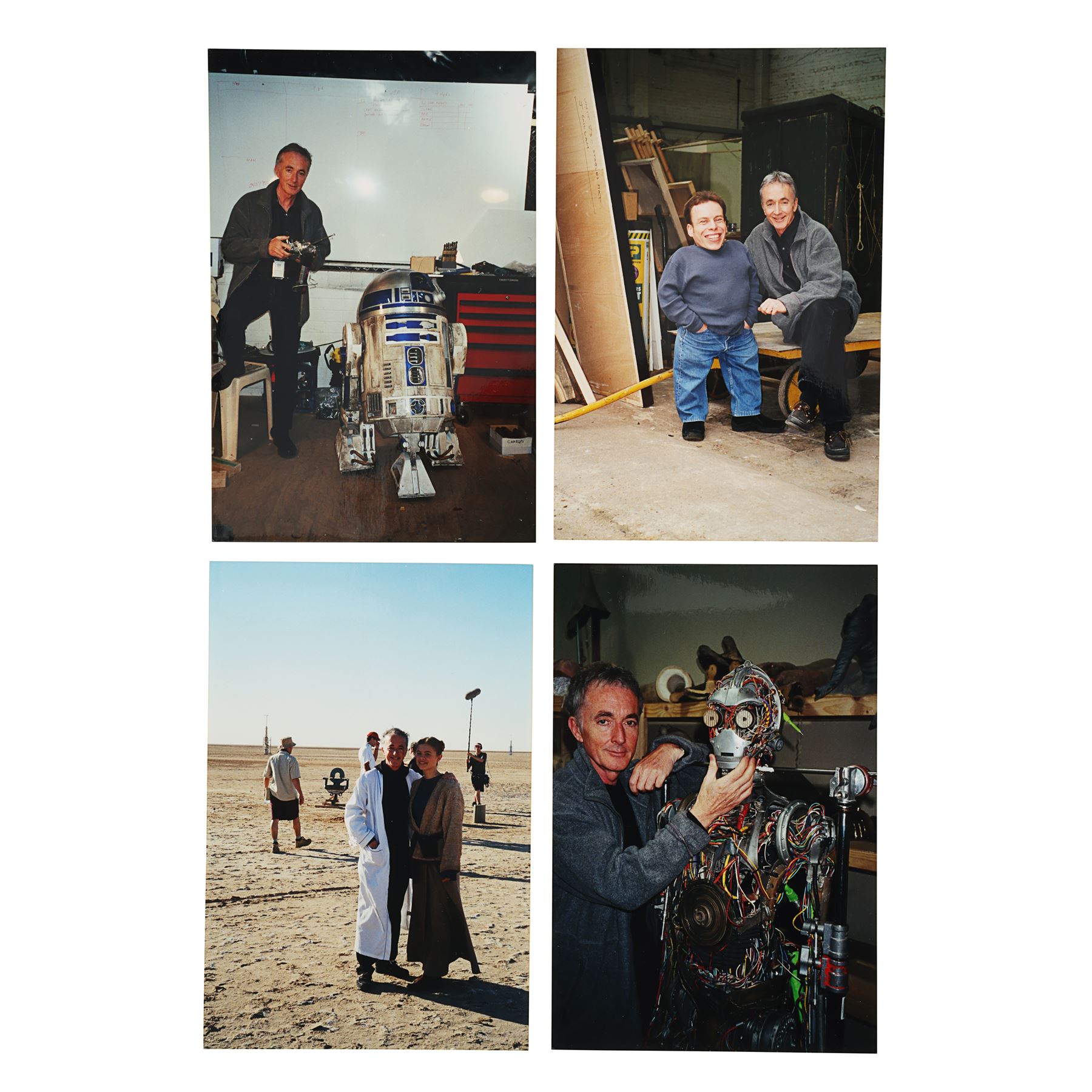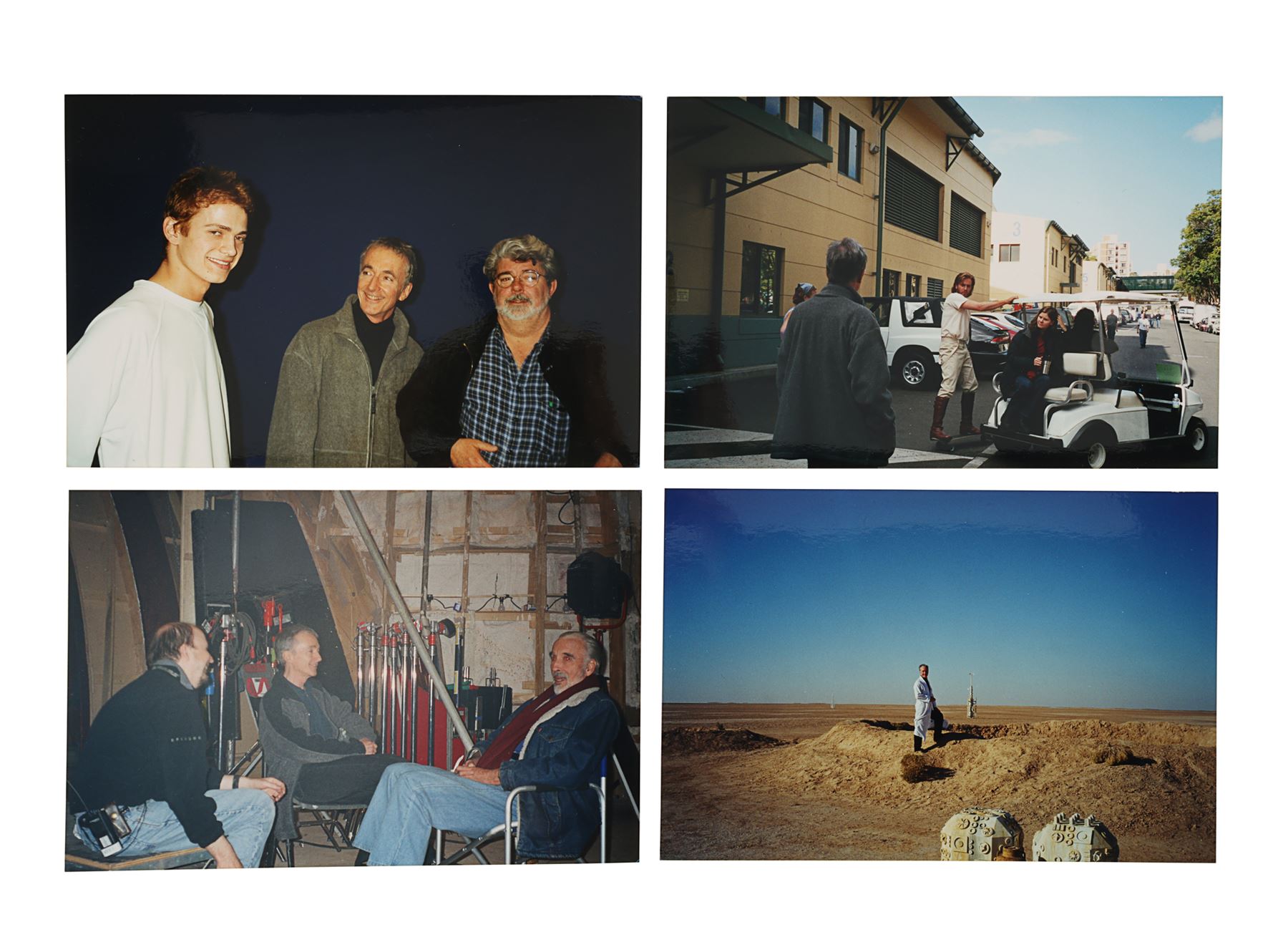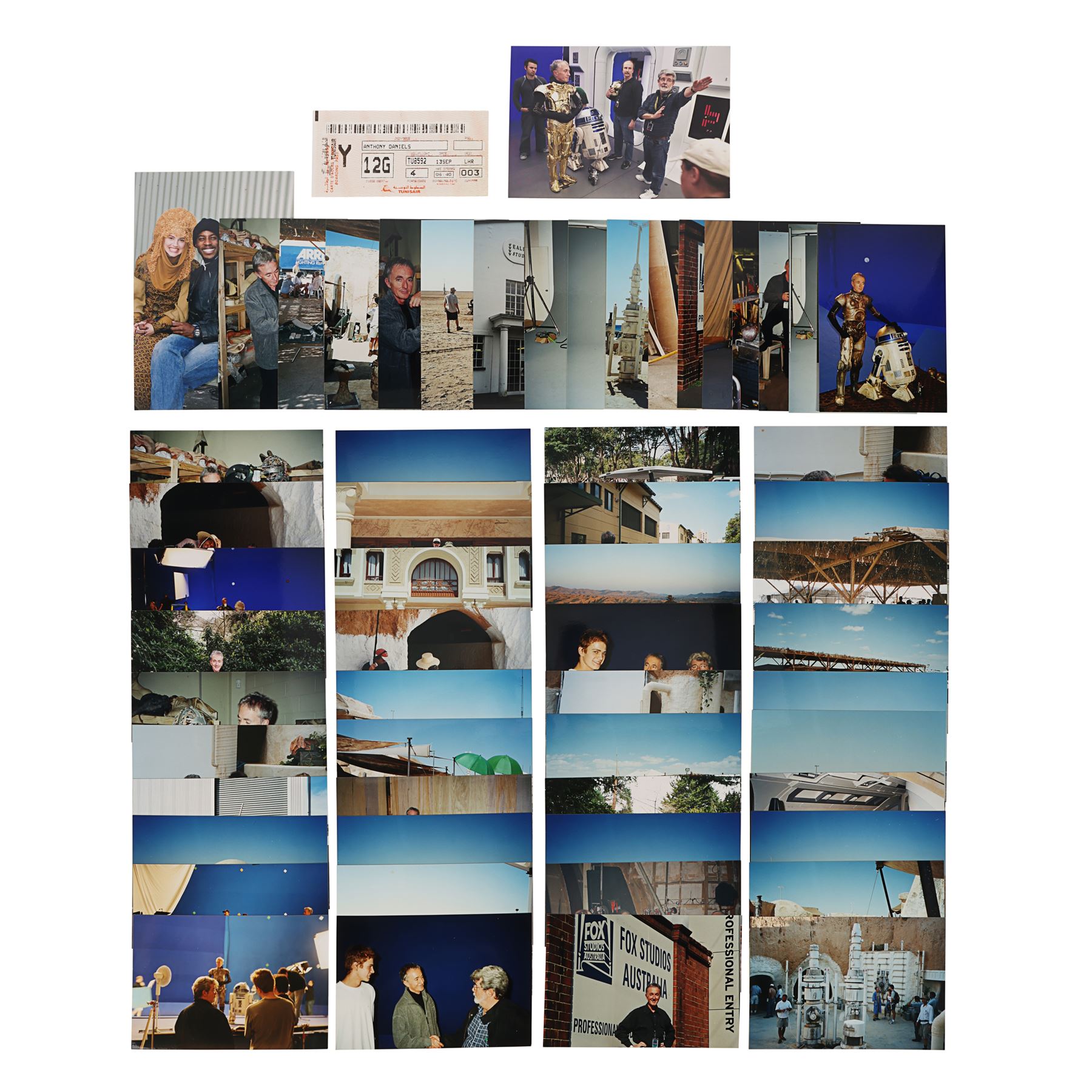Anthony Daniels' personal on-set photographs and a plane ticket from the production of George Lucas' Star Wars: Attack of the Clones. This lot comprises 72 colour photographs taken behind the scenes of Lucas' second Star Wars prequel. Many feature Daniels himself, while some also show other members of the cast and crew, including Lucas, Ewan McGregor, Christopher Lee, Hayden Christensen and Natalie Portman. Also included is Daniels' Tunisair plane ticket and an invitation to a pre-shoot drinks with an accompanying map to the venue. Dimensions (largest photo): 19 cm x 12.5 cm (7 1/2" x 5")