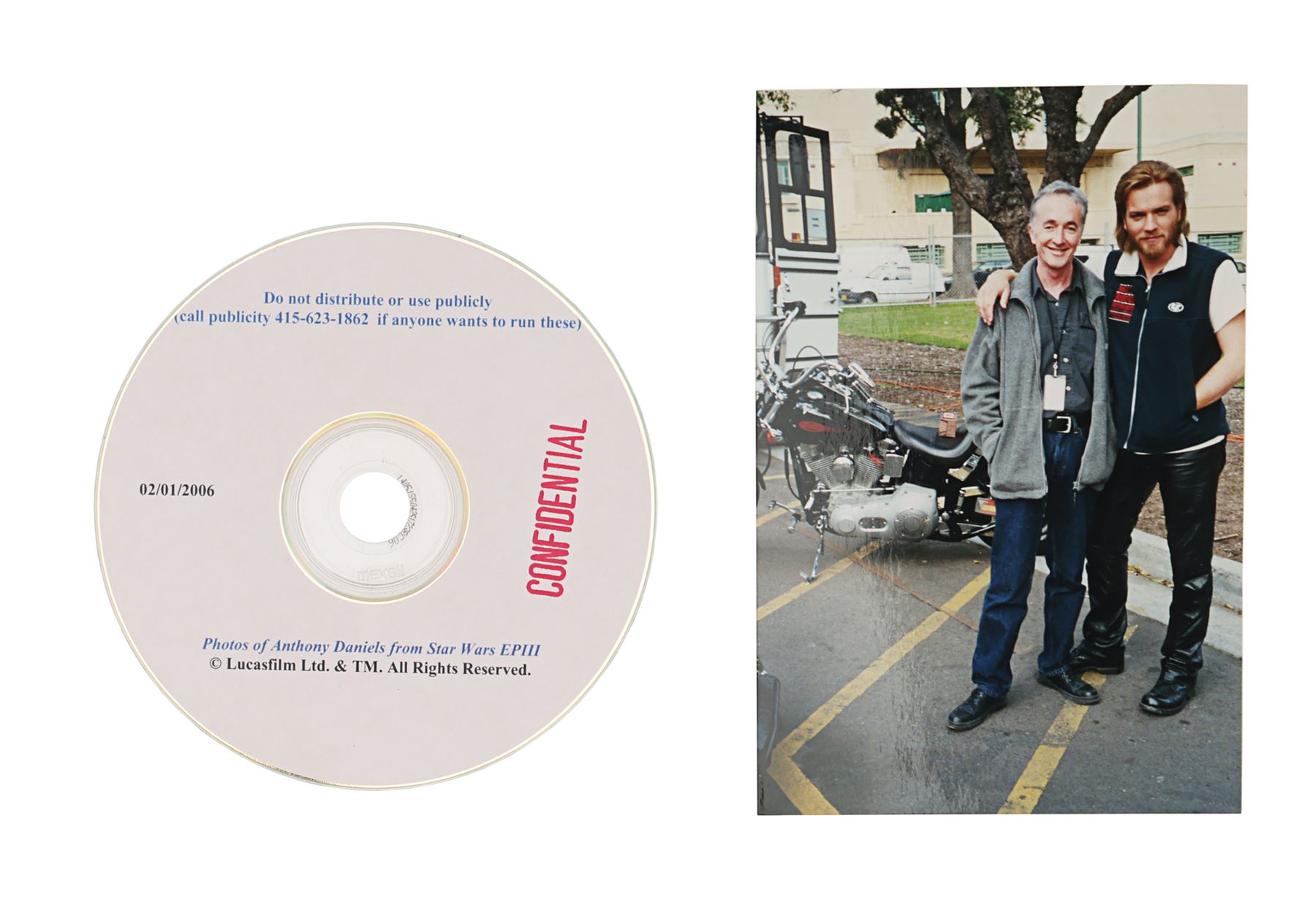 A set of printed contact sheets and a CD storing behind-the-scenes, on set and SFX photos from the production of George Lucas' Star Wars: Revenge of the Sith. The CD contains 206 photographs from behind-the-scenes of the production, as well as on set, SFX and promotional photos. Each photo is printed onto the contact sheet and the lot is also accompanied by a photo of Anthony Daniels and Ewan McGregor, and Daniels with Christopher Lee, Rick Berman, Ian McDiarmid and Hayden Christensen. Dimensions (contact sheets): 28 cm x 22 cm (11" x 8 3/4")