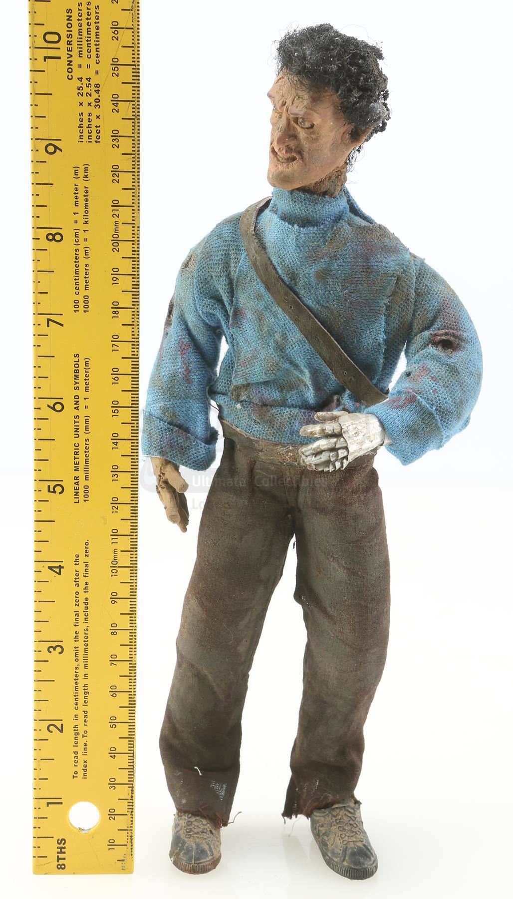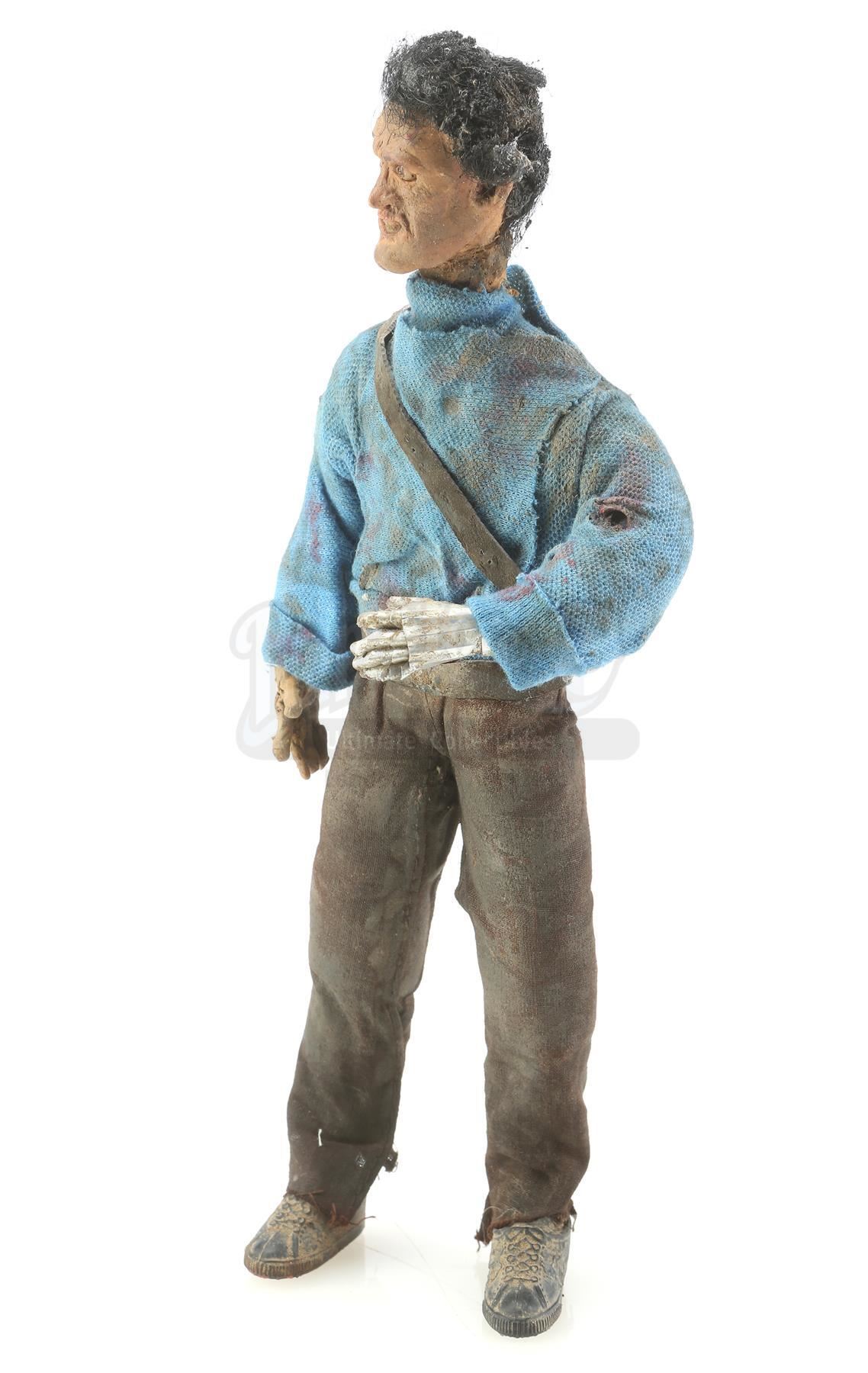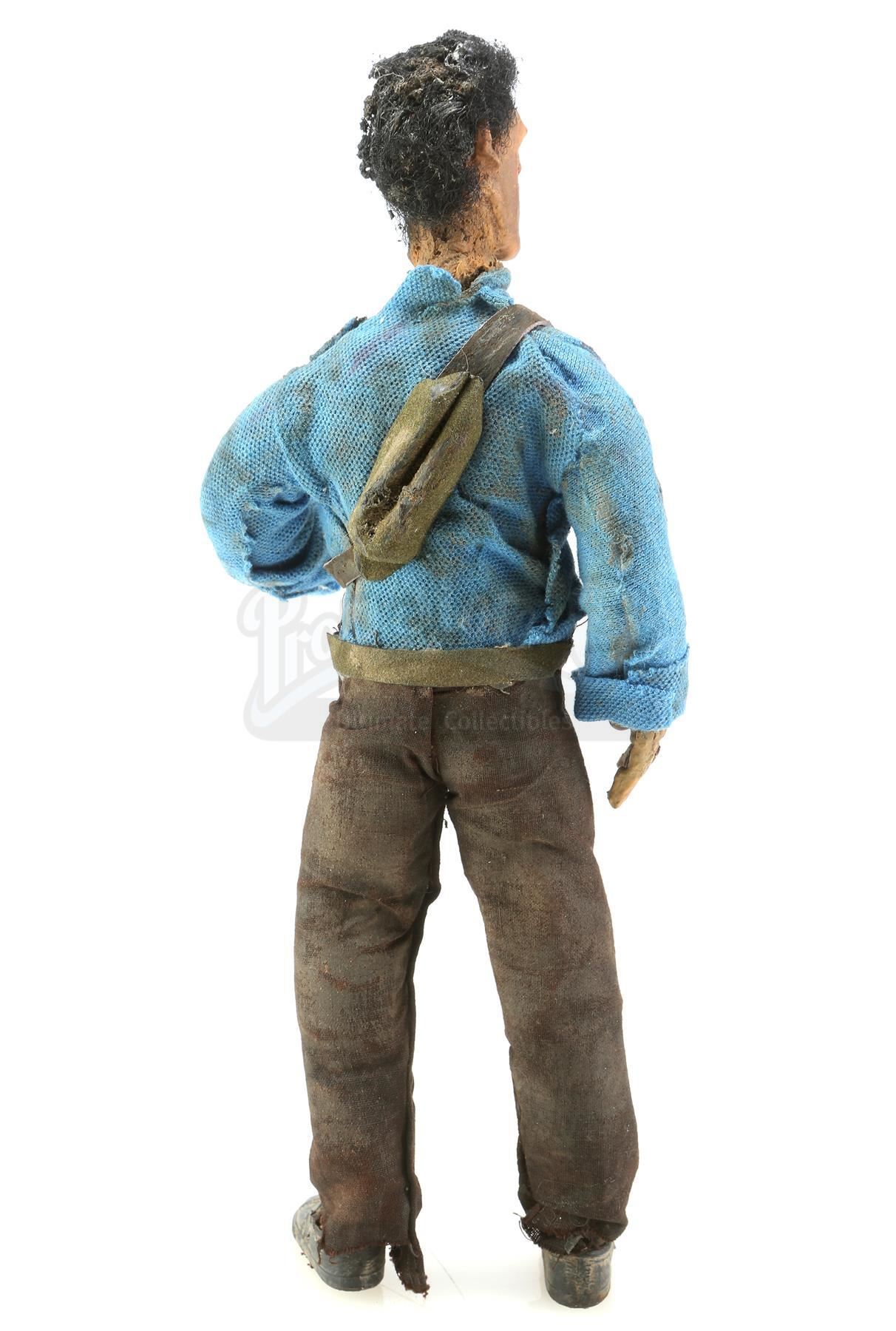 This puppet miniature is rendered in Ash's likeness with a hand-painted clay face, a foam-padded body molded around an inner armature and affixed with faux hair, a metallic left hand, and a hand-tailored costume, including a leather shoulder satchel, a blue fabric tunic, brown cotton pants, and black rubber shoes. The puppet exhibits intentional distressing from production, including tears, blood stains, and applied grime throughout, but it remains in fair overall condition. Dimensions: 4" x 4 1/2" x 11" (10.25 cm x 11.5 cm x 28 cm)