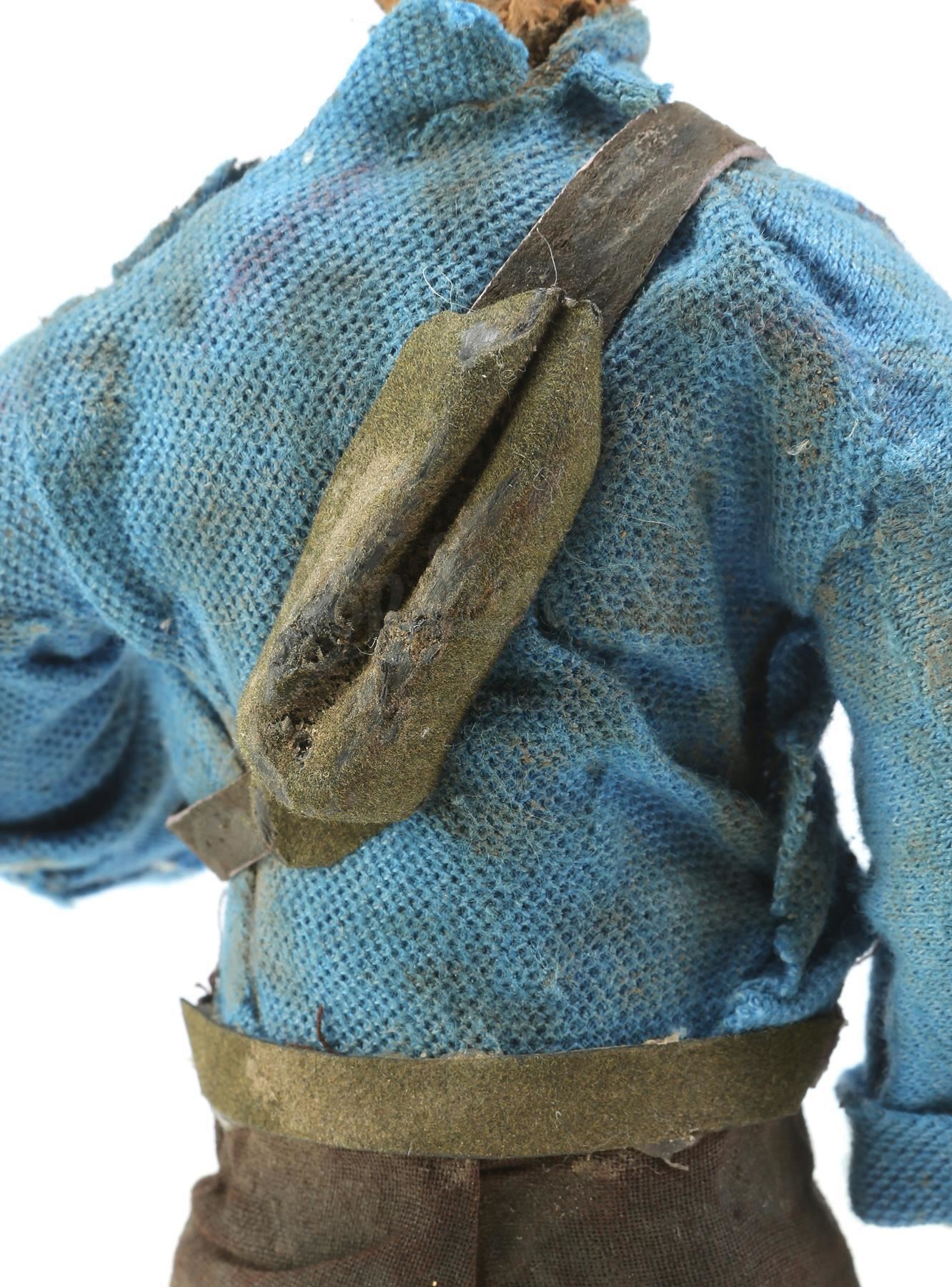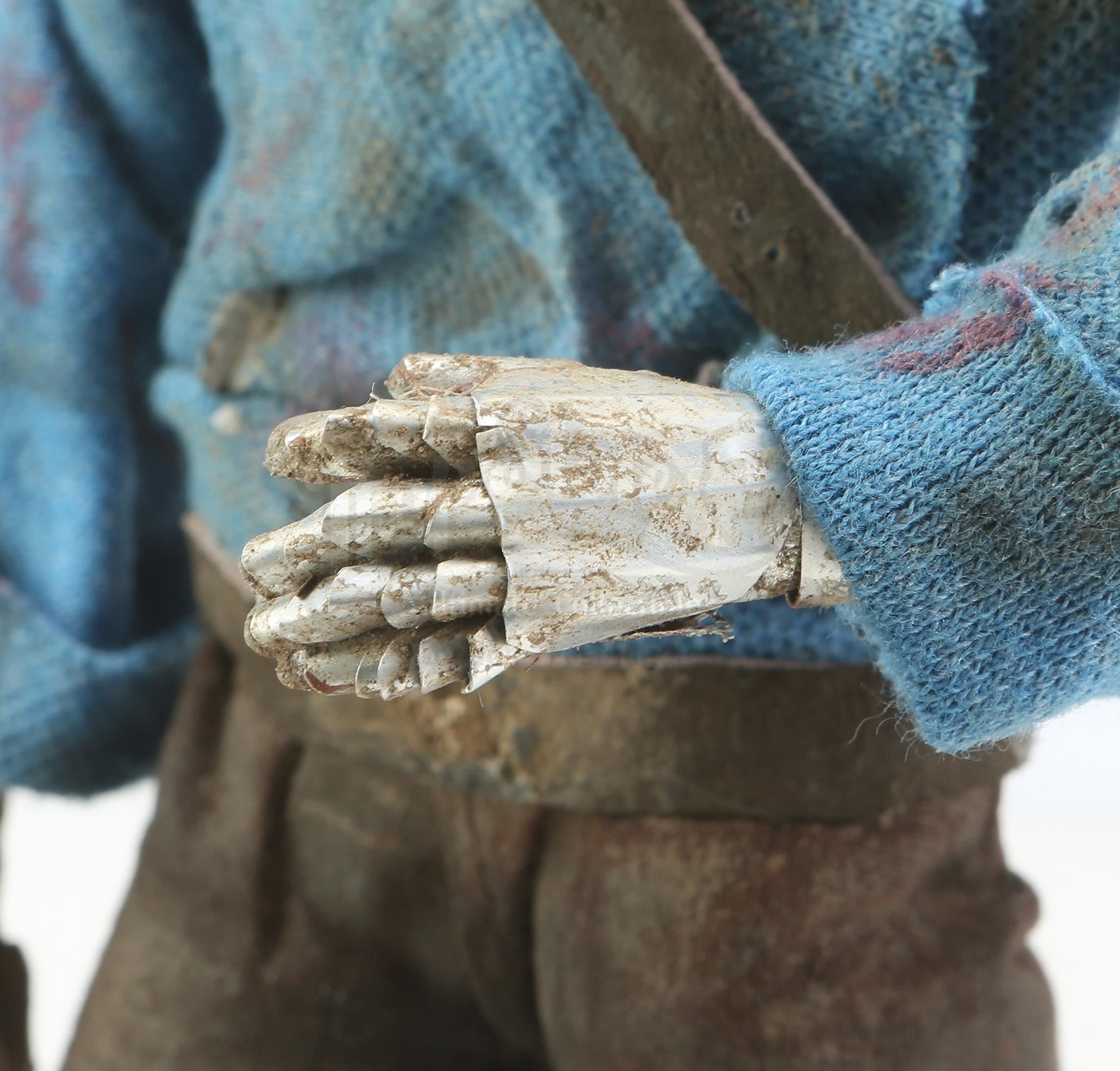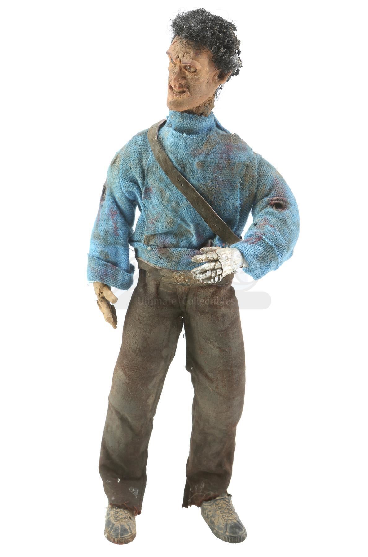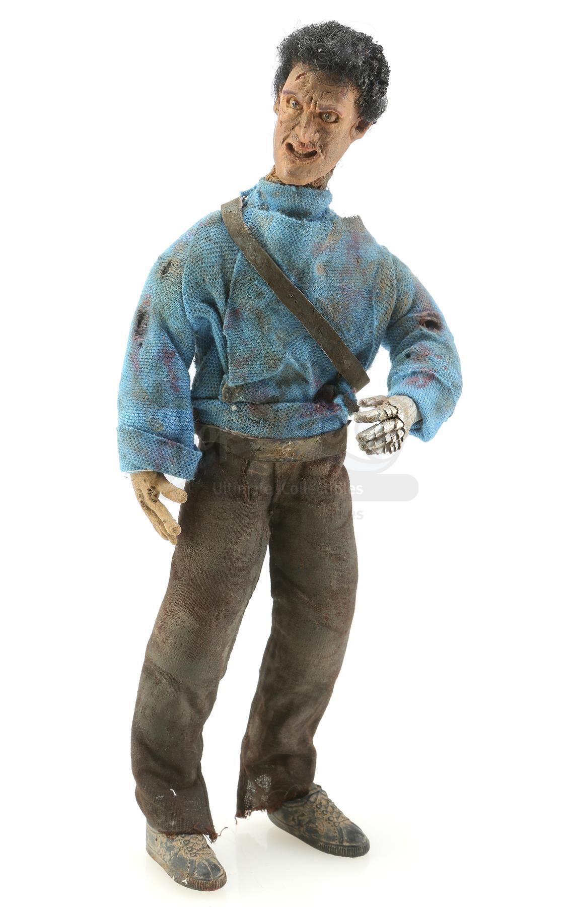 This puppet miniature is rendered in Ash's likeness with a hand-painted clay face, a foam-padded body molded around an inner armature and affixed with faux hair, a metallic left hand, and a hand-tailored costume, including a leather shoulder satchel, a blue fabric tunic, brown cotton pants, and black rubber shoes. The puppet exhibits intentional distressing from production, including tears, blood stains, and applied grime throughout, but it remains in fair overall condition. Dimensions: 4" x 4 1/2" x 11" (10.25 cm x 11.5 cm x 28 cm)