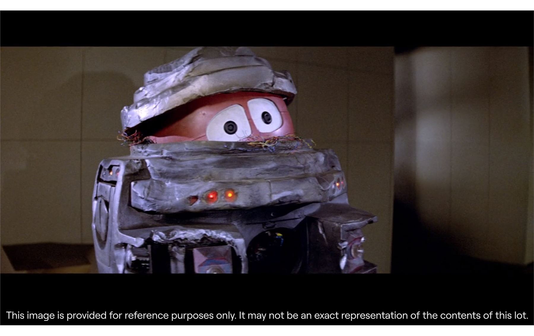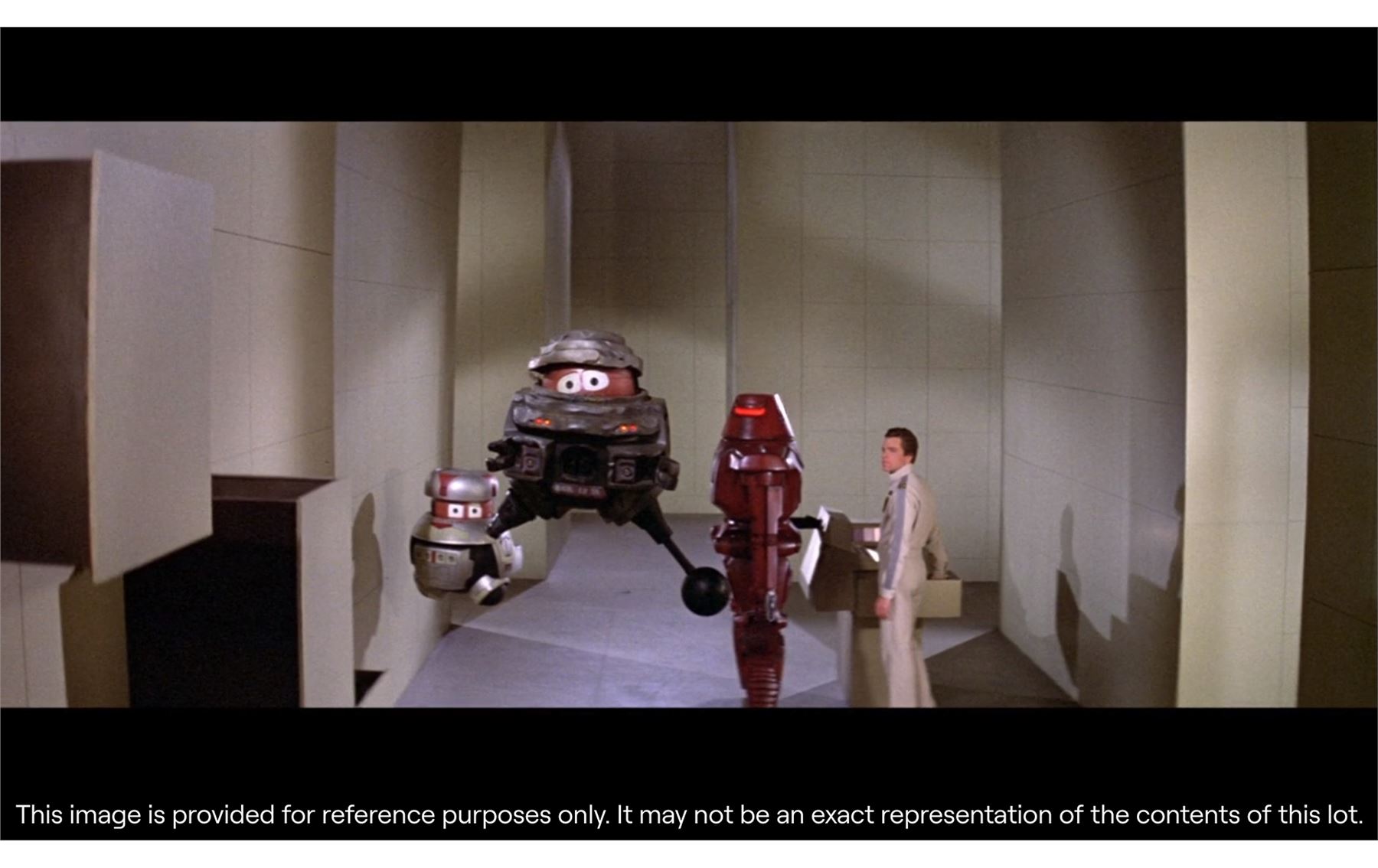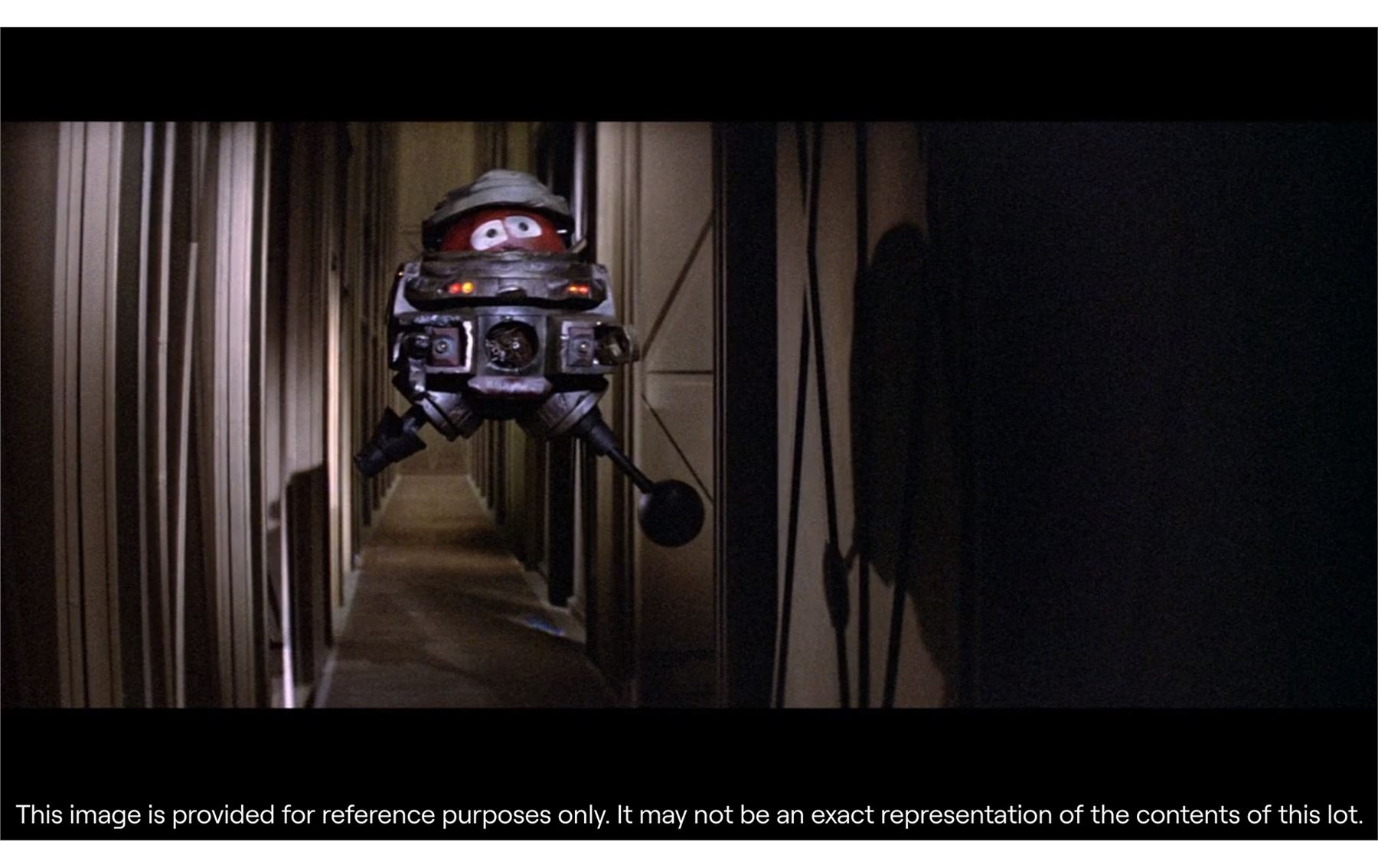 The piece is presented on a display stand with the film's title at the base and a pole inserted into the same aperture that was used by the production team for filming. The miniature is intentionally distressed to reflect the years of abuse that B.O.B. suffered, as well as the damage inflicted by Dr Hans Reinhardt's (Maximilian Schell) other robots during the film's climax. This includes exposed wiring, dented casing and a missing leg. The lot exhibits additional signs of wear from production use and age, including scuff marks and loss of paint, but it remains in good overall condition. Dimensions: 42 cm x 28 cm x 20 cm (16 1/2" x 11" x 8")