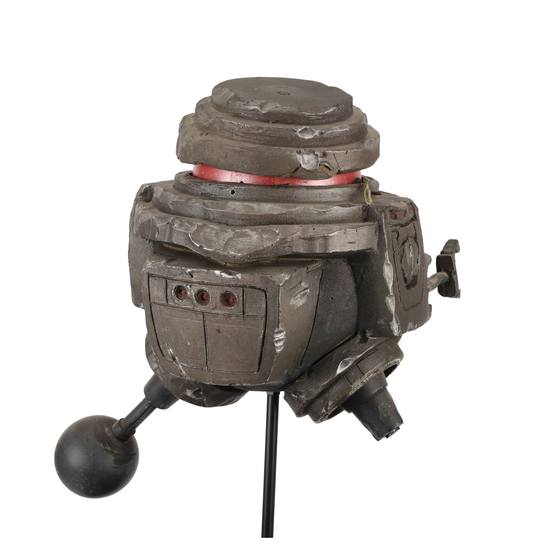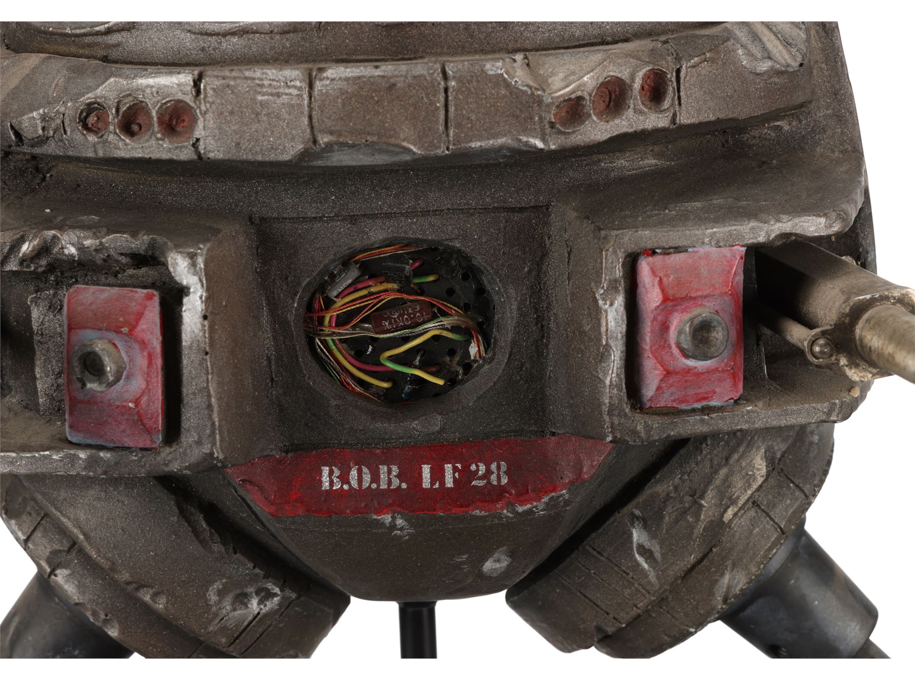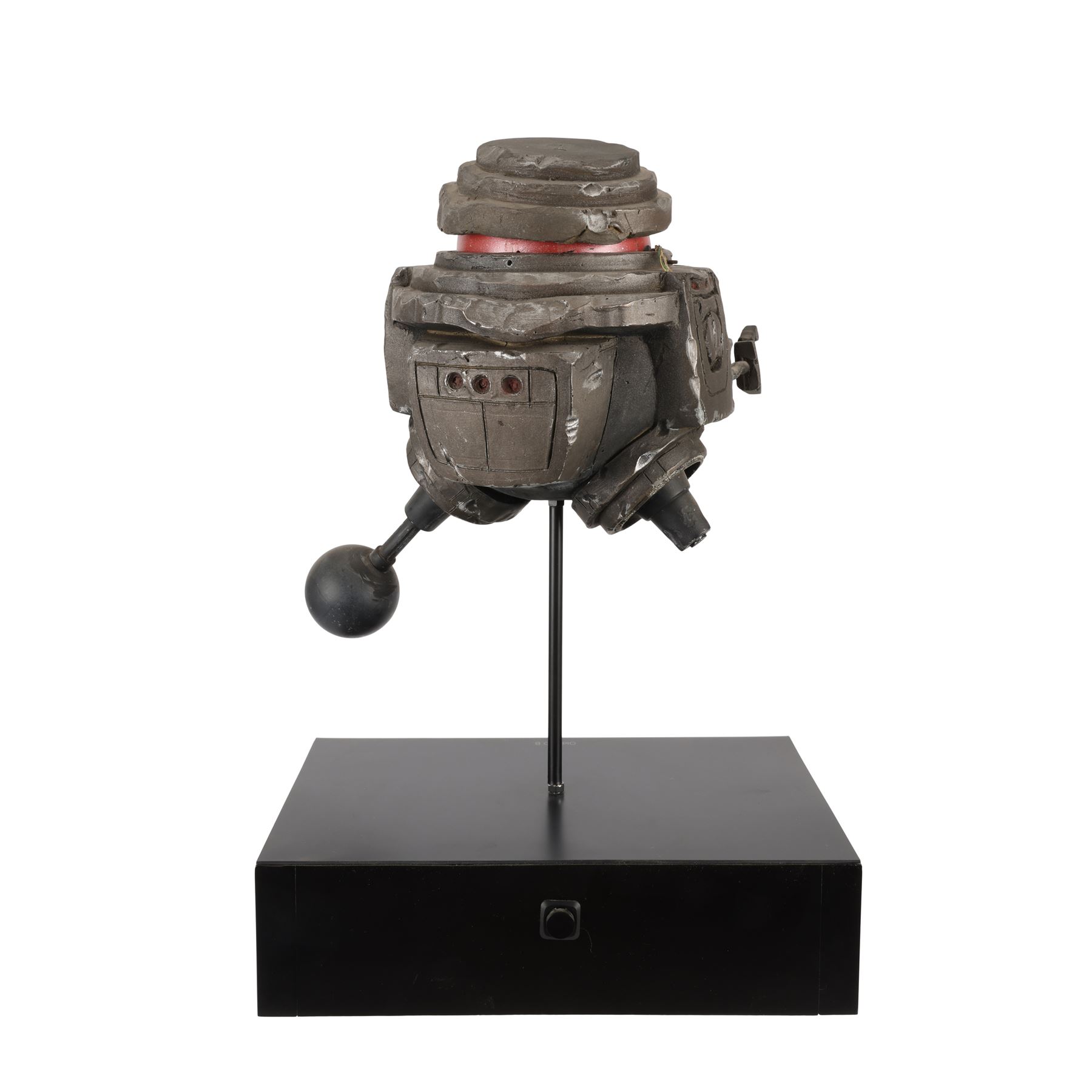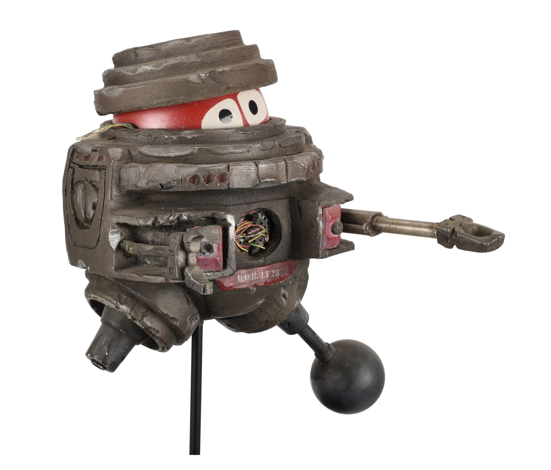 The piece is presented on a display stand with the film's title at the base and a pole inserted into the same aperture that was used by the production team for filming. The miniature is intentionally distressed to reflect the years of abuse that B.O.B. suffered, as well as the damage inflicted by Dr Hans Reinhardt's (Maximilian Schell) other robots during the film's climax. This includes exposed wiring, dented casing and a missing leg. The lot exhibits additional signs of wear from production use and age, including scuff marks and loss of paint, but it remains in good overall condition. Dimensions: 42 cm x 28 cm x 20 cm (16 1/2" x 11" x 8")