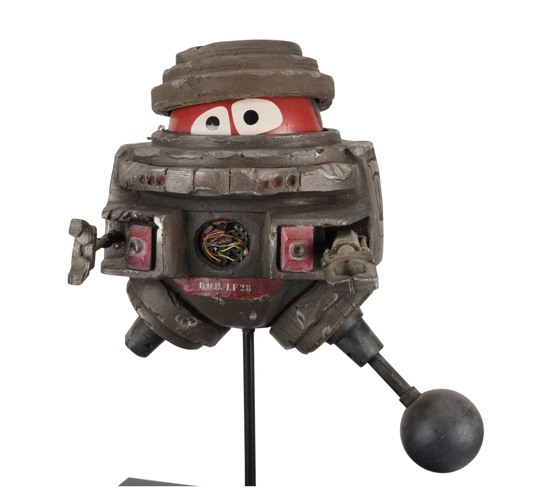 This filming miniature is carefully crafted to resemble the full-scale model. Made of resin, it is expertly painted red, grey and black. It features a barrel-shaped torso, arm and leg appendages, a spherical head and a flat headpiece. Bulb casing is depicted around the torso, and the robot's familiar despondent eyes are painted on the head. The name "B.O.B. LF 23" is stencilled in white at the front.