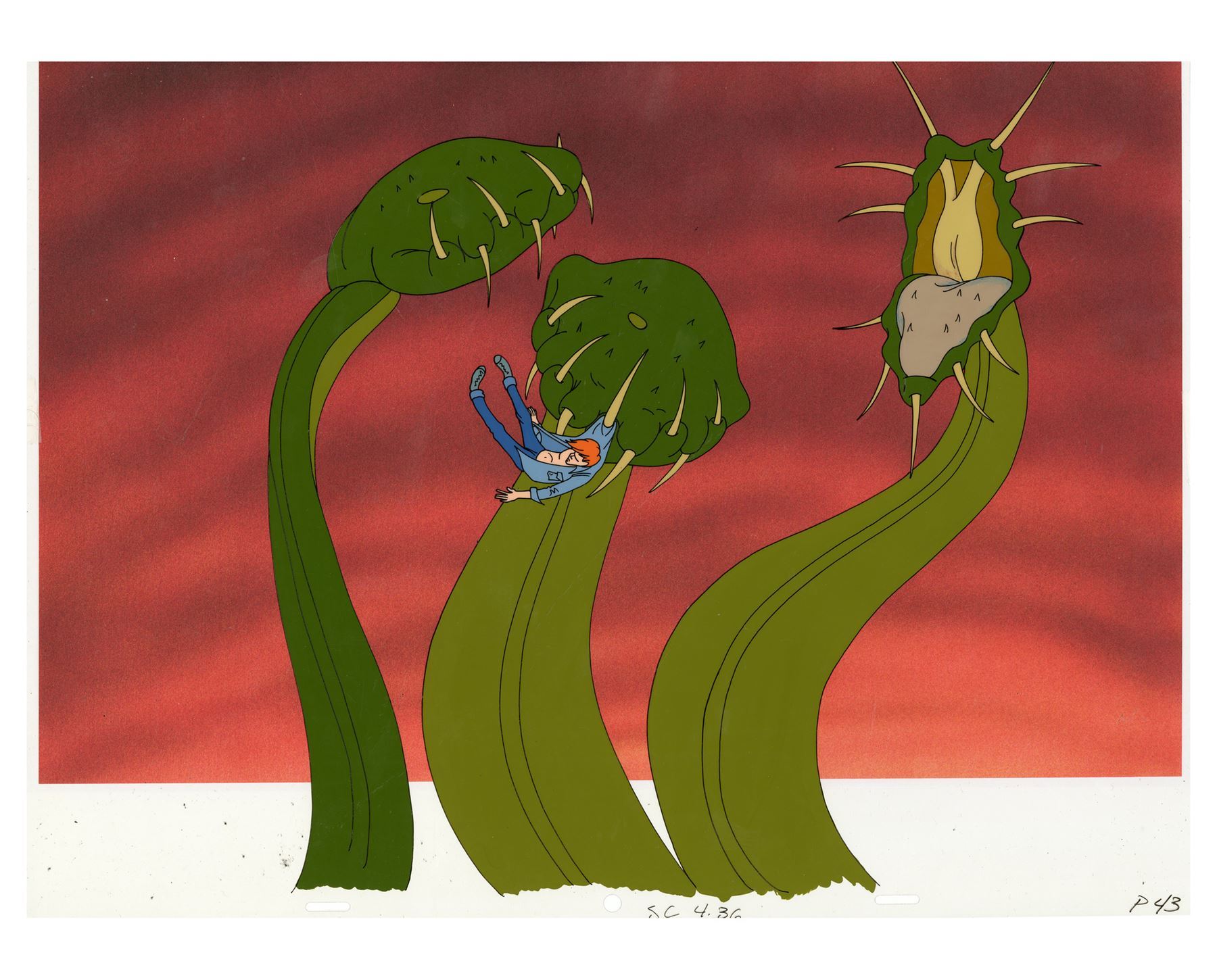 This hand-painted acetate cel features green-color plants with yellow teeth, swinging around a bully by his shirt. The cel is marked "SC 4.36" and "P 43" and taped to a red-color printed background. This lot exhibits a paper residue on the back of the cel. Dimensions: 17" x 13.5" (43.25 cm x 34.5 cm)