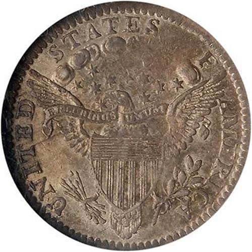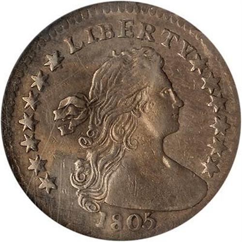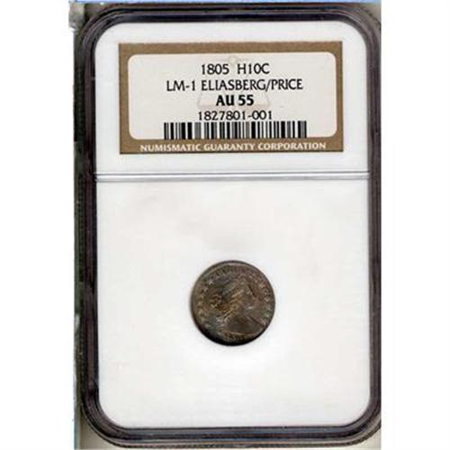 1805 Draped Bust Half Dime. LM-1 Eliasberg/Price. Only one die marriage is known for this rare, early half dime, representing 75-100 examples, most of which are VF or less. This is one of the handsomest as well as finest pieces known and has represented this date in two of the finest collections formed in the last hundred years. The 1805 is generally thought to be the second scarcest issue of this short-lived Heraldic Eagle type, and is similar in rarity to the 1801. One of the characteristics of the 1805 date is that localized weakness is seen on all specimens. On this specimen, the bust is completely flat and the O in OF is not visible. The gray-rose surfaces show a darker patch of color on the left side of the obverse, and there are a few light abrasions noted on each side. Of the 1805 half dimes that have been certified, only six have been graded higher than this piece, and only one is better than AU58 (the Kenny Goldman certified MS64). NGC serial #1827801-001. (#4272)<p><i>Ex: Eliasberg I (Bowers and Merena, 5/96), lot 907, where it brought $10,780.</i>