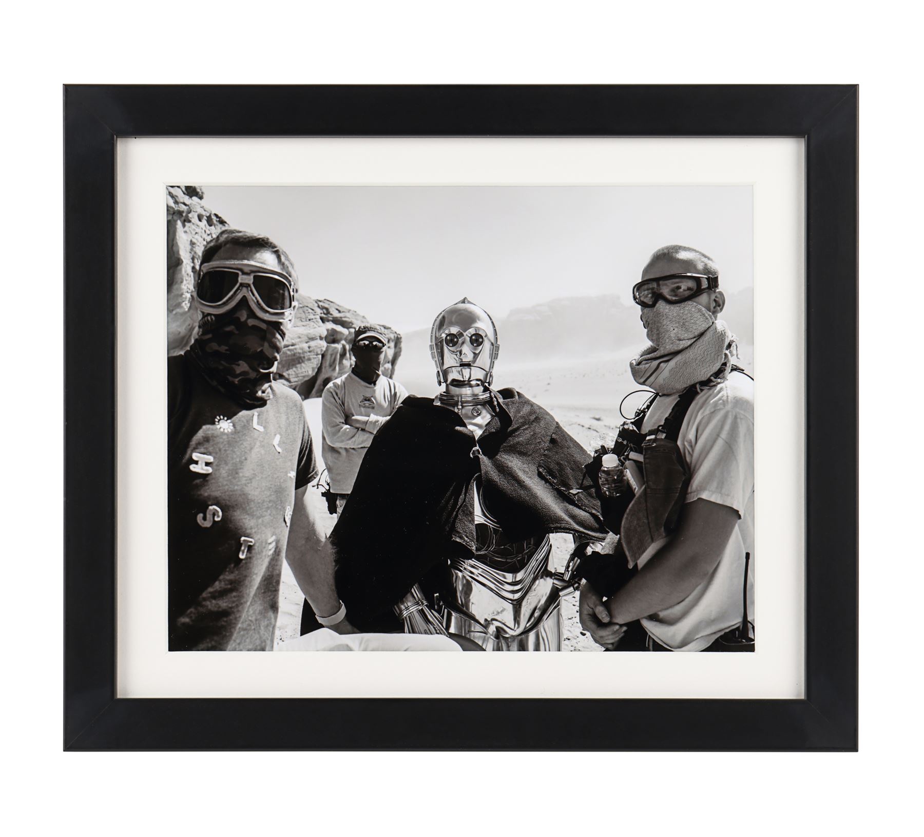 The framed black-and-white photograph features Anthony Daniels on location and in costume as C-3PO, draped in a black blanket and flanked by three crewmembers. The photograph is mounted in a black frame with metal wire on the back for wall hanging. Dimensions: 29 cm x 34 cm x 2.5 cm (11 1/2" x 13 1/2" x 1")