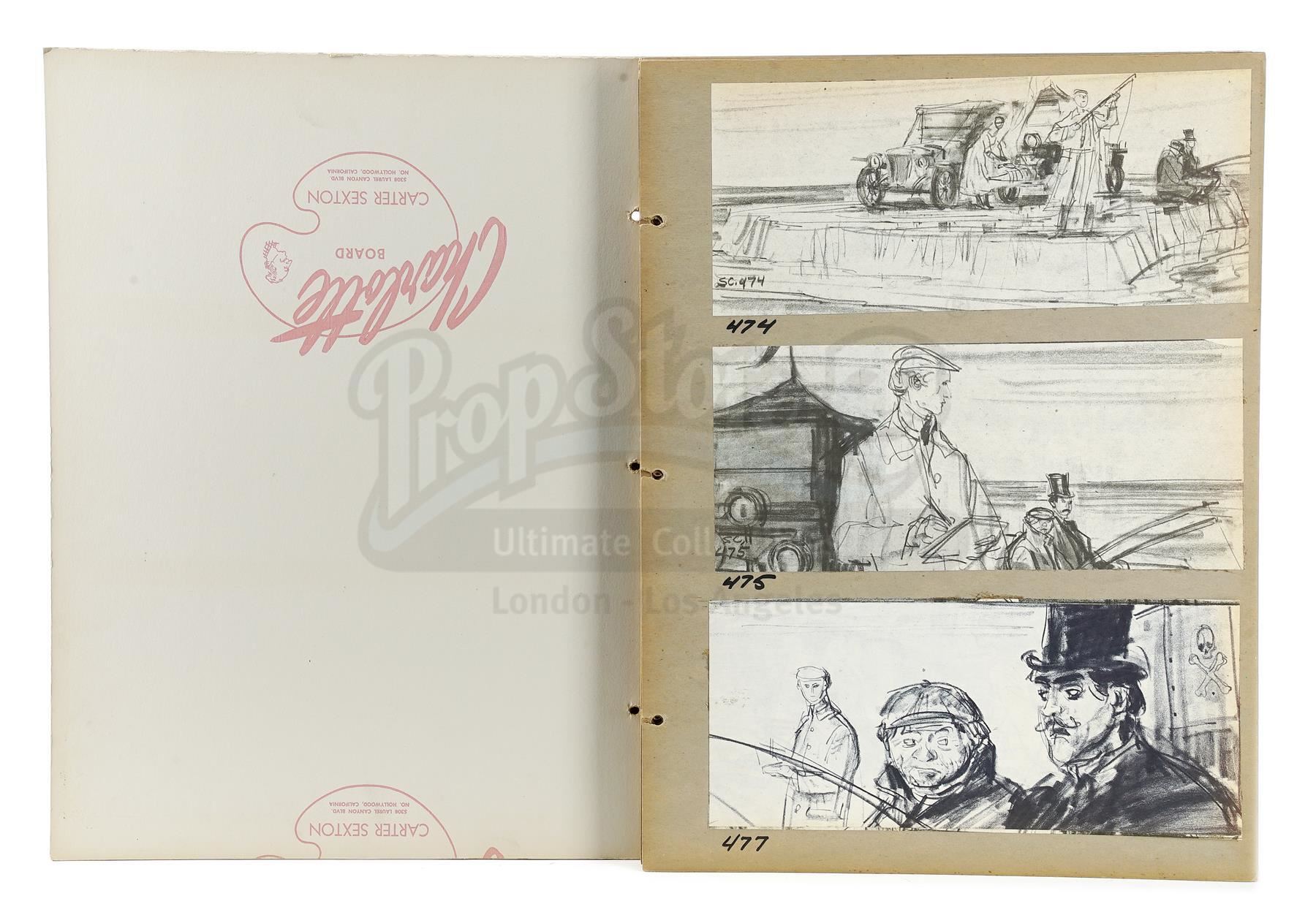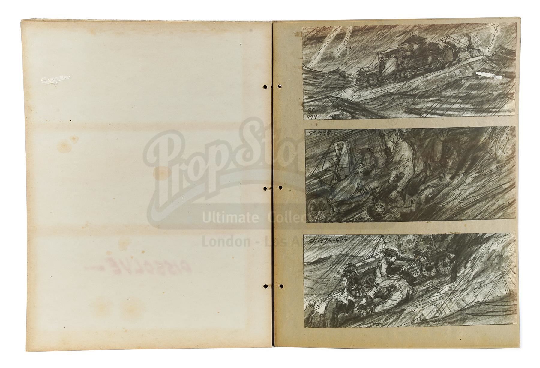 This lot will be auctioned on Wednesday, June 30th. The auction will begin at 9:00am PDT and lots are sold sequentially via live auctioneer; tune in to the live streaming broadcast on auction day to follow the pace. Note other lots in the auction may close on June 29th or July 1st. Storyboards from Blake Edwards' adventure comedy The Great Race. Adventurer The Great Leslie (Tony Curtis) and villainous Professor Fate (Jack Lemmon) competed in a race from New York to Paris. This lot consists of 10 gray pieces of three-hole punched poster board. Each is affixed with hand-drawn, black-and-white storyboards with a cover featuring a card affixed with the film's title. It shows signs of wear from age and use, including some staining, but remains in fair overall condition. Dimensions: 21" x 17" x 1" (53.5 cm x 43.25 cm x 2.5 cm) Sold without copyright; see notice in Buyer's Guide. Estimate: $1,000 - 1,500