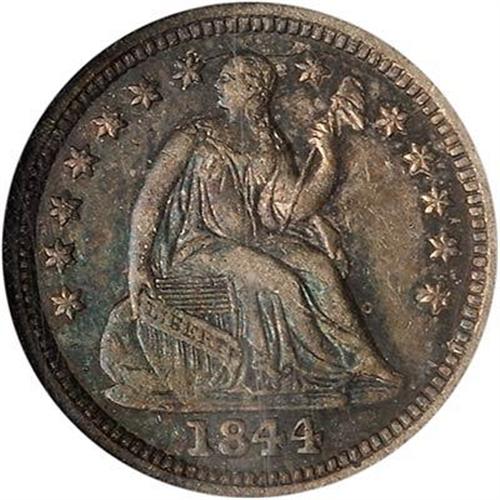 1844-O Liberty Seated Half Dime. One of the scarcer dates in the seated half dime series, and a very difficult issue to find in high grades. The surfaces are choice and attractive with pleasing dark steel gray "antique silver" in the fields which offsets the lighter devices. Mintage: 220,000 but most of these seem to have vanished off the face of the earth. (#4334)