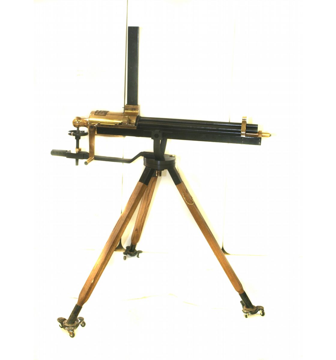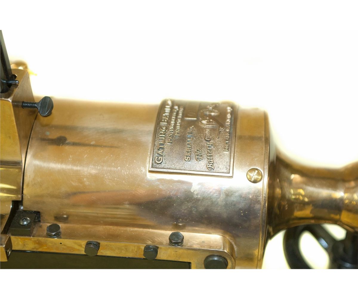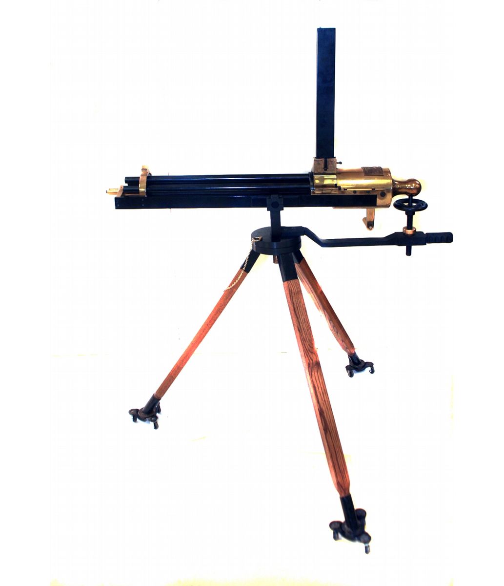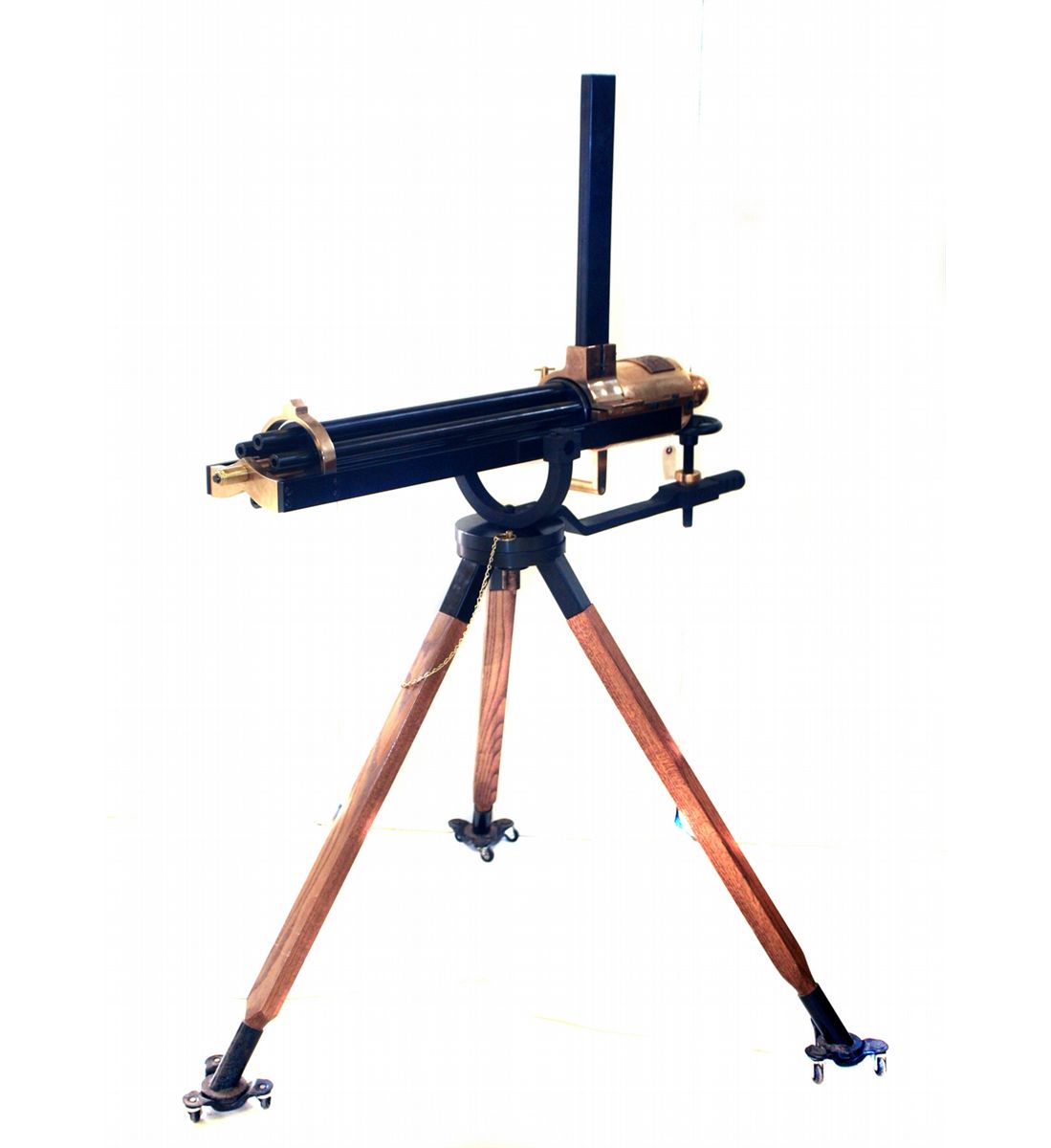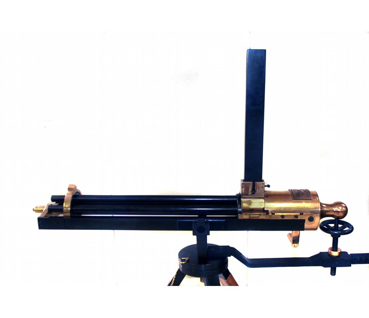 As New condition - Live fire model -The Gatling gun, also known as the battery gun, is a black powder gun that consists of multiple barrels revolving around a central axis and is capable of being fired at a rapid rate. These guns were patented by Richard Gatling and were first used by General Benjamin F. Butler of the Union army at the historic Civil War siege of Petersburg, Virginia, in 1864-1865 - 28" rotating octagon barrels - Test fired only! 99% remaining black powder coated barrels, some thinning - 99% cast bronze, some light small spotting - oak tripod - each leg has 3 rolling casters - front bronze inverted V & rear peep sights - crisp markings - Gatling gun cast into the breech - includes one 20rd mag/20 .45LC chamber, spare firing pins, tools - heavy freight shipping - SN 0141 - est. 4500 - 7000 - FFL - 25VVFKIL021