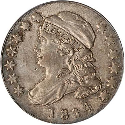 1814 Capped Bust Dime. Small date. JR-1, R.3. This is a scarce variety that is by and large offered in grades up to but no better than Very Fine. Writing in 1984, the John Reich Collectors Society estimated that no more than six Mint State examples of JR-1 are extant. Breen suggests this variety possibly comprised the 34,500 initial delivery of the year. Indeed, PCGS has certified just six Uncirculated specimens, and NGC has seen eleven such coins in Mint condition (10/05). (#4489)